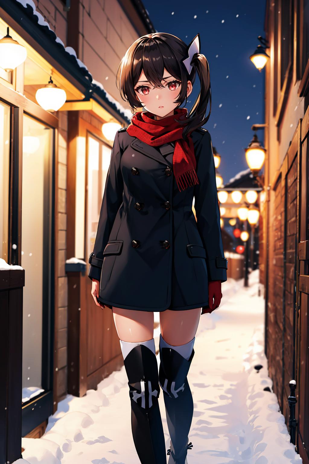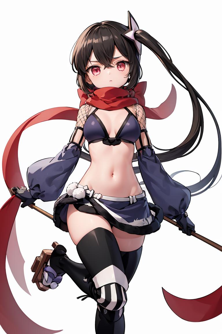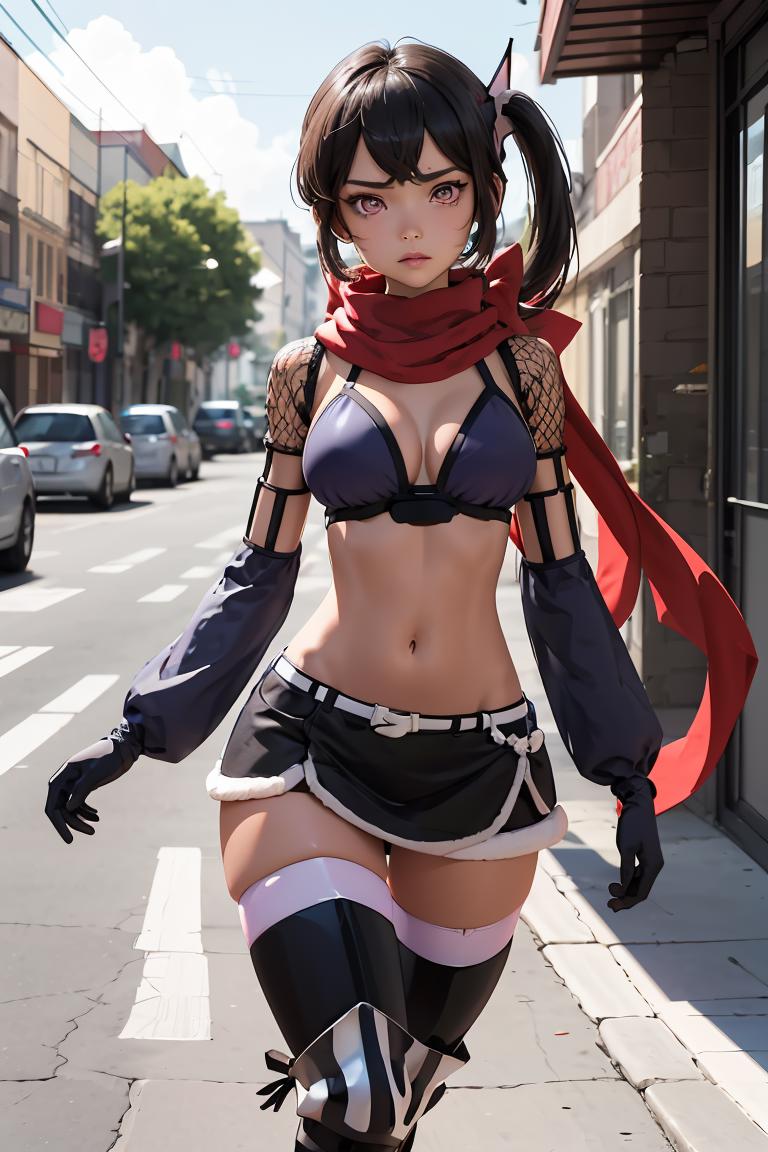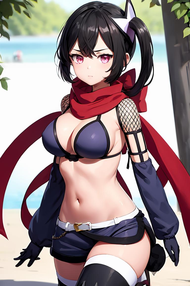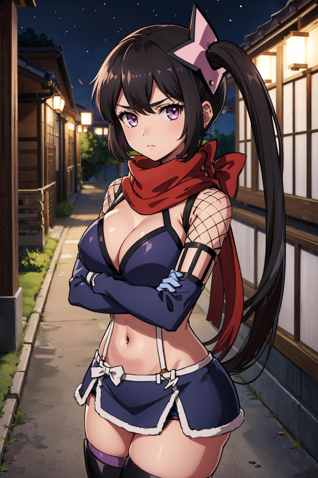 Add "hair ornament, side ponytail, red scarf, bikini top, purple miniskirt, detached sleeves, fishnets, gloves, thighhighs" for her typical look.