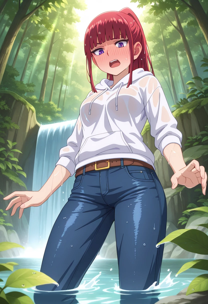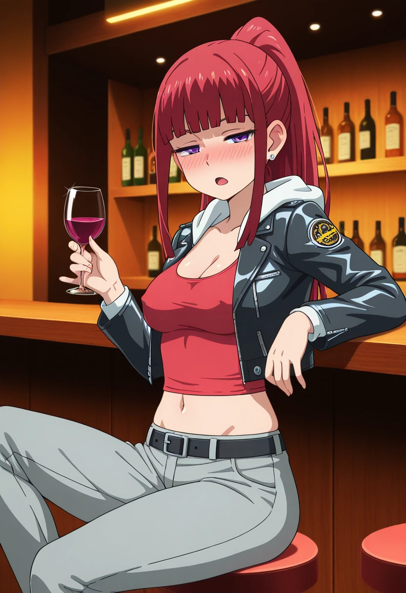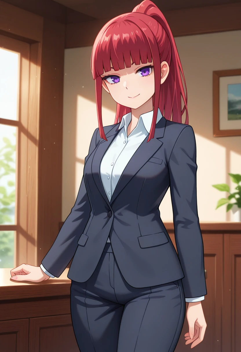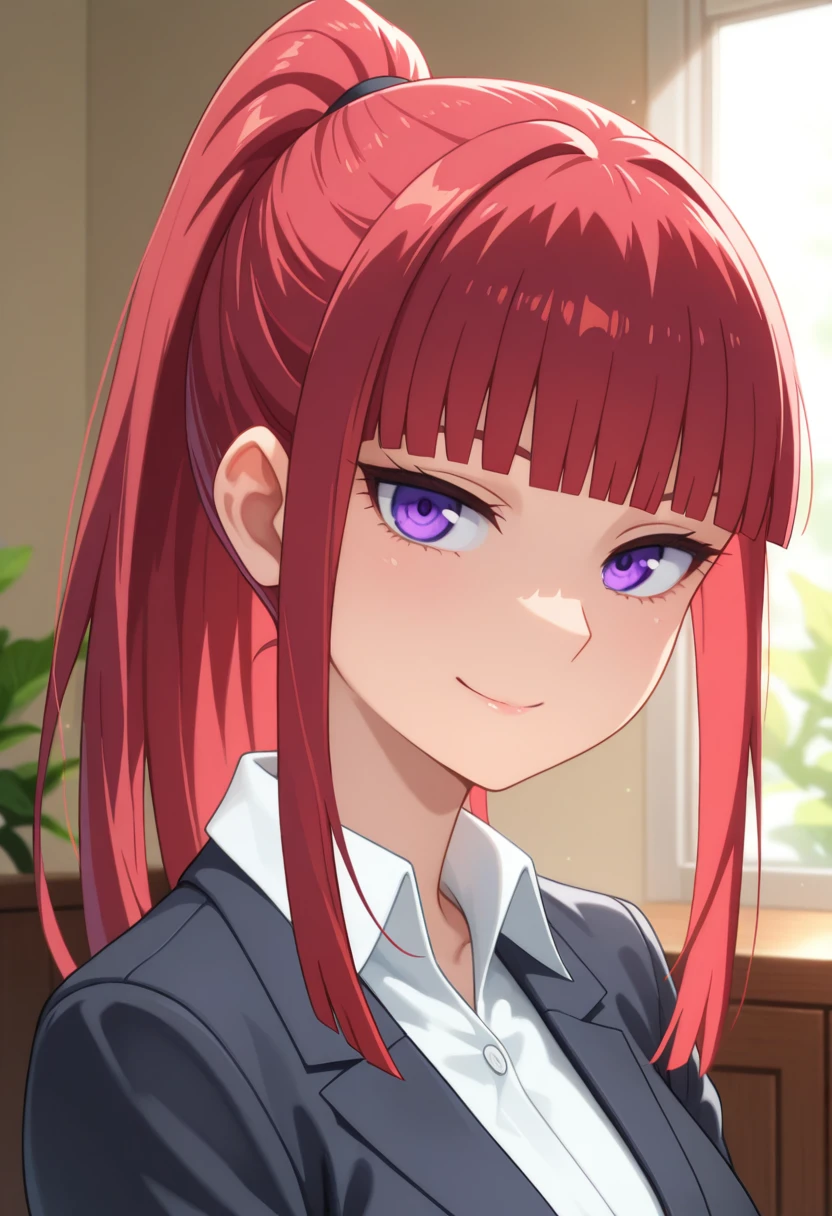 benikaww, mature female, purple eyes, red hair, long hair, ponytail, blunt bangs, sidelocks,
