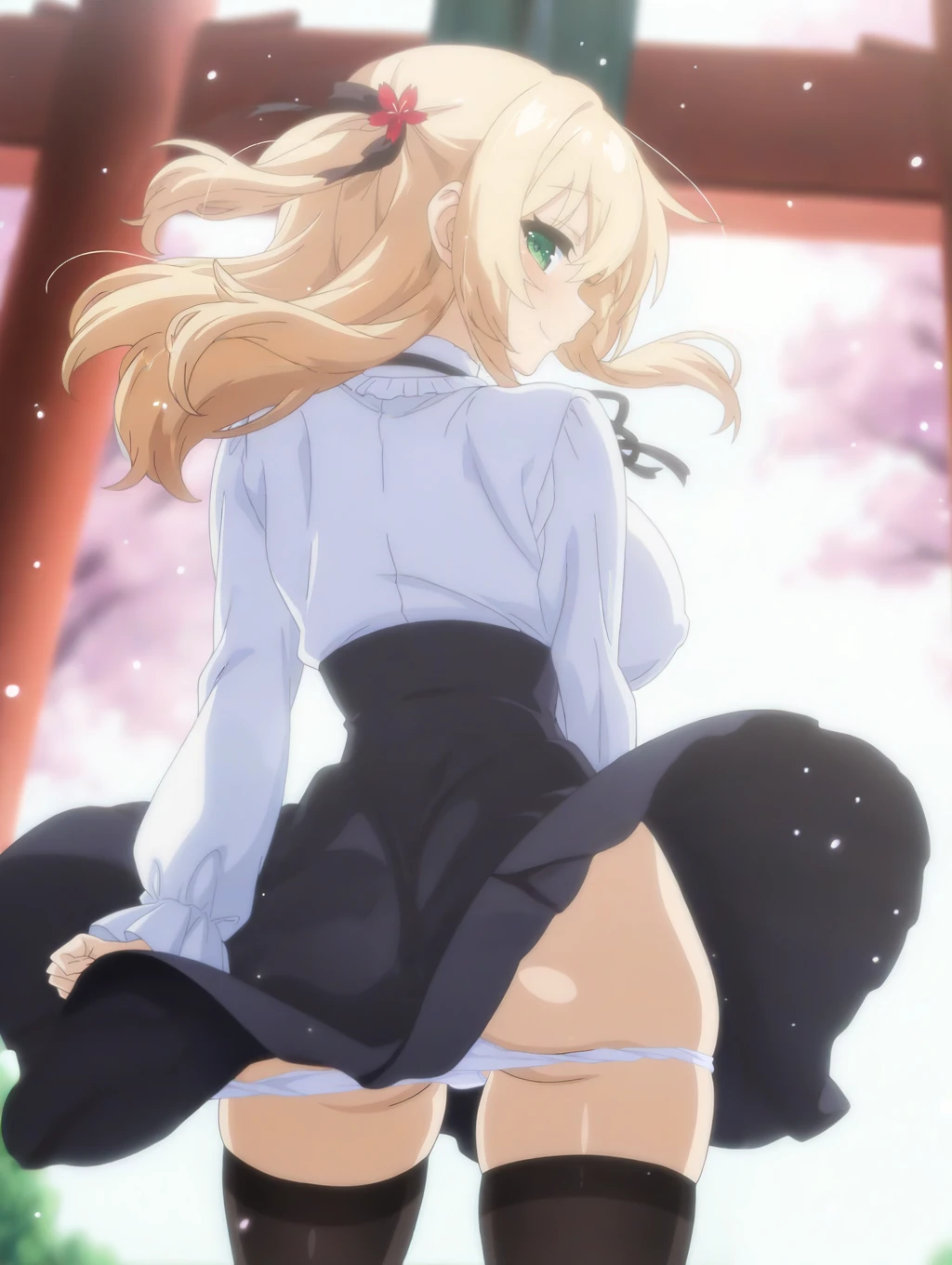 to_ui, blonde hair, green eyes, long hair,large breasts, hair ribbon,black ribbon,shirt,meme attire,virgin killer outfit,skirt,thighhighs, (neckneck ribbon), red ribbon