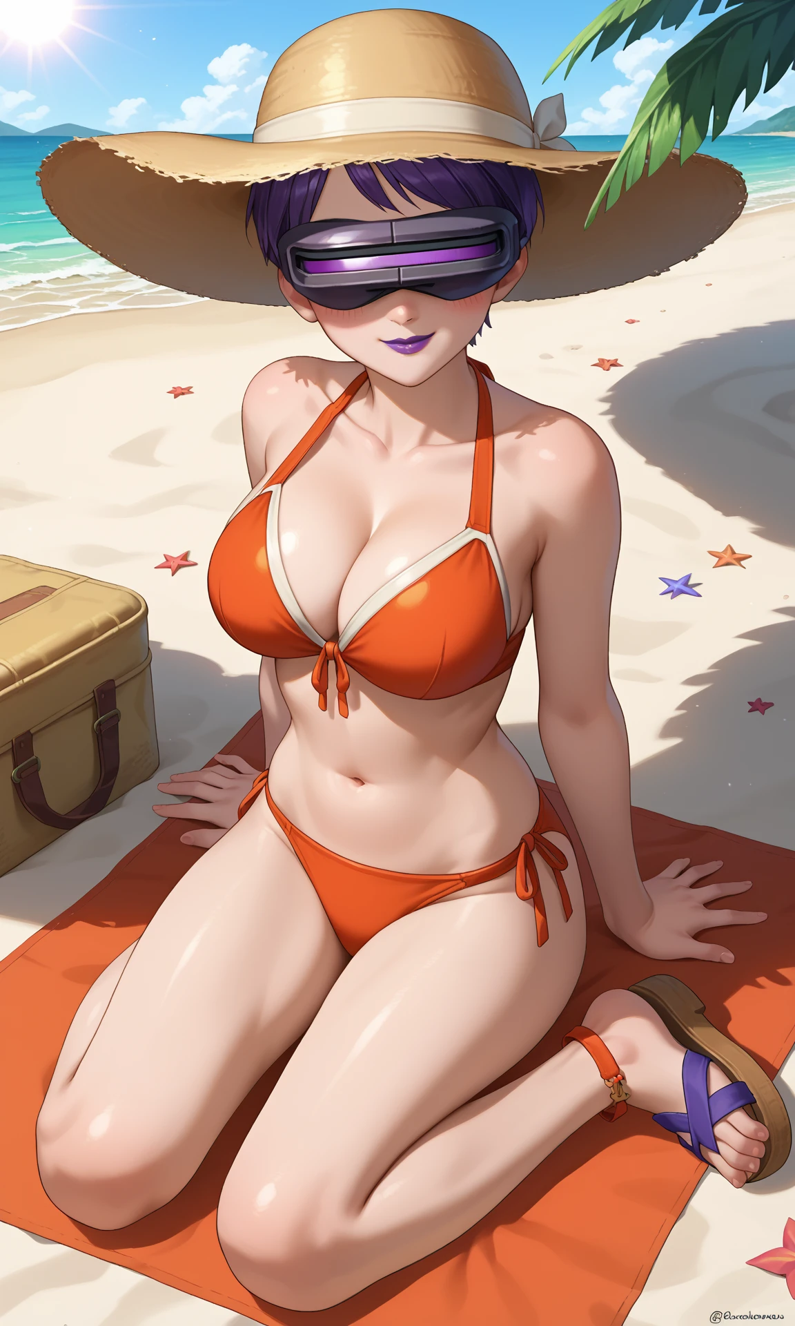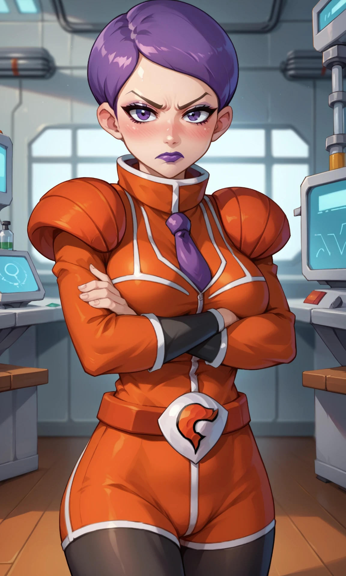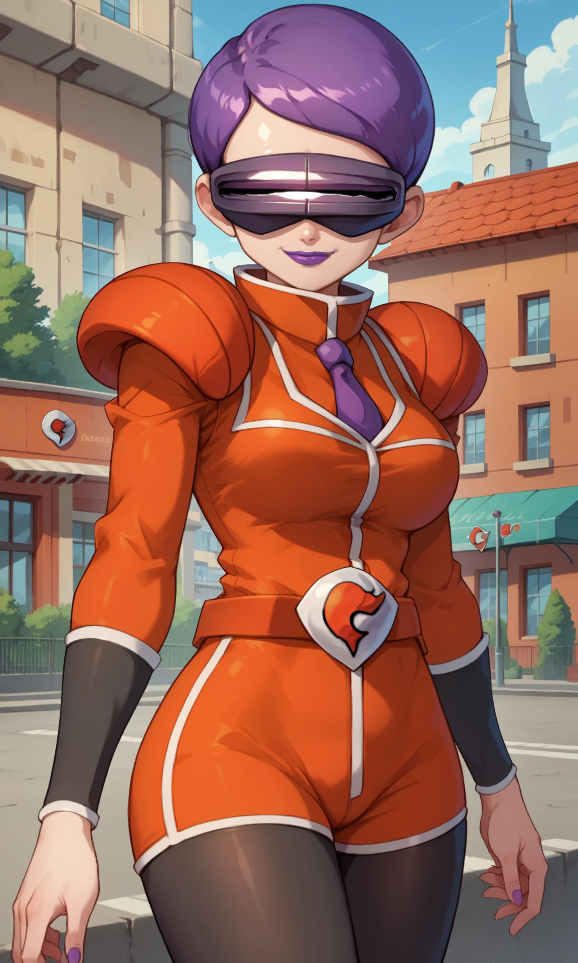 [Default Outfit]: purple hair, very short hair, purple lips, head-mounted display, orange suit, long sleeves, orange taut shorts, shoulder pads, purple necktie, belt, team flare, bracers, pantyhose, pantyhose under shorts, orange boots