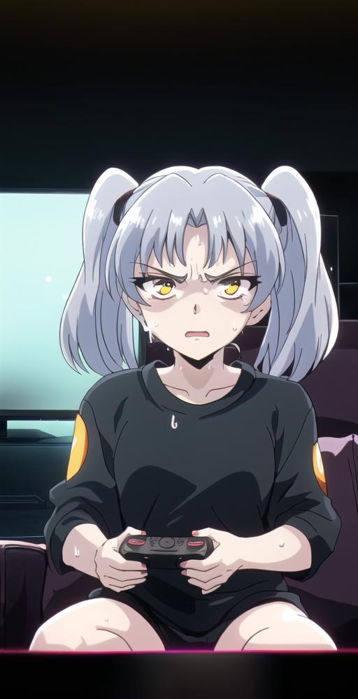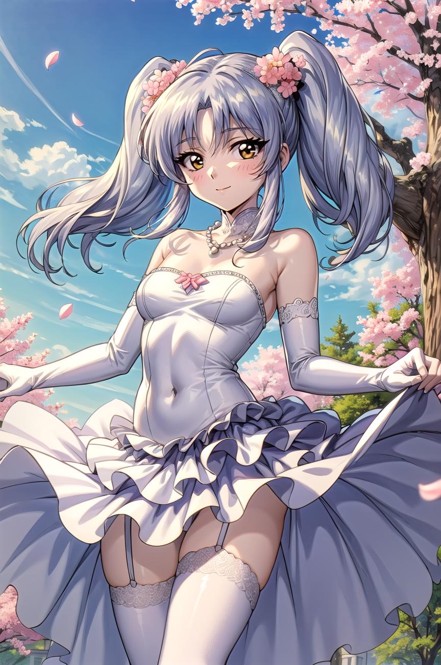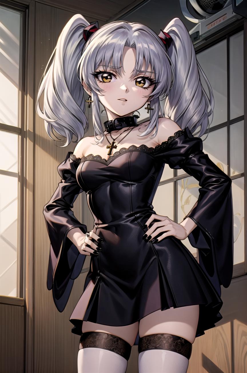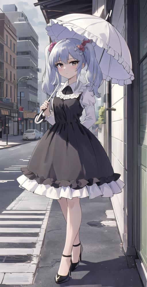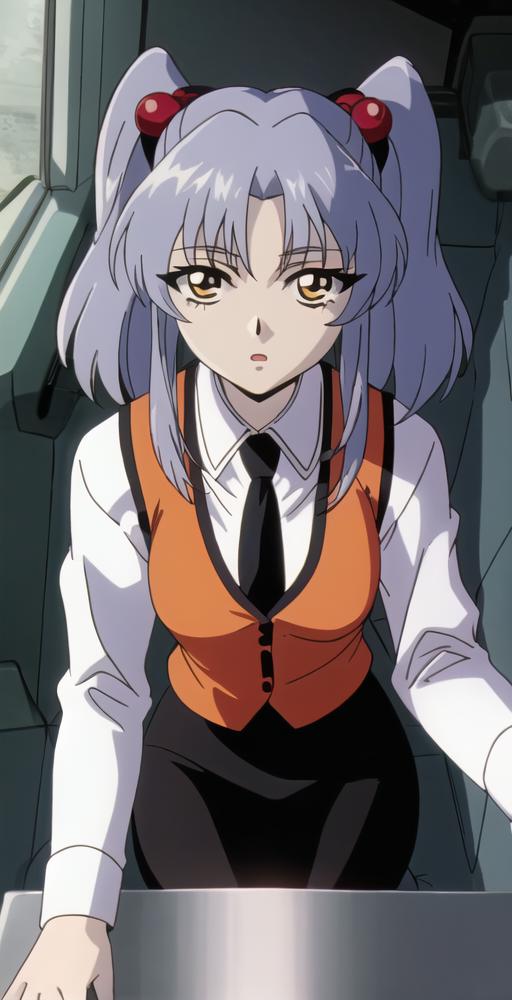 Main outfit, "twintails, hair ornament, long sleeves, white shirt, necktie, collared shirt, orange vest, black skirt,"