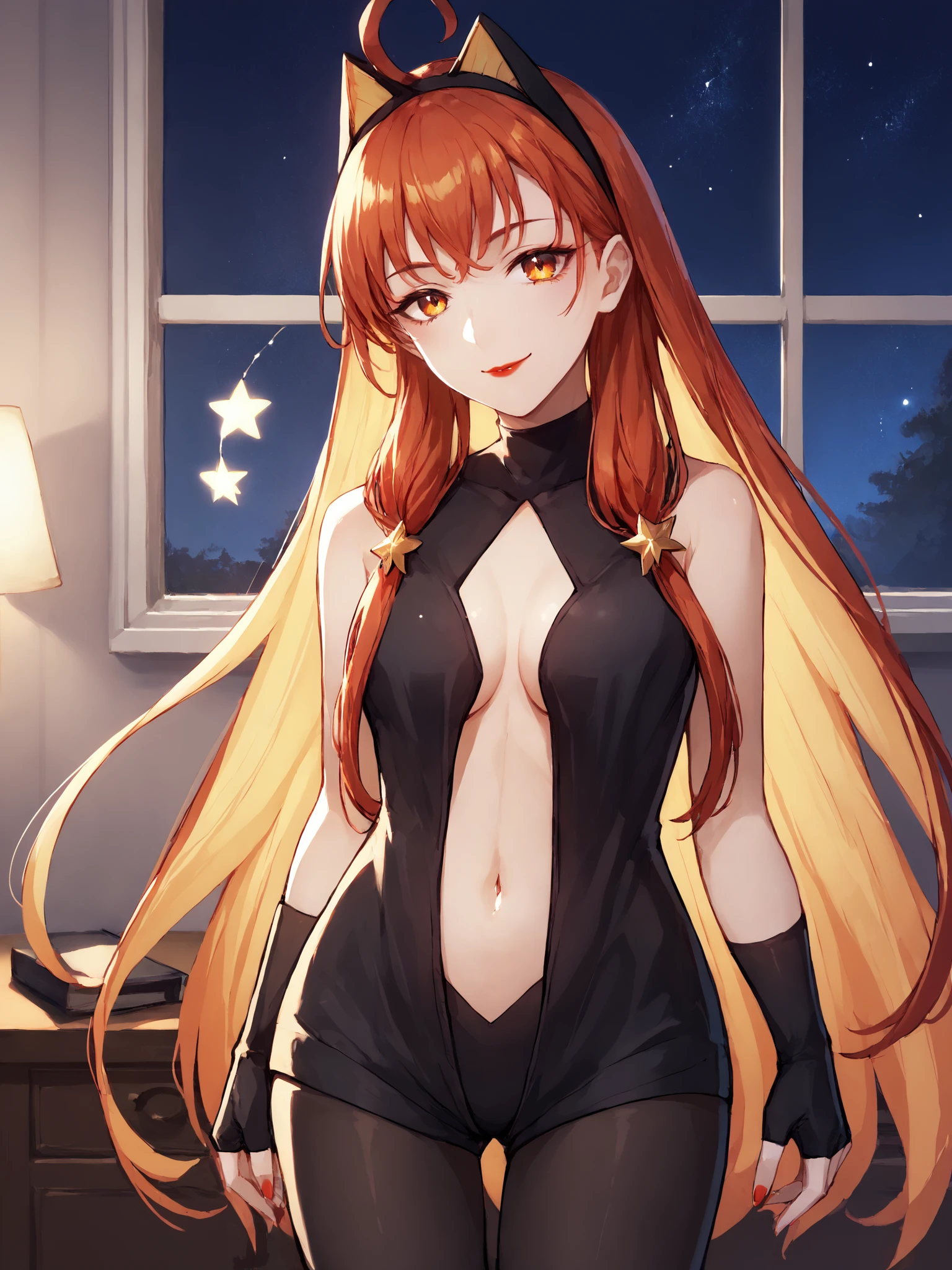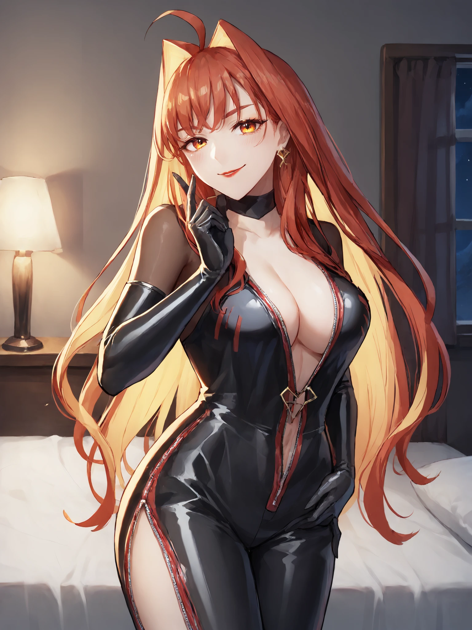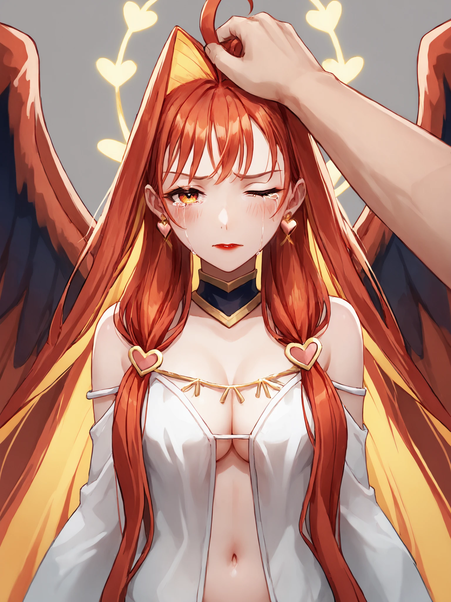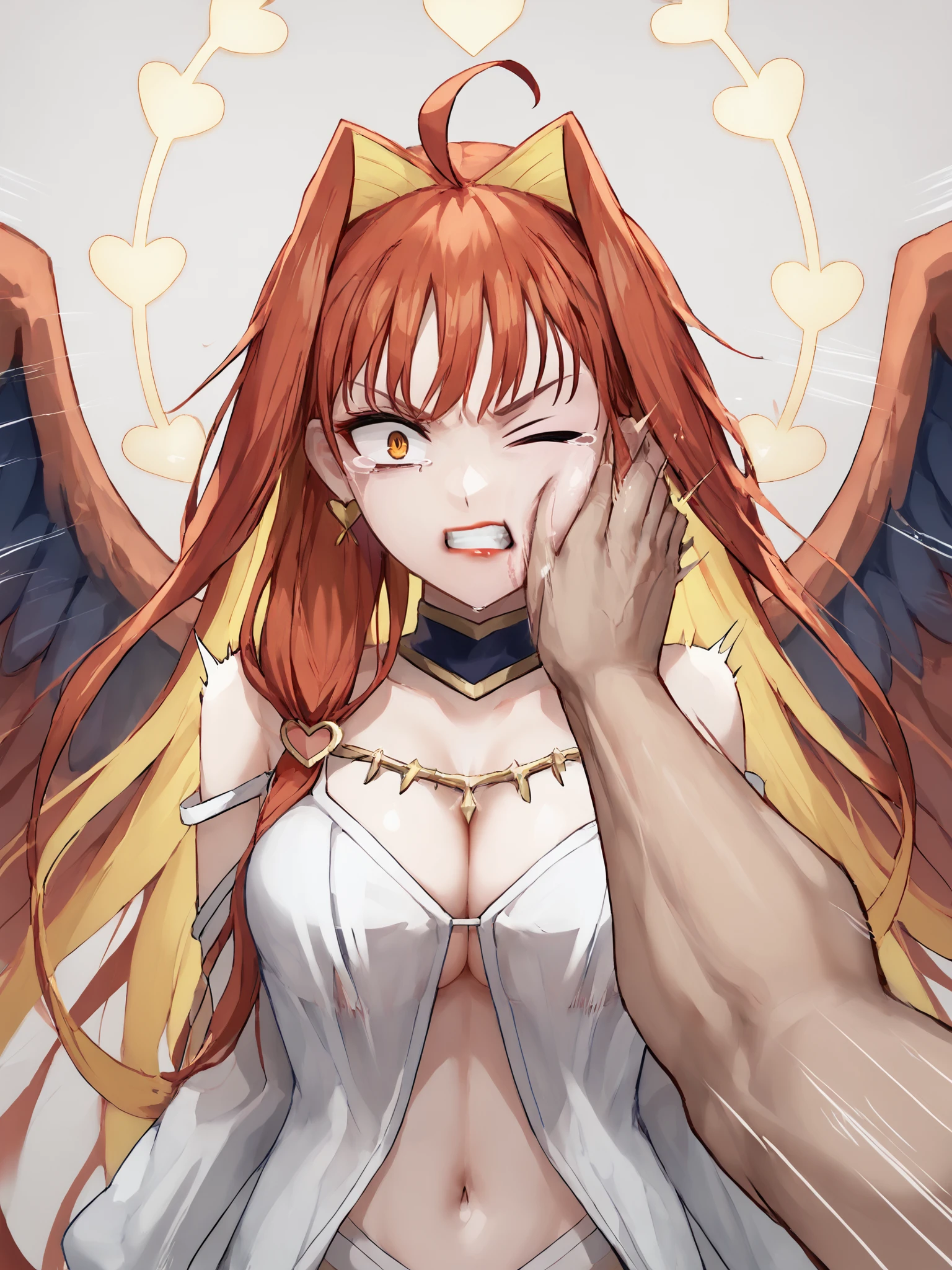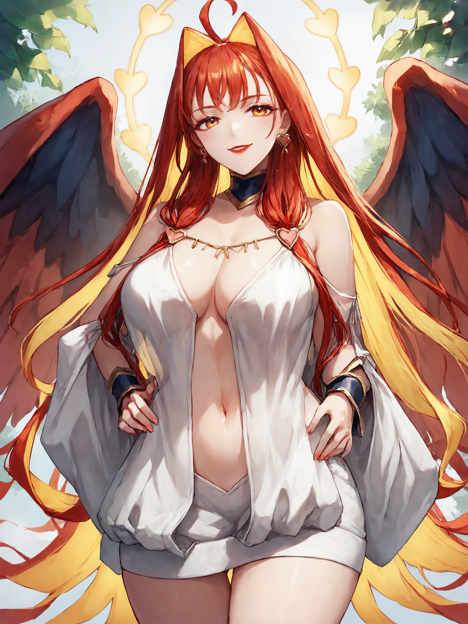hair intakes, long hair, multicolored hair, blonde hair, red hair, two-tone hair, ahoge, orange eyes, makeup, lipstick, large breastswhite dress, bare shoulders, long sleeves, center opening, puffy sleeves, navel, detached collar, halo, wrist cuffs, heart, jewelry, heart earrings, red wingsNotes: