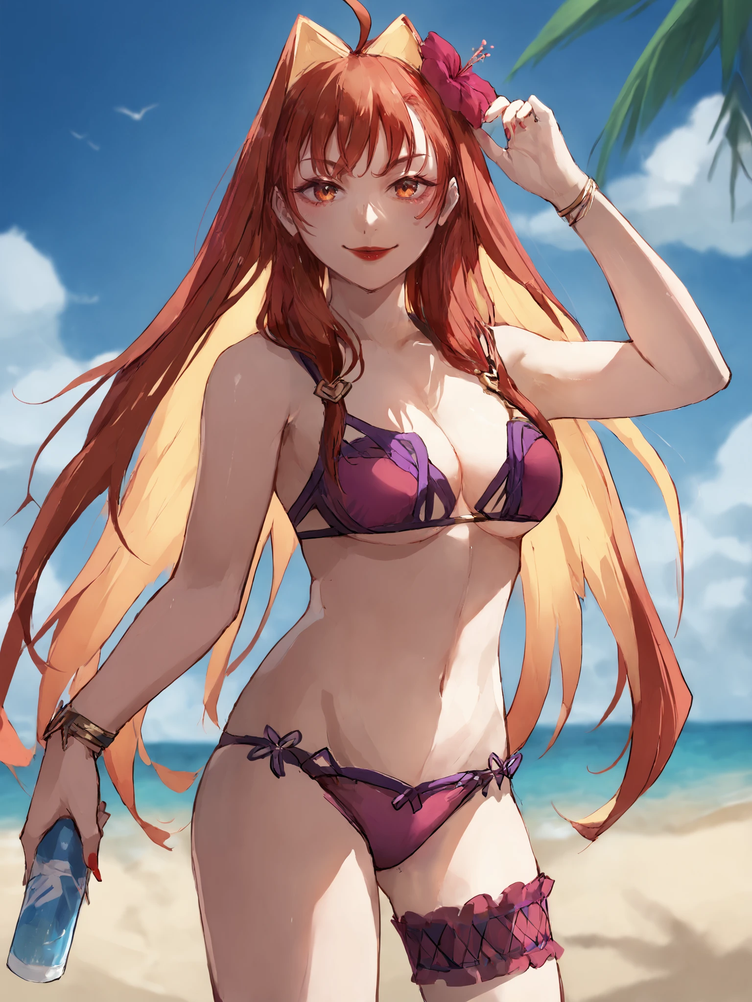 1. There is no prompt in the training data associated with those long strips of cloths she has on her thighs. If you have the weight high enough, they appear but the rest of the image might not look good. If you have the weight low enough, image might look good but then those cloths might not appear. Your mileage may vary