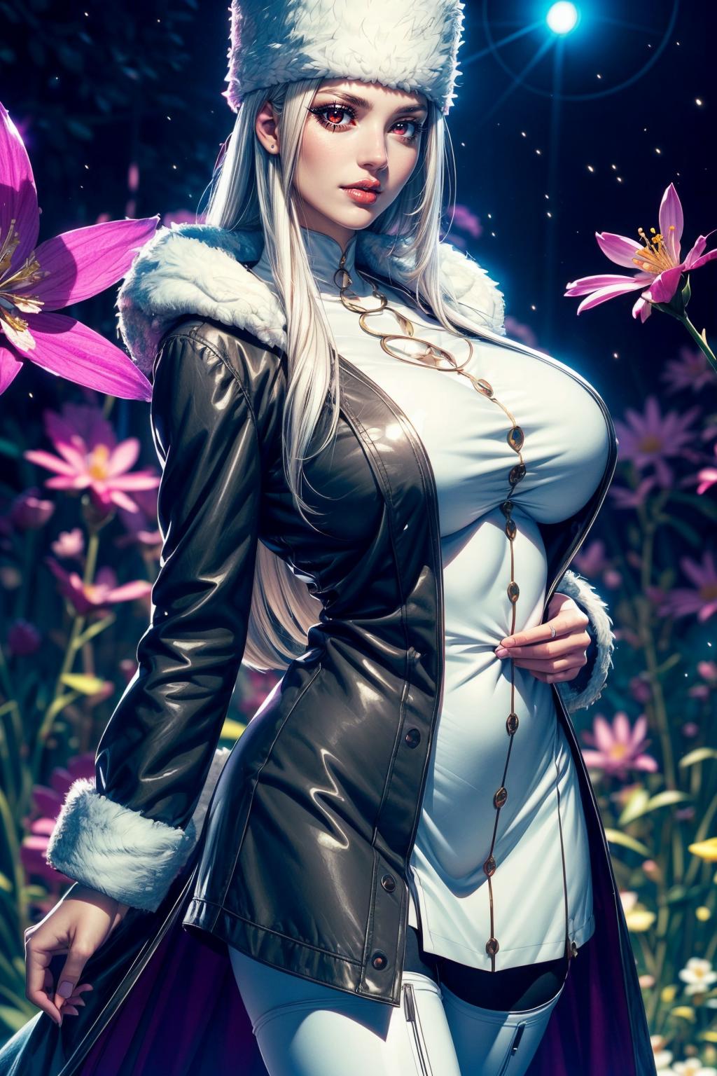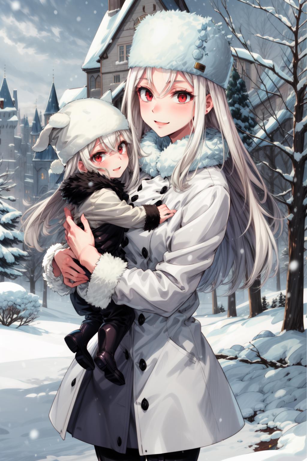 "Irisviel von Einzbern, long hair, pantyhose, thighboots, coat, fur hat"