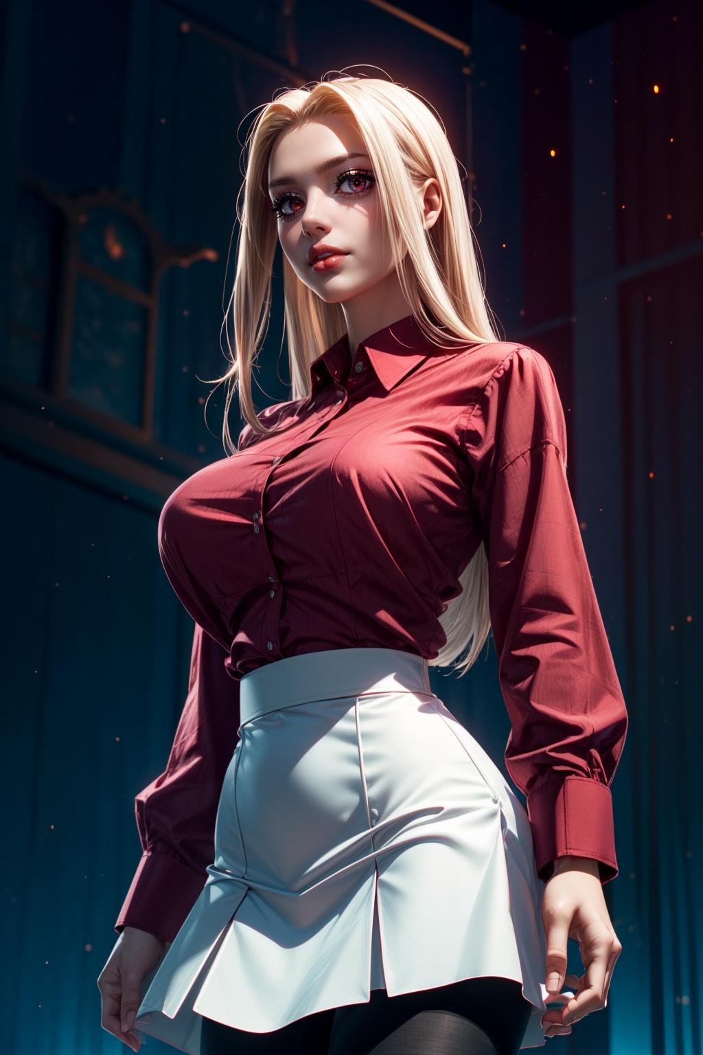 "Irisviel von Einzbern, long hair, red shirt, dress shirt, white skirt, pantyhose"