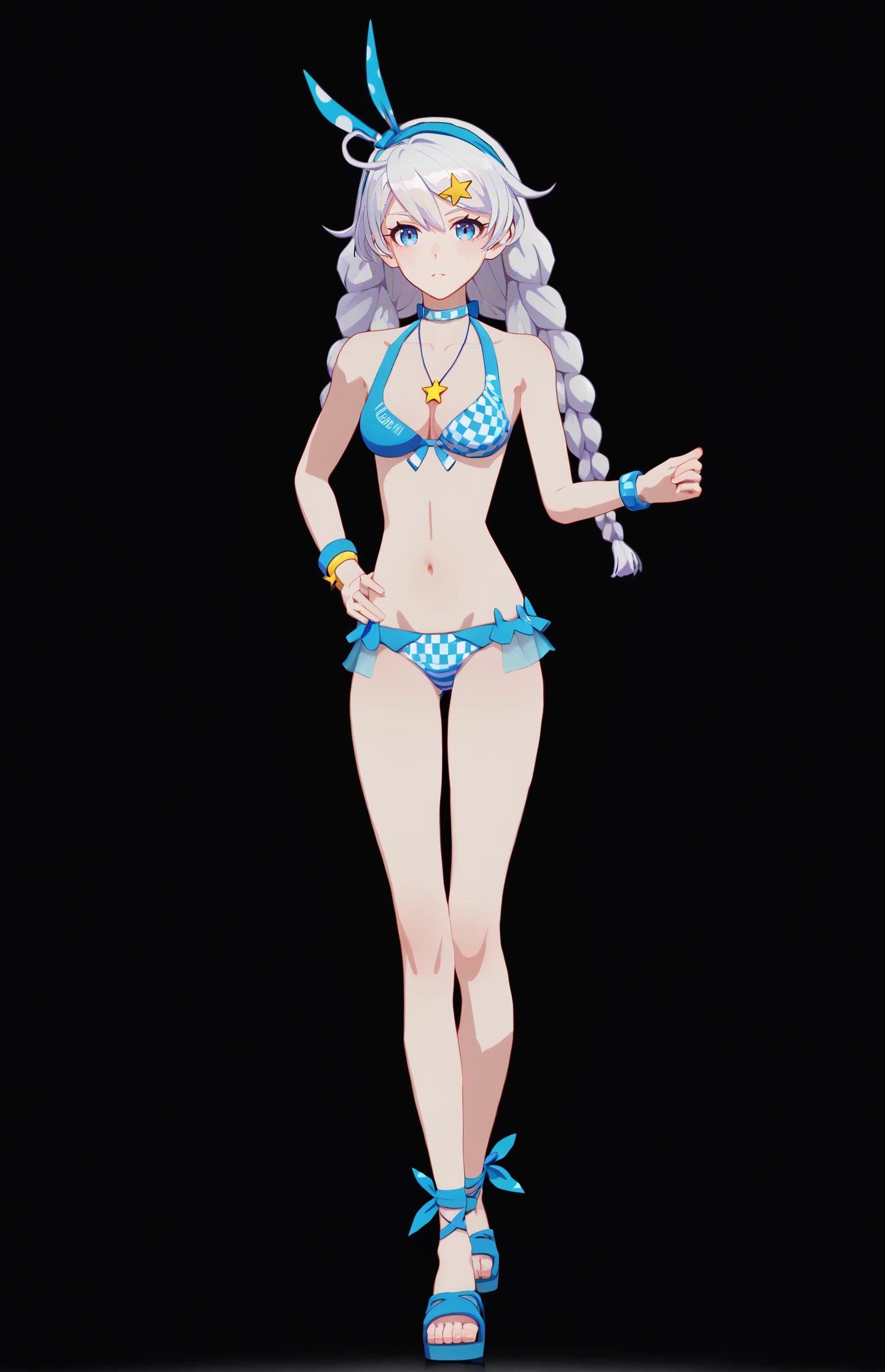 阳光海滩-Sunny Beach:kiana kaslana, bilan, 9th clothes, 1girl, sunflower, blue eyes, swimsuit, jewelry, braid, long hair, twin braids, necklace, hair ornament, bangs, blue bikini, sandals, navel,