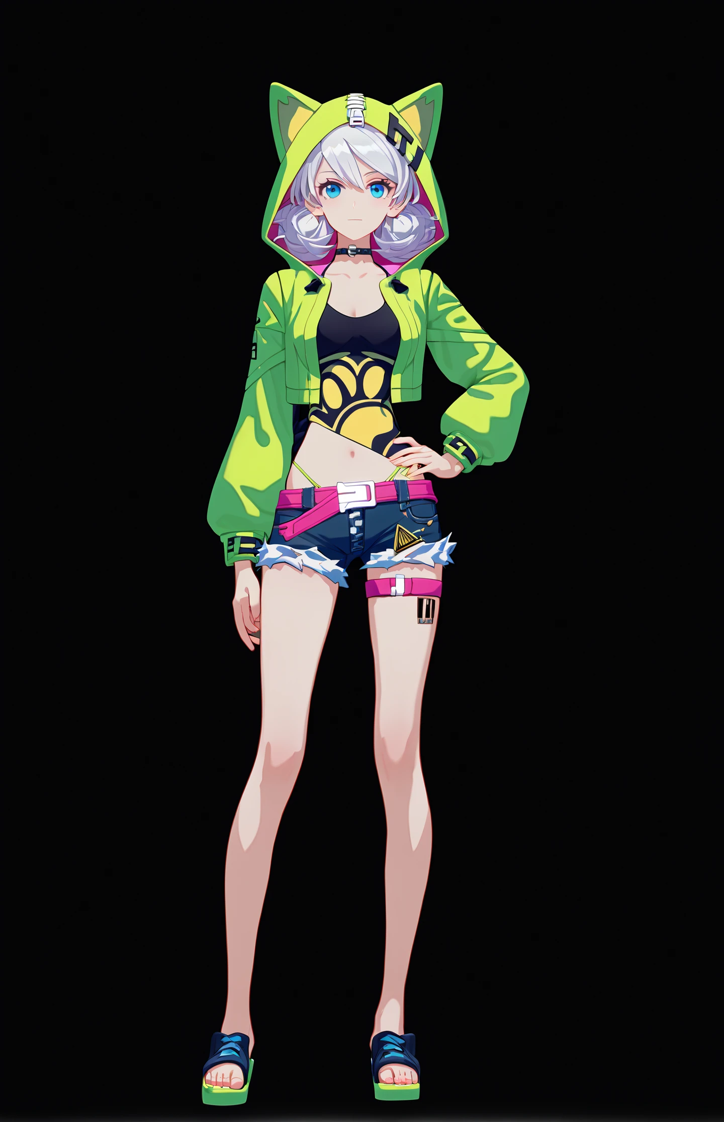 青柠汽水-Lemon Soda:kiana kaslana, qingning, 2nd clothes, 1girl, shorts, blue eyes, green jacket, hood, belt, bangs, denim shorts, cat claw pattern, silver hair,