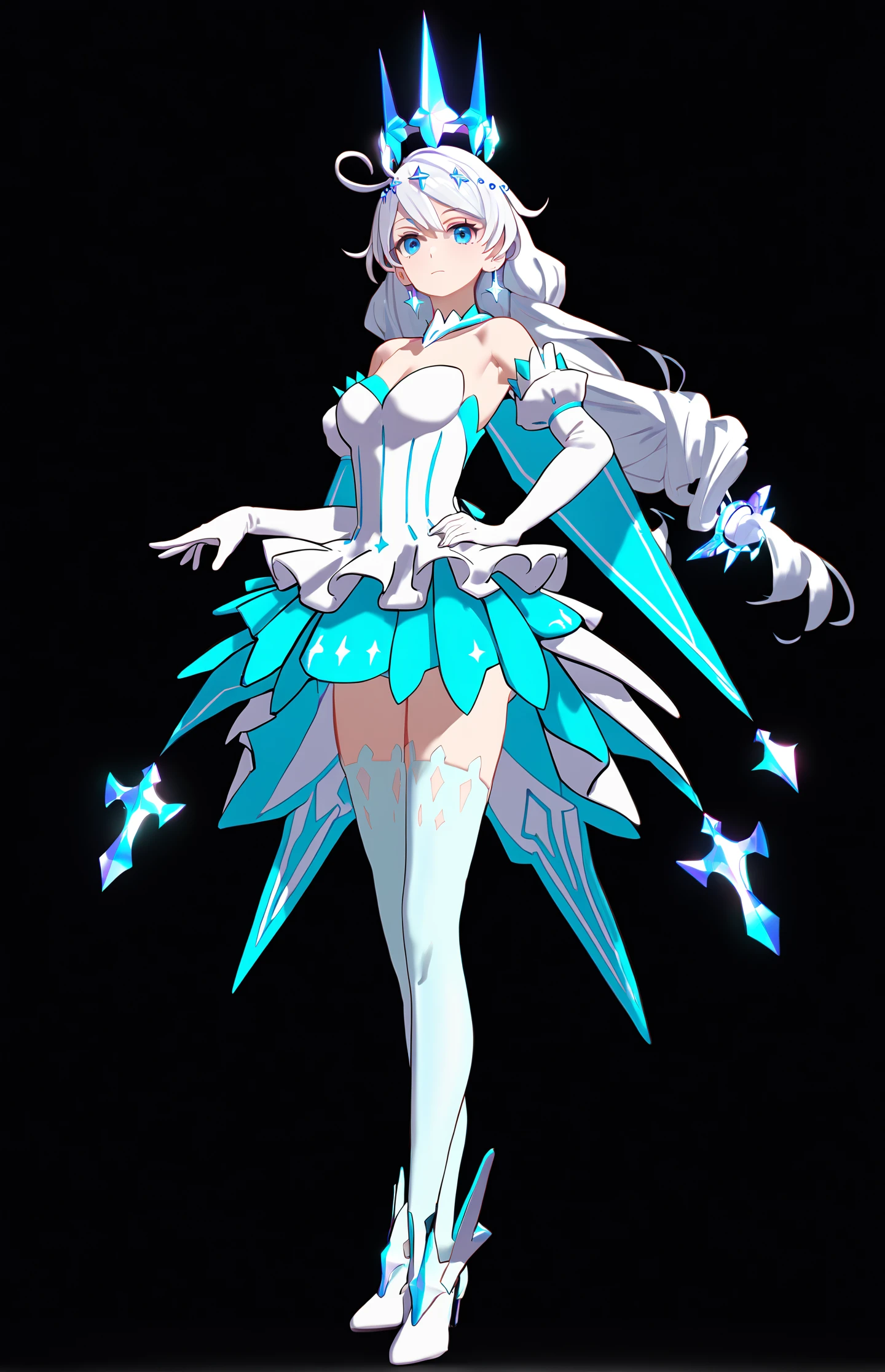 冬之公主-Winter Princess:kiana kaslana, dongzhi, 5th clothes, 1girl, blue eyes, gloves, white thighhighs, dress, long hair, elbow gloves, white hair, crystal crown, bare shoulders, bangs