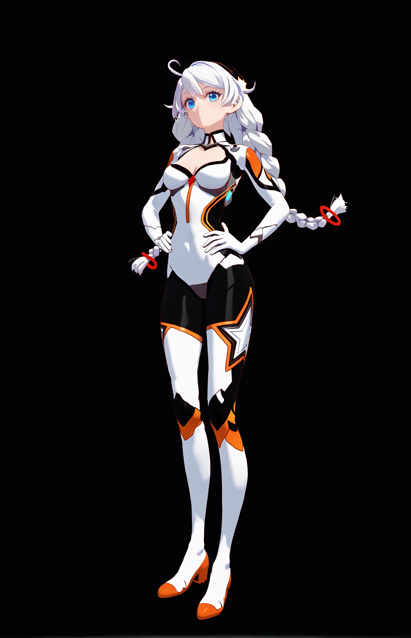 白练-White Comet:kiana kaslana, White Comet, 1st clothes, 1girl, blue eyes, braid, long hair, twin braids, white hair, bangs, breasts, bodysuit,