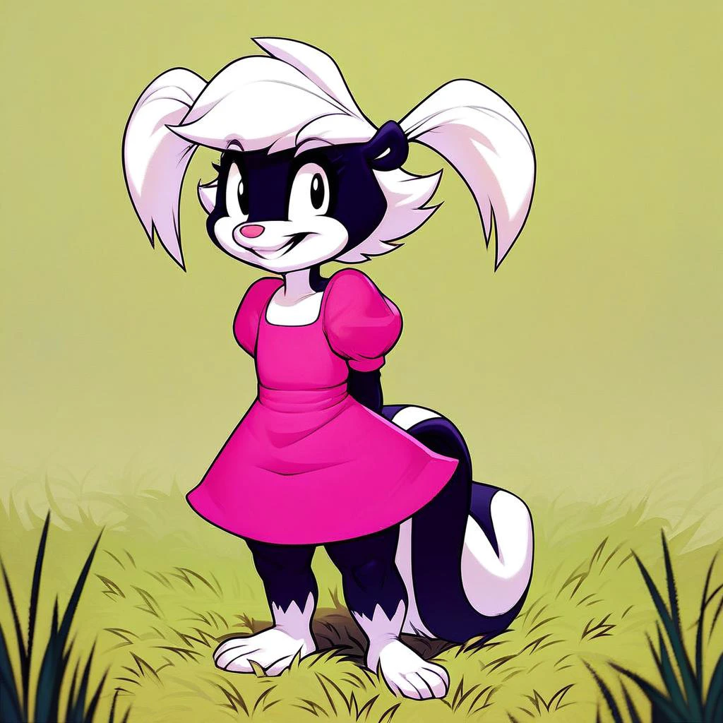 Skunk, anthro, black and white fur, white hair, pig tails, white hands, white feet, Puffy tail, black eyes, pink nose, shortstack,
