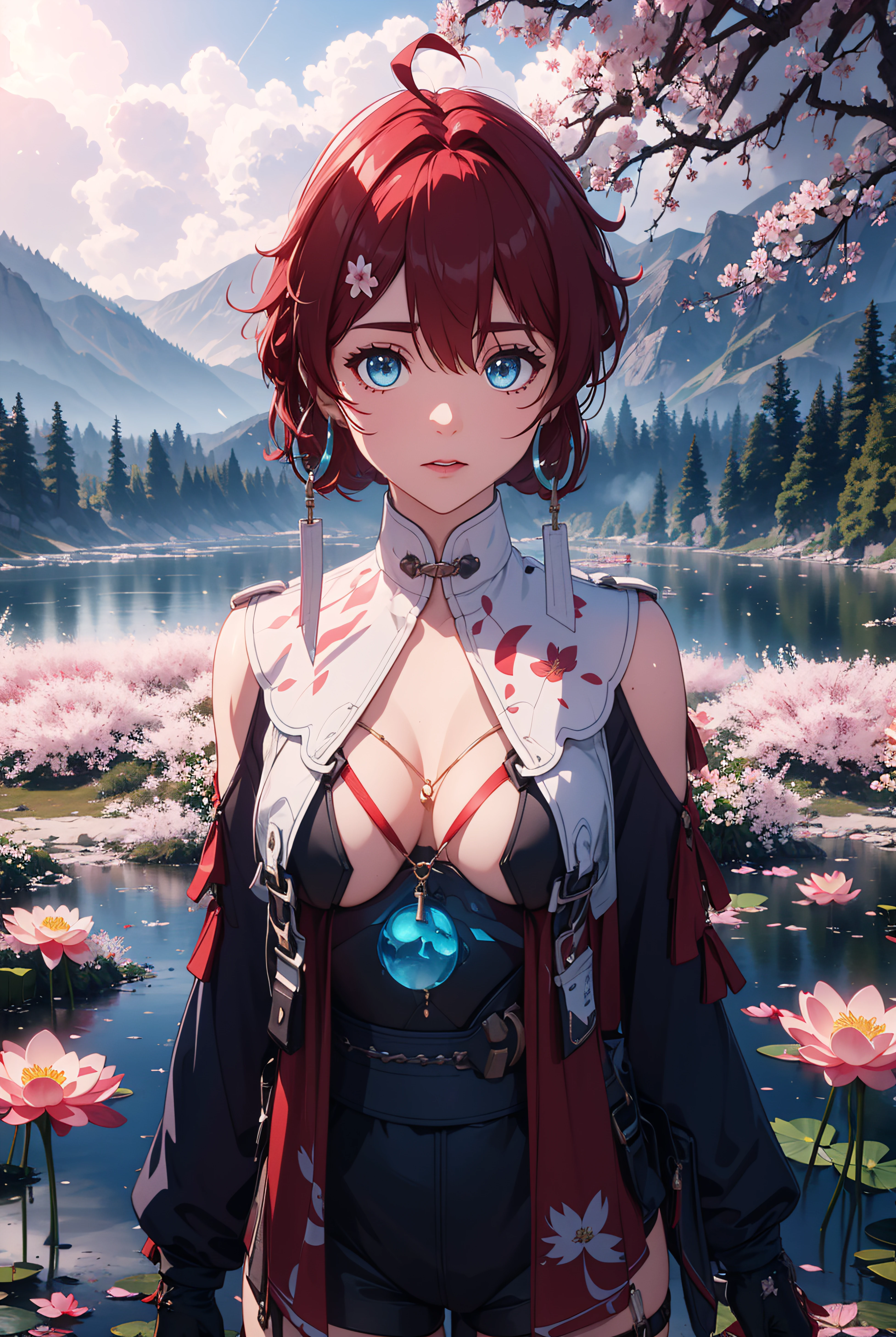 jewelry, necklace, earrings,gloves, long sleeves, shorts, black gloves, fingerless gloves, clothing cutout, thigh strap, shoulder cutout, straight-on,