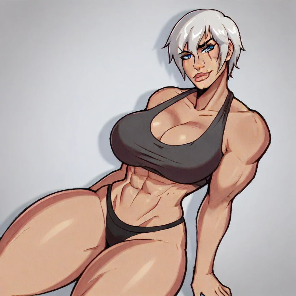 1girl, solo, white hair, short hair, blue eyes, facial scar, abs, large breasts