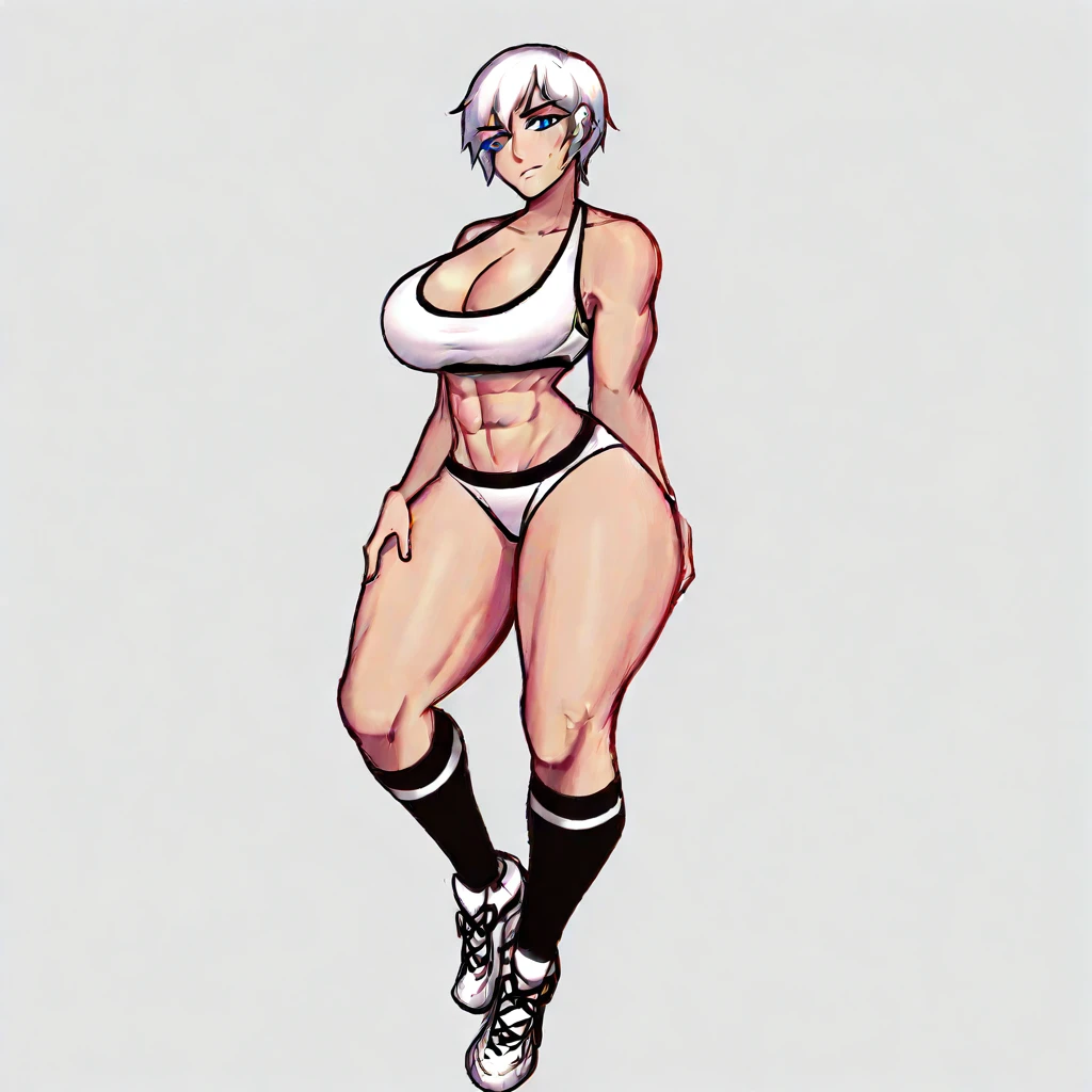 1girl, solo, white hair, short hair, blue eyes, facial scar, abs, large breasts, thighs, sports bra, knee high socks, shoes, cleavage, panties