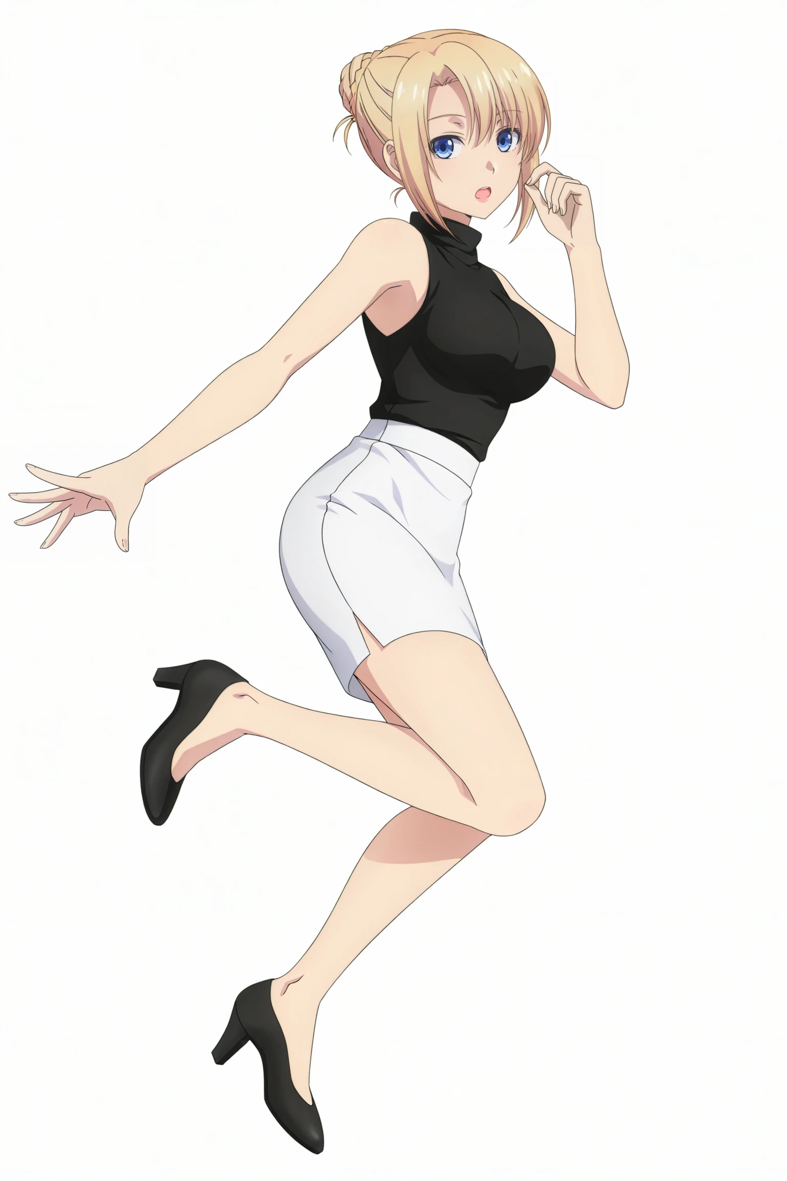 black shirt,black high heels,white skirt,pencil skirt,sleeveless turtleneck,---------------------->