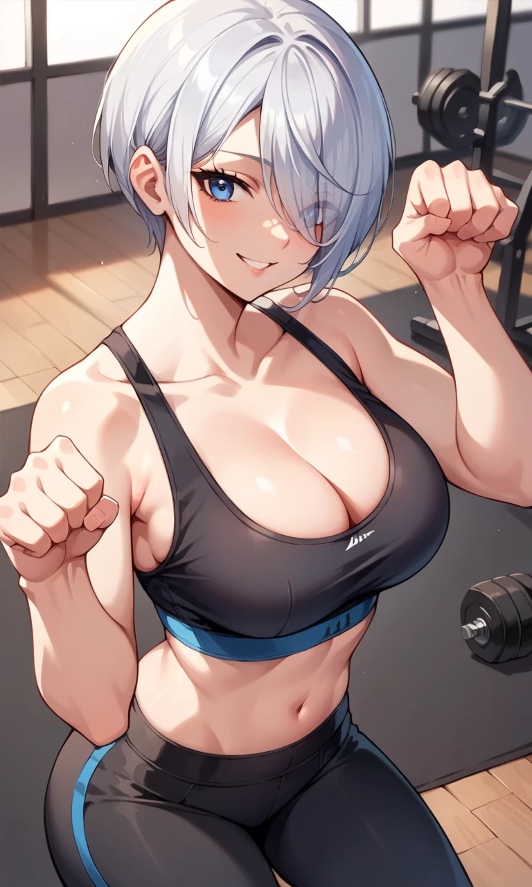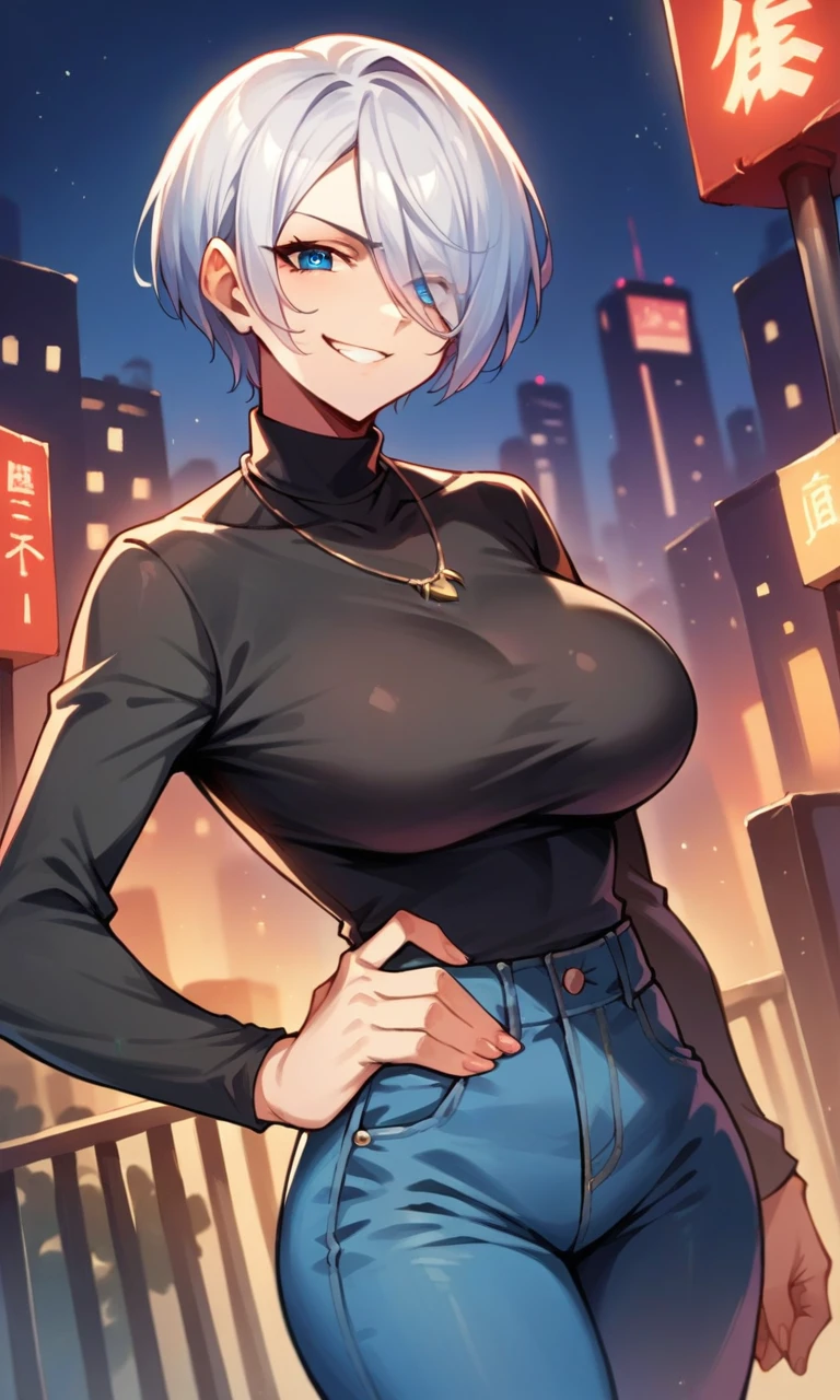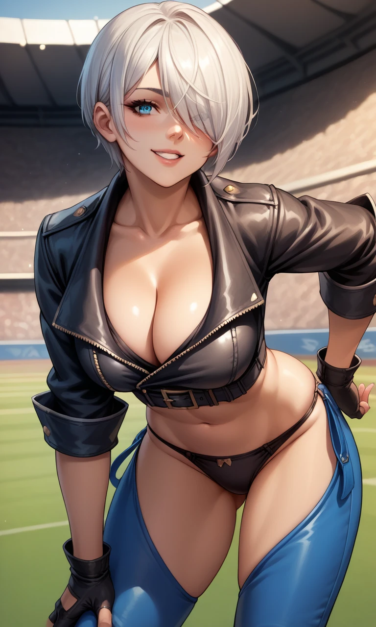 Use "AngelKOF, blue eyes, short hair, hair over one eye, cleavage, cropped jacket, fingerless gloves, midriff, chaps, panties, black jacket" to generate her outfit.