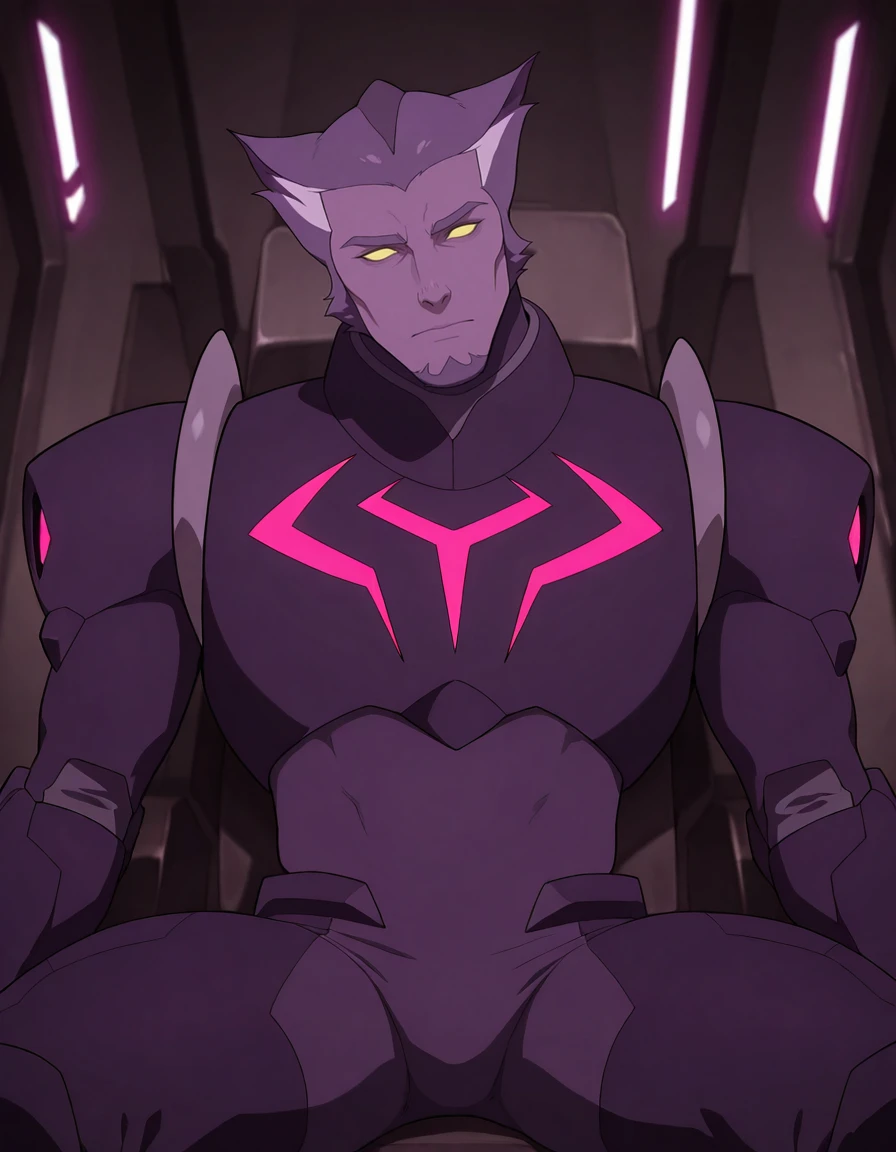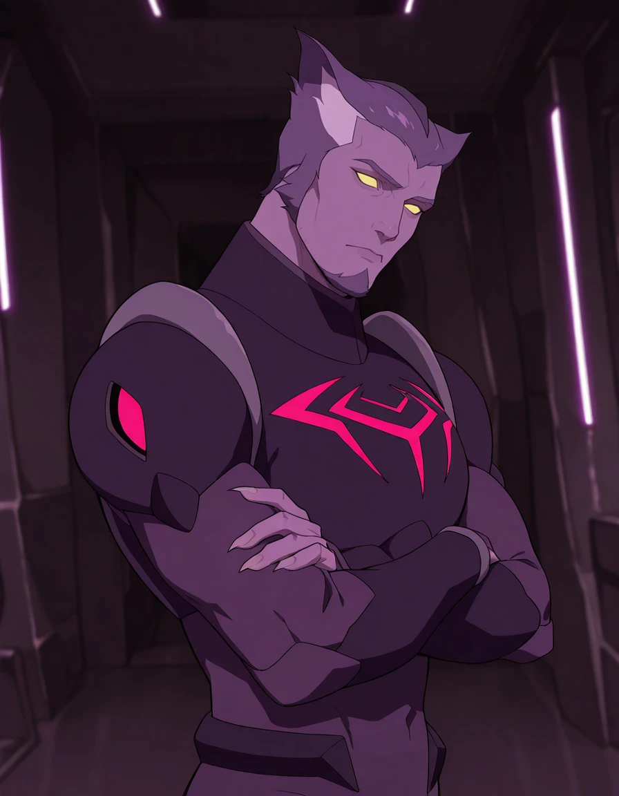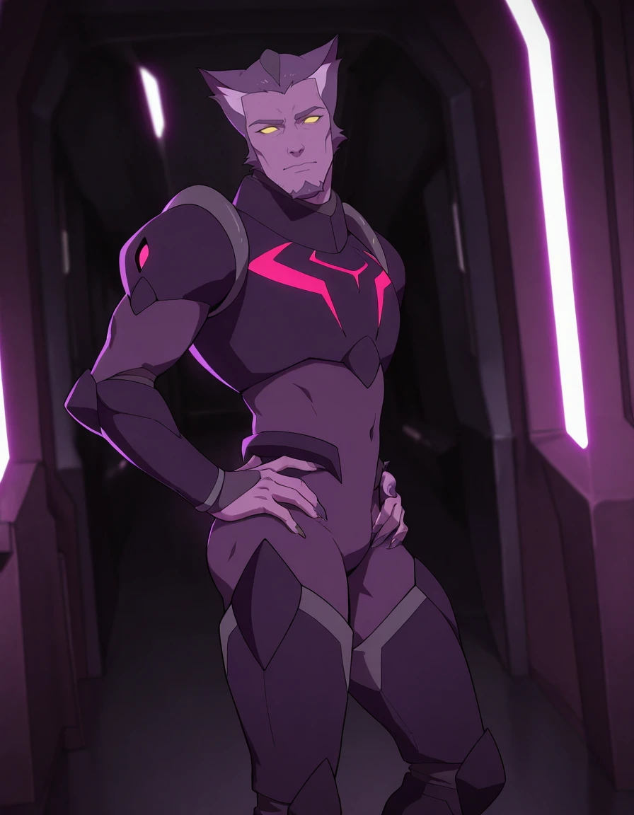 vld_thace, 1boy, very short hair, multicolored hair, purple body fur, yellow eyes, glowing eyes, solid eyes, no pupils, cat ears, goatee, long nailsV1 outfit tags are as follows: