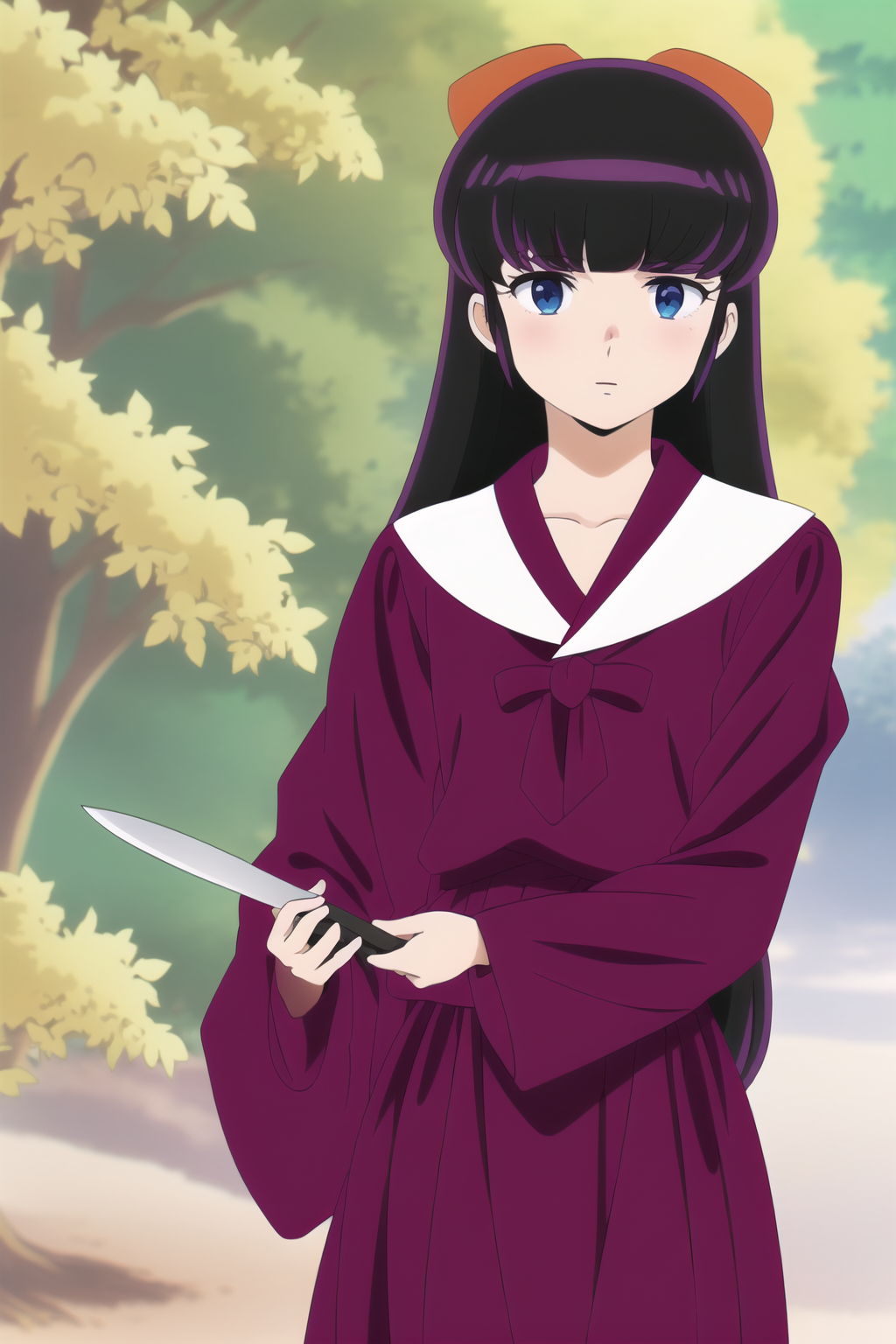 Prompt: best quality, 1girl, beautiful face, long hair, purple black hair, bangs, blunt bangs, hair bow, blue eyes, Urusei Yatsura, Ryouko Mendou