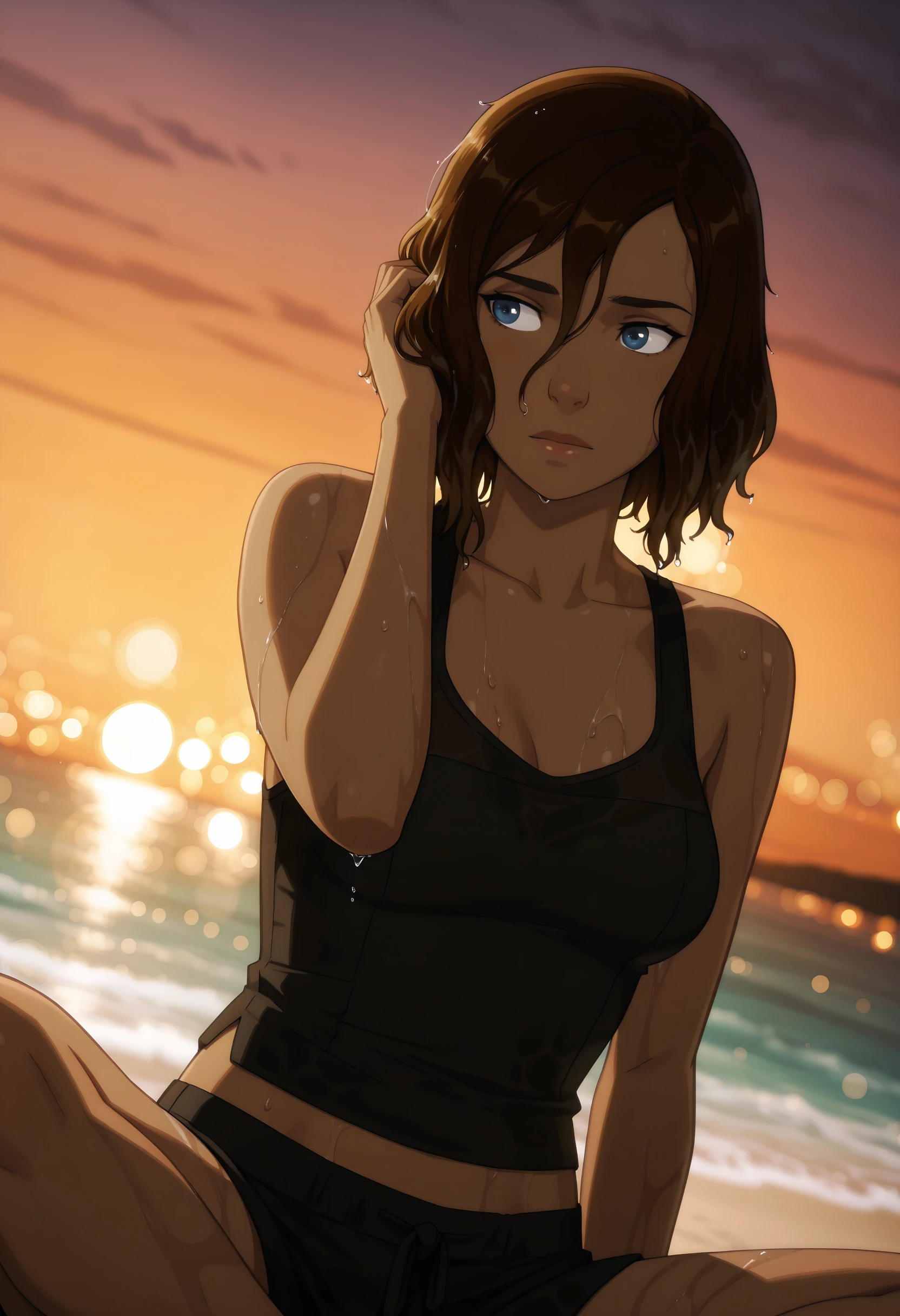 Stranded: tank-top, black tank-top, midriff, short, black shorts, barefoot