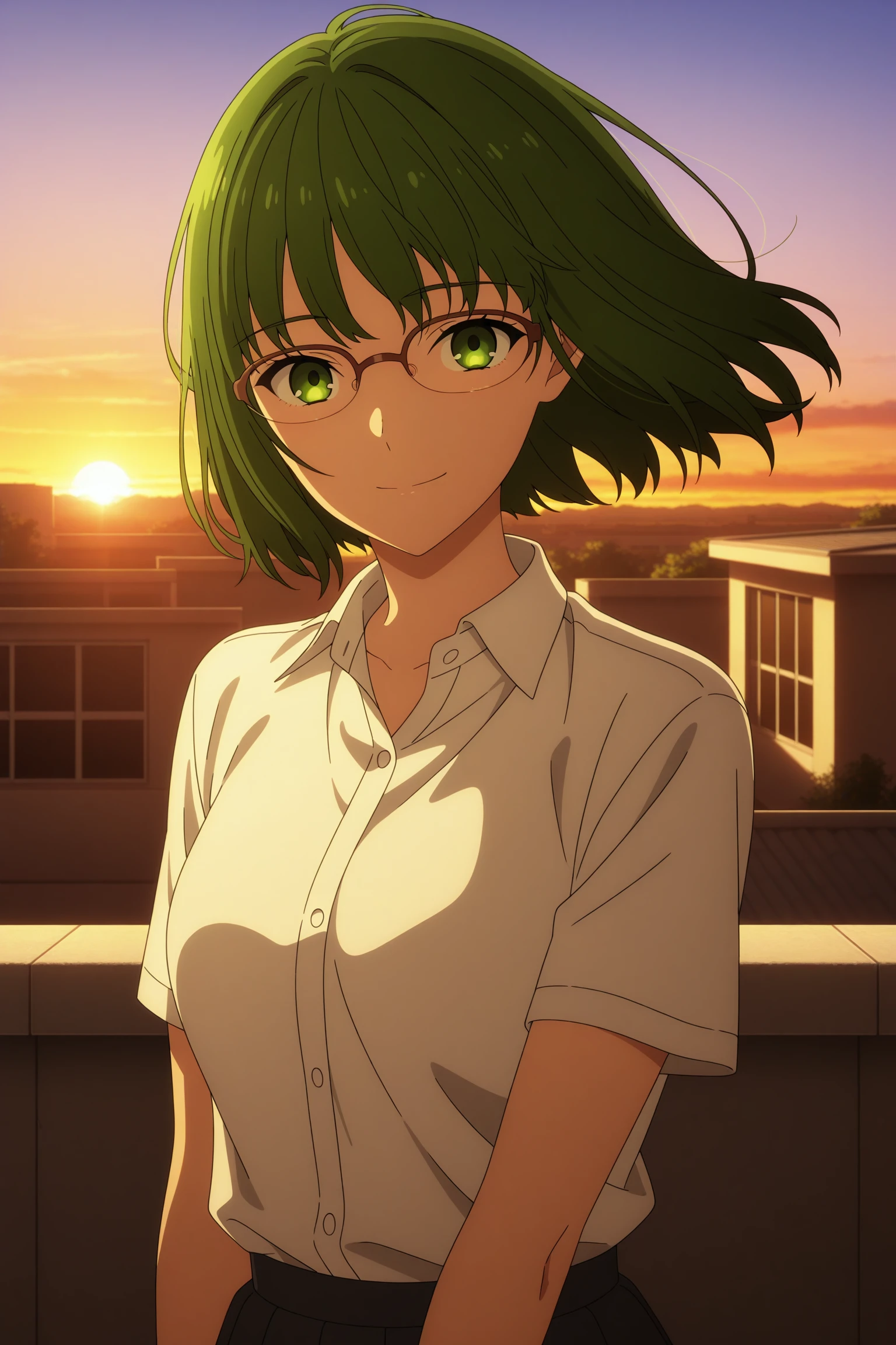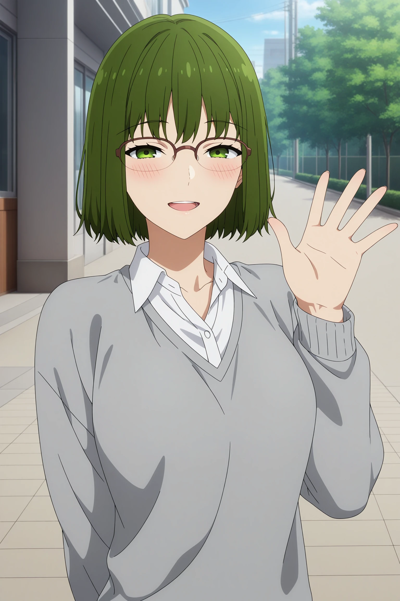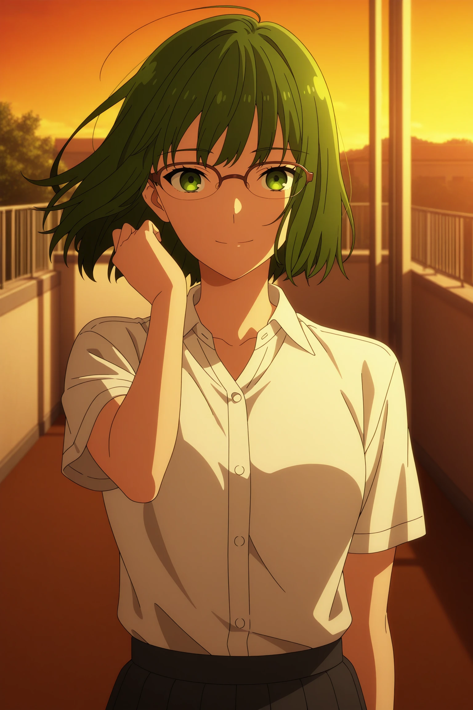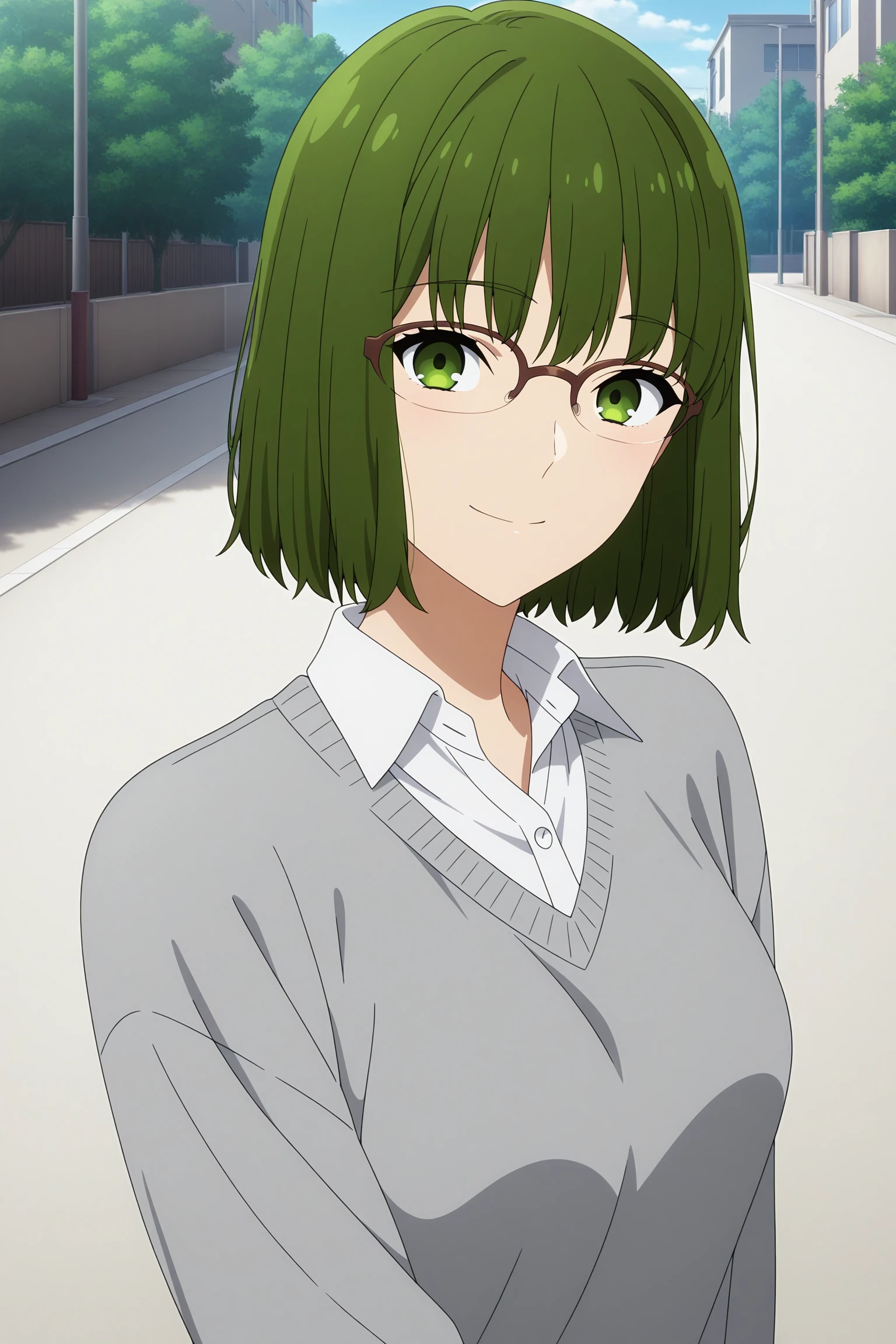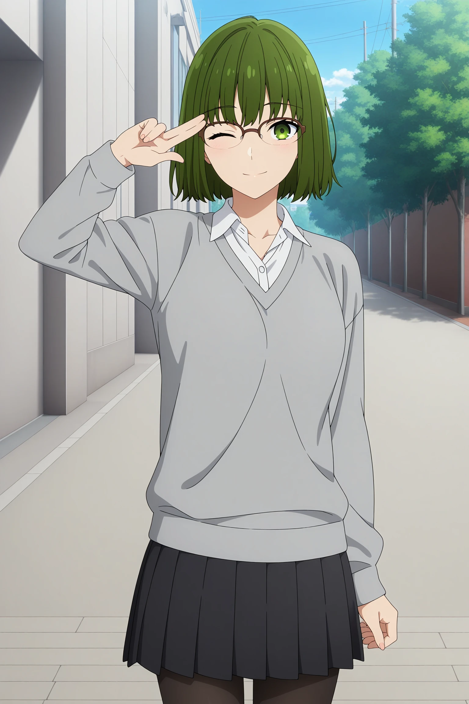 kouno sakura, short hair, green hair, bangs, green eyes, over-rim eyewear, school uniform, long sleeves, grey sweater, white shirt, collared shirt, black skirt, pleated skirt, black pantyhose, white sneakersSchool Uniform (Summer)