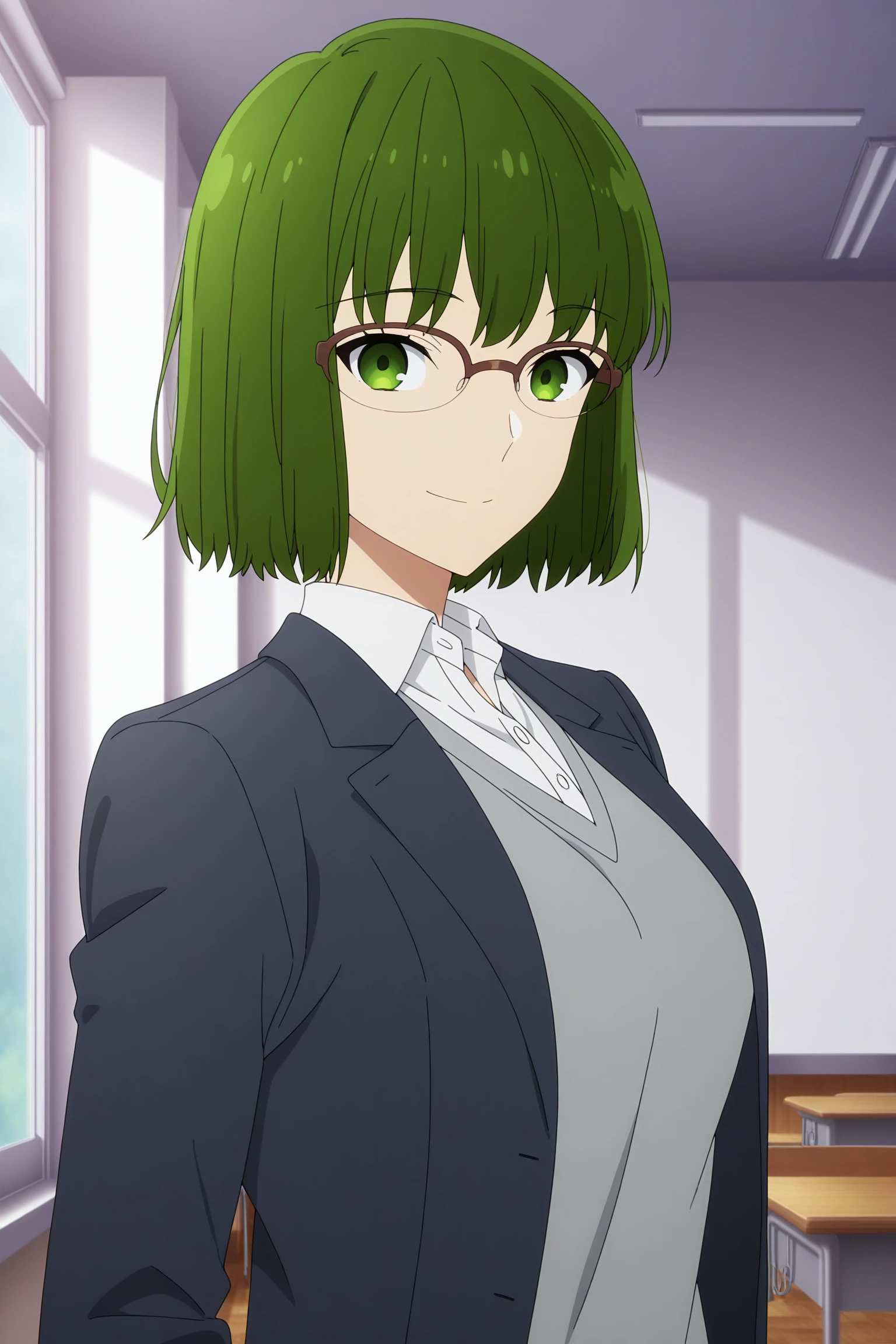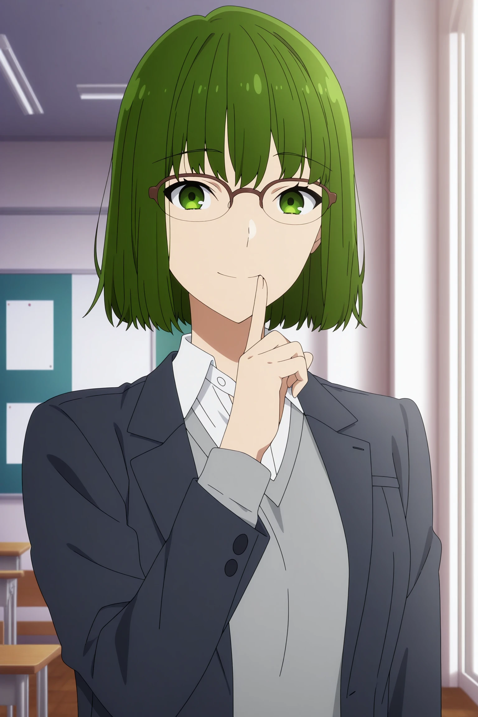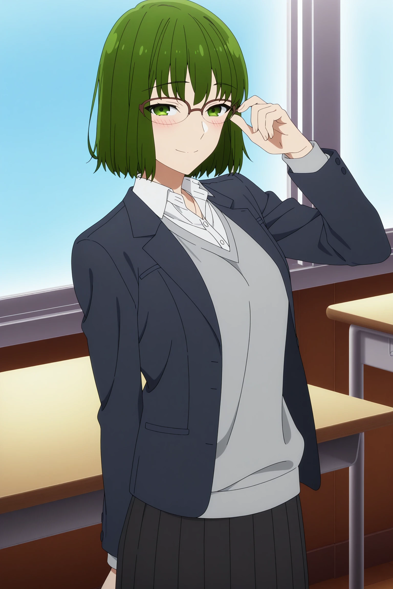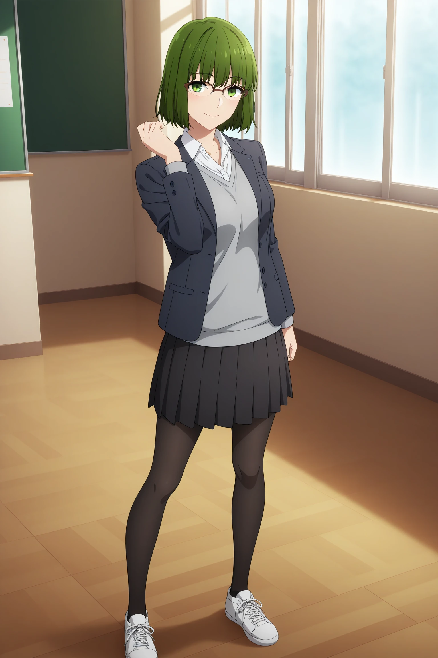 kouno sakura, short hair, green hair, bangs, green eyes, over-rim eyewear, school uniform, long sleeves, black jacket, open jacket, grey sweater, white shirt, collared shirt, black skirt, pleated skirt, black pantyhose, white sneakersSchool Uniform (Sweater)