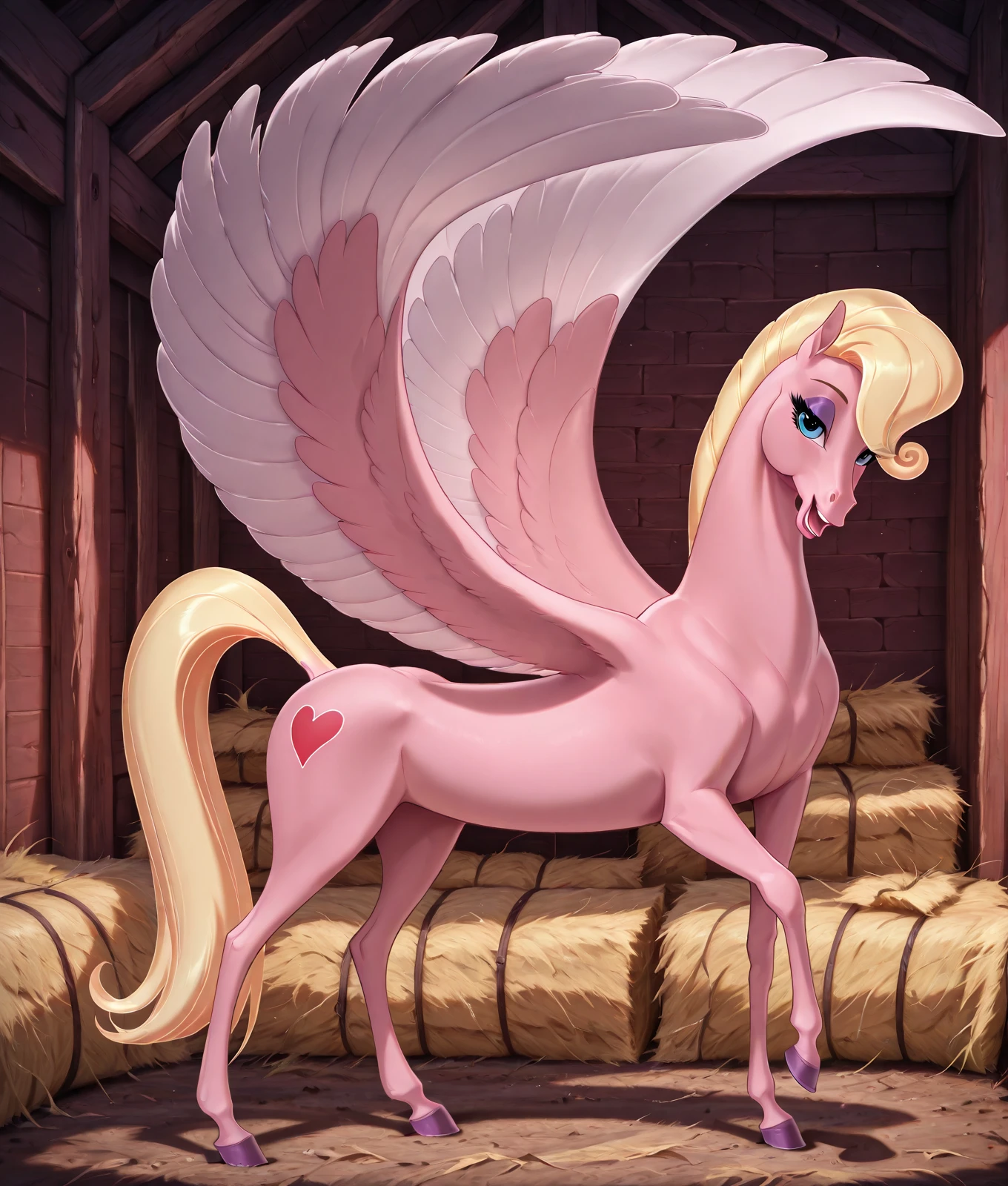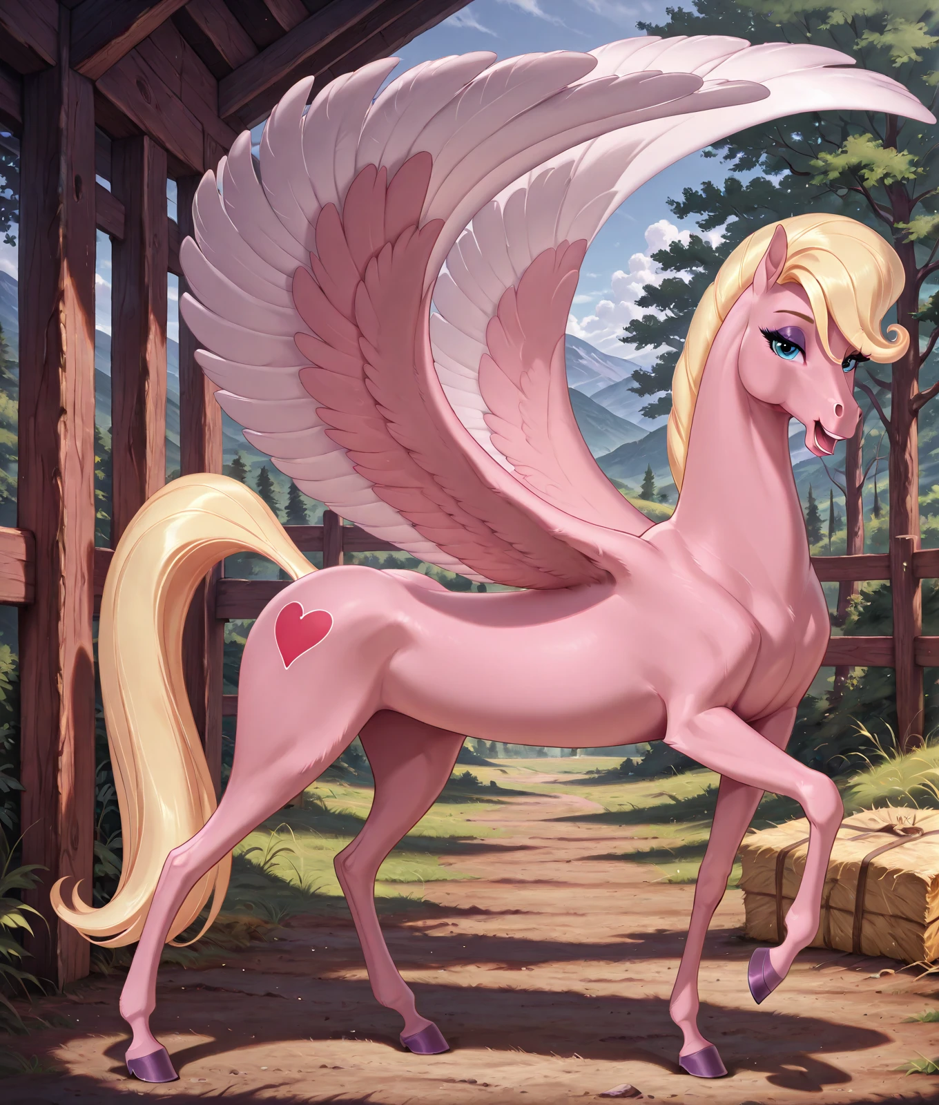 pink pegasus, pink skin, two-tone wings, white wing tipps, pink wings, cutie mark, red heart cutie mark, blonde hair, blonde tail, pegasus, feral, blue eyes, hooves,