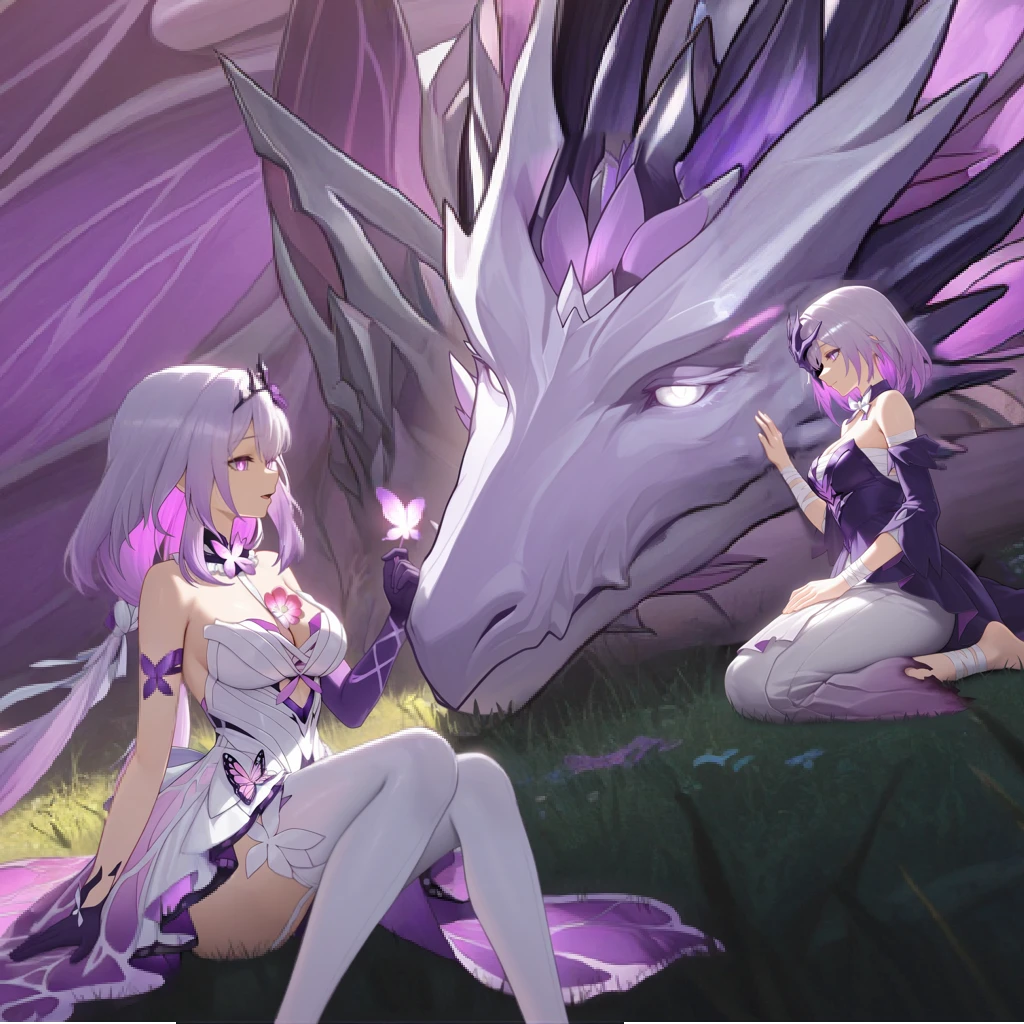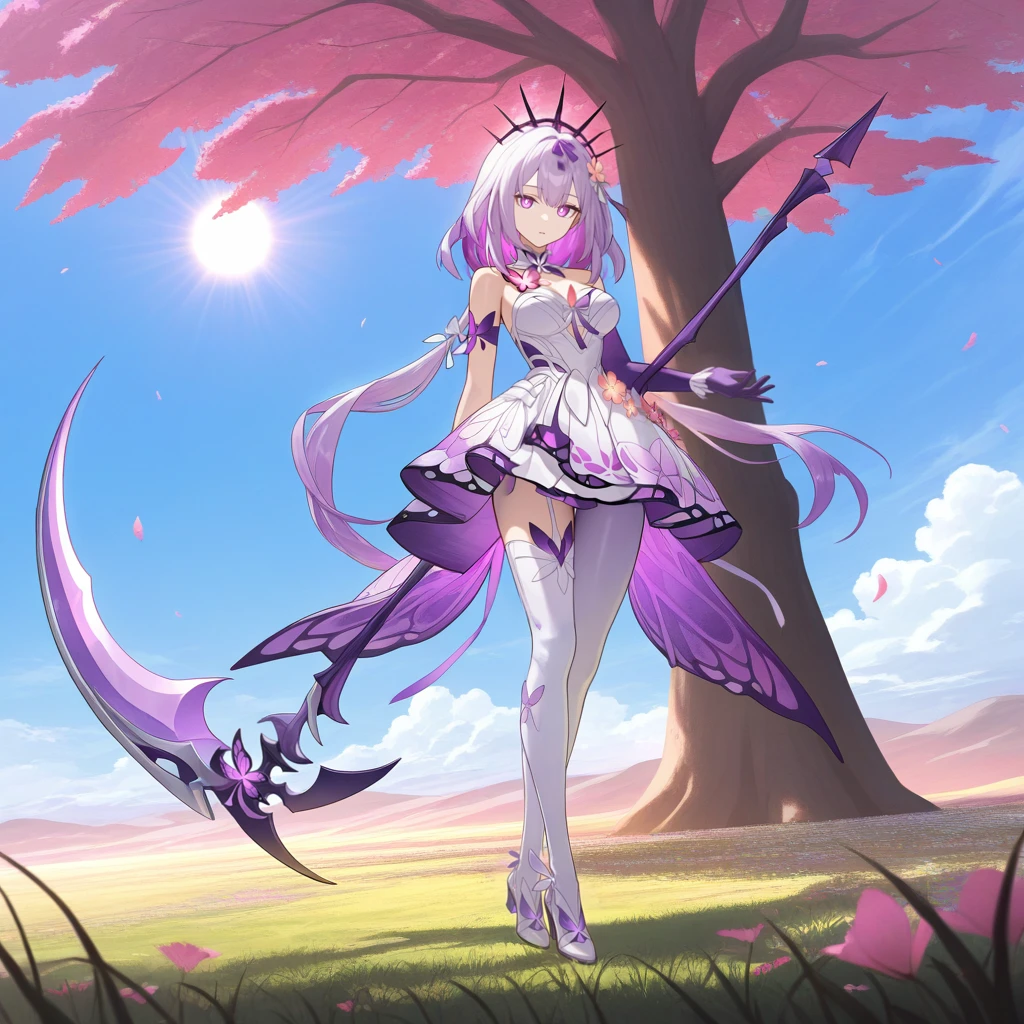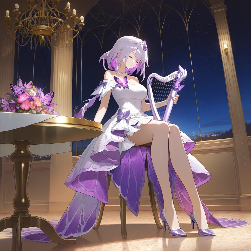 CstPlxHSR, Cst_Def, colored inner hair, purple hair, long hair, purple eyes, low-tied long hair, low twintails, white dress, sleeveless dress, between breasts, halterneck, detached collar, frilled collar, cutout above navel, flower on chest, gradient ribbon, crown, white ribbon, white bow, single leg pantyhose, single garter strap, white pantyhose, thigh boots, white footwear, pink flower, purple flower, butterfly, hair ornament, hair flower, purple ribbon, frilled skirt, two-tone skirt, white skirt, purple skirt, white stole, waist cape, hair ribbon, uneven gloves, purple gloves, single elbow glove, asymmetrical gloves, asymmetrical clothes, purple armband, butterfly print, single wrist cuff, frilled wrist cuffs, wrist strap,Concert Outfit: