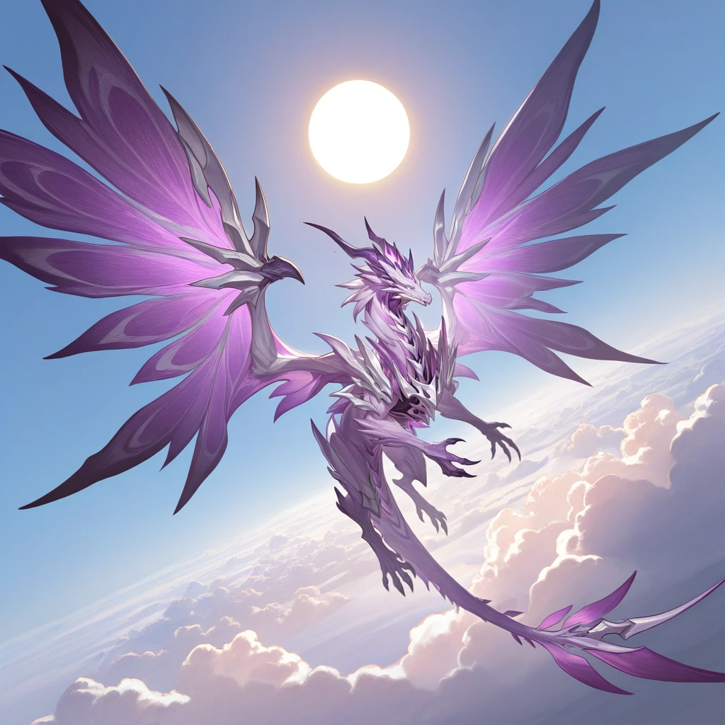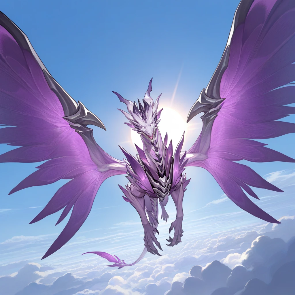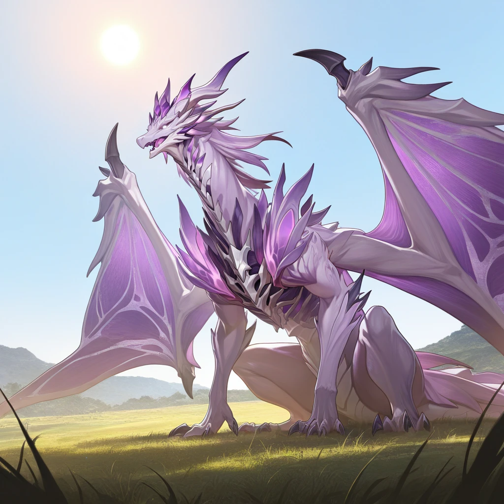 CstPlxHSR, Cst_Drg, no humans, monster, dragon, light purple dragon, purple wings, horns, spikes, armor, claws, glowing eyes, white eyes,Disclaimer: Make sure to remove all of human related tags! Such as: "1girl, perfect hands, perfect face, mature body, petite body, breasts, etc."