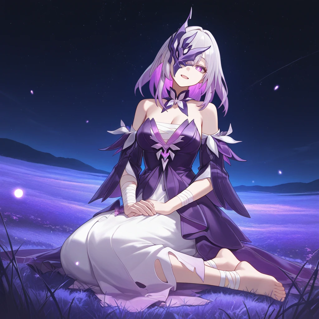 CstPlxHSR, Cst_Plx, purple hair, short hair, purple eyes, colored inner hair, bandages, chest sarashi, sarashi, off shoulder, strapless dress, purple dress, layered dress, white skirt, long skirt, bandaged arms, detached sleeves, wide sleeves, purple sleeves, sleeves past elbows, one eye covered, mask, purple gorget, cleavage, white bow, bowtie, burnt skirt, torn skirt, purple collar, mask over one eye,Pollux: (The Dragon)