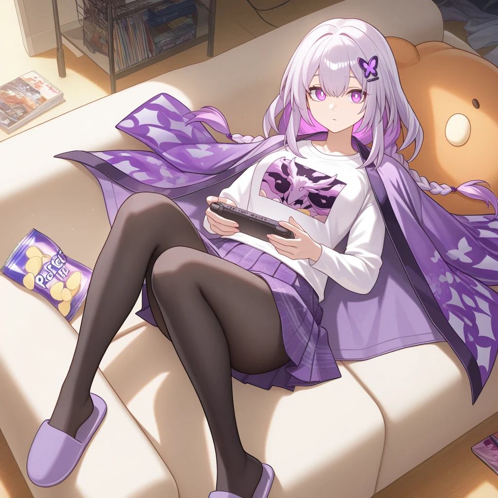 CstPlxHSR, Cst_Otk, purple hair, long hair, purple eyes, purple slippers, japanese clothes, colored inner hair, twin braids, low twintails, white shirt, print shirt, character print, long sleeves, white sleeves, happi, purple jacket, pleated skirt, jacket on shoulders, plaid skirt, purple skirt, black pantyhose, butterfly hair ornament, black hairclip,Polyxena: (Castorice's Sister)