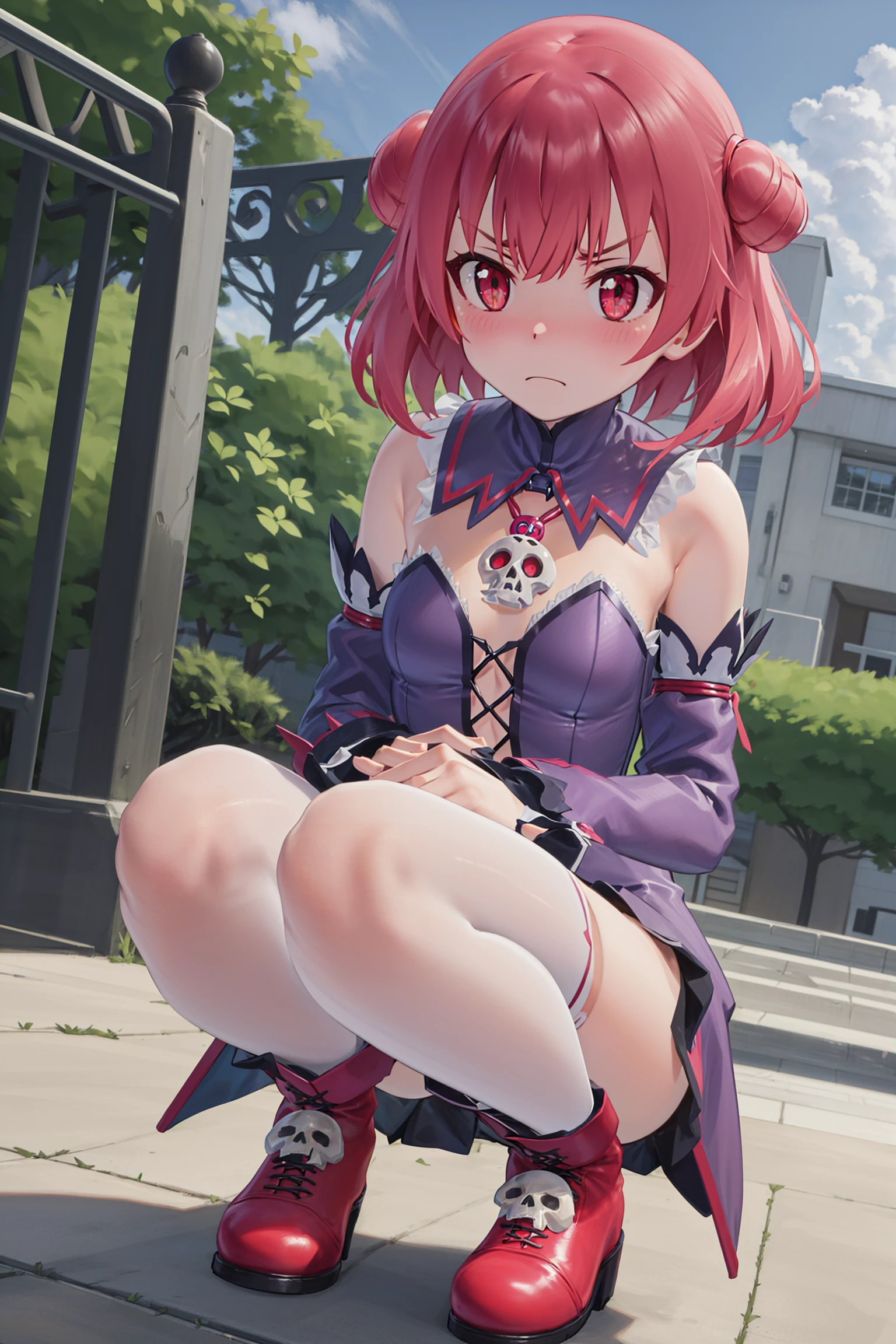 kurona outfit: kuronacos, detached collar, pendant, purple dress, frills, bare shoulders, detached sleeves, navel, black skirt, red shoes, skull