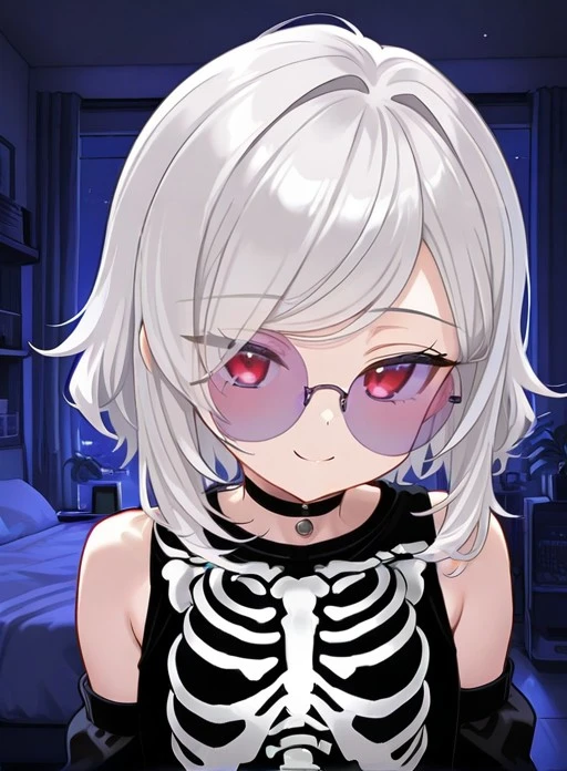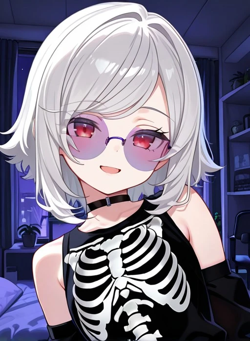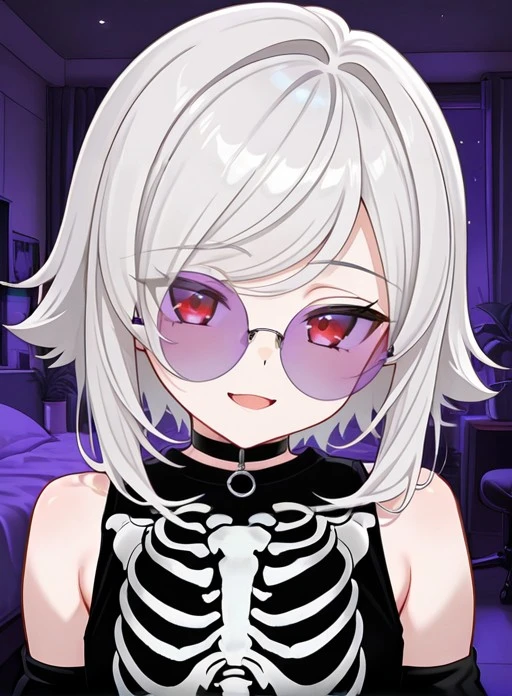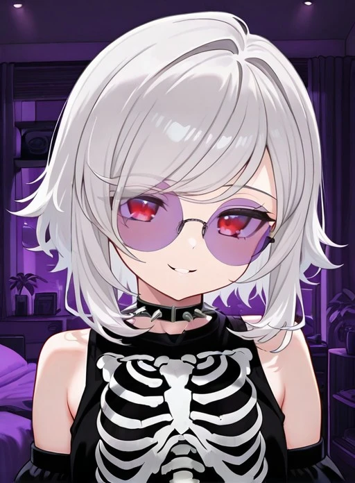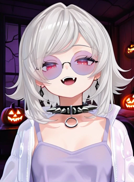 Abdara_12, 1girl, solo, breasts, short hair, shirt, red eyes, white hair, grey hair, earrings, small breasts, choker, glasses, virtual youtuber, medium hair, pink eyes,collar, sunglasses, spikes, round eyewear, tinted eyewear, spiked collar, purple-tinted eyewear, spiked choker, makeup, swept bangs, eyeshadow, flipped hair, ears visible through hair