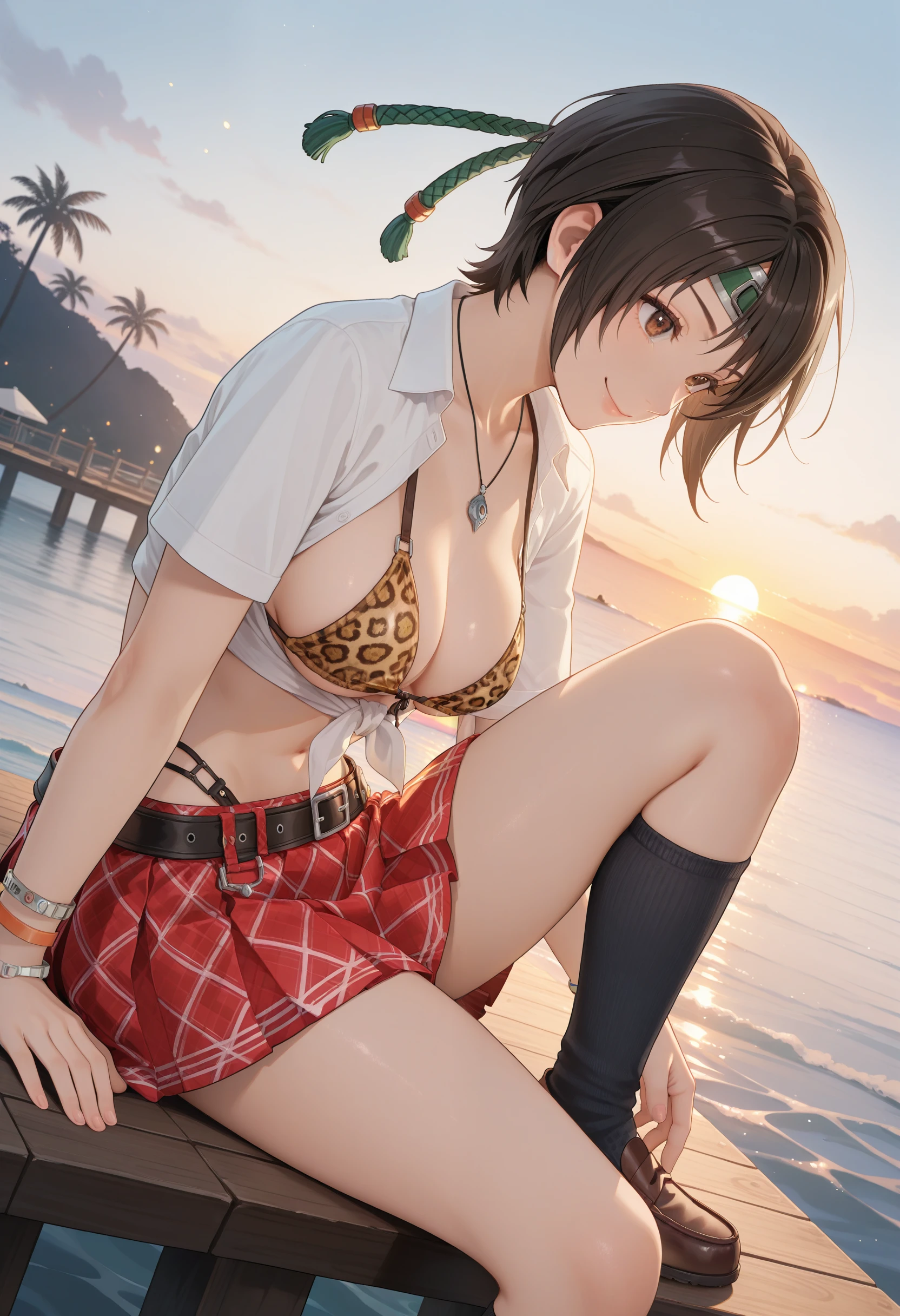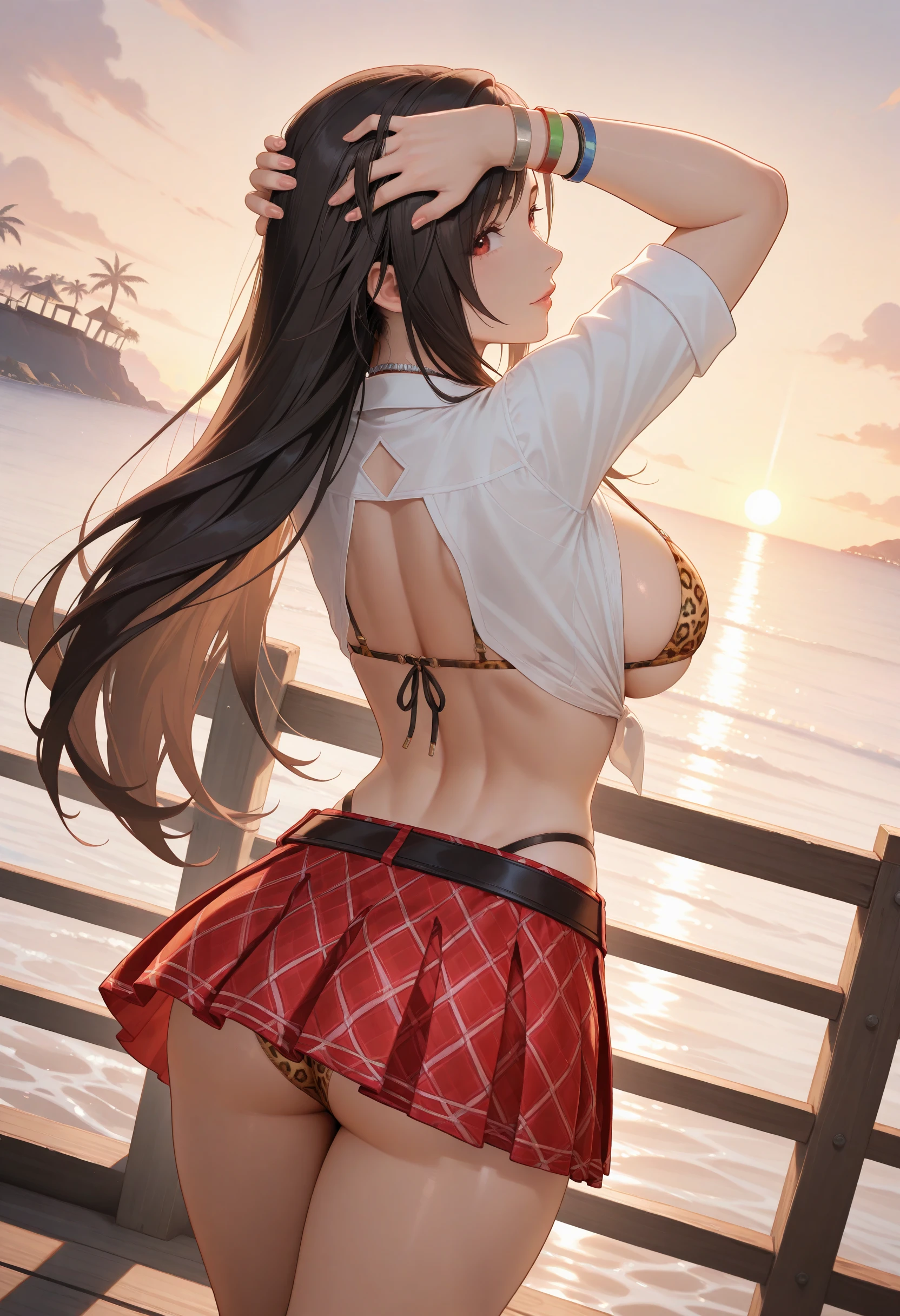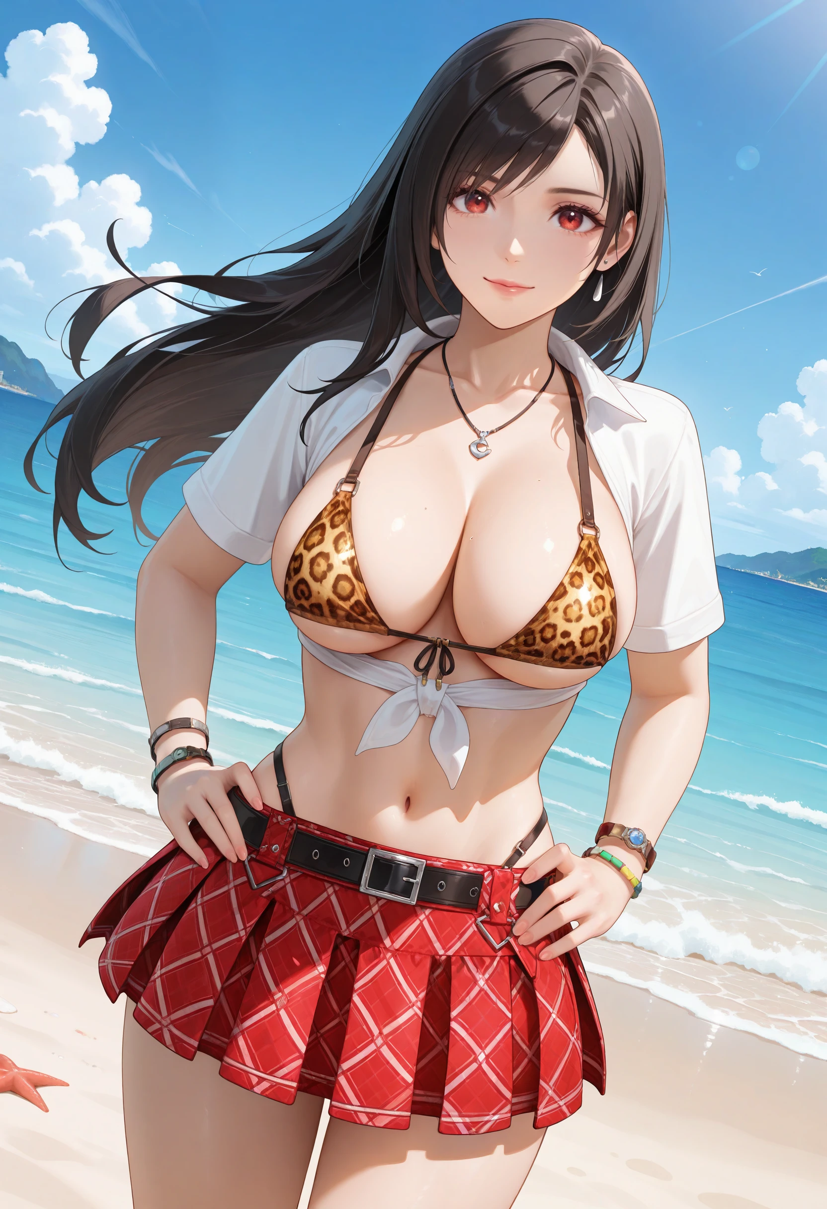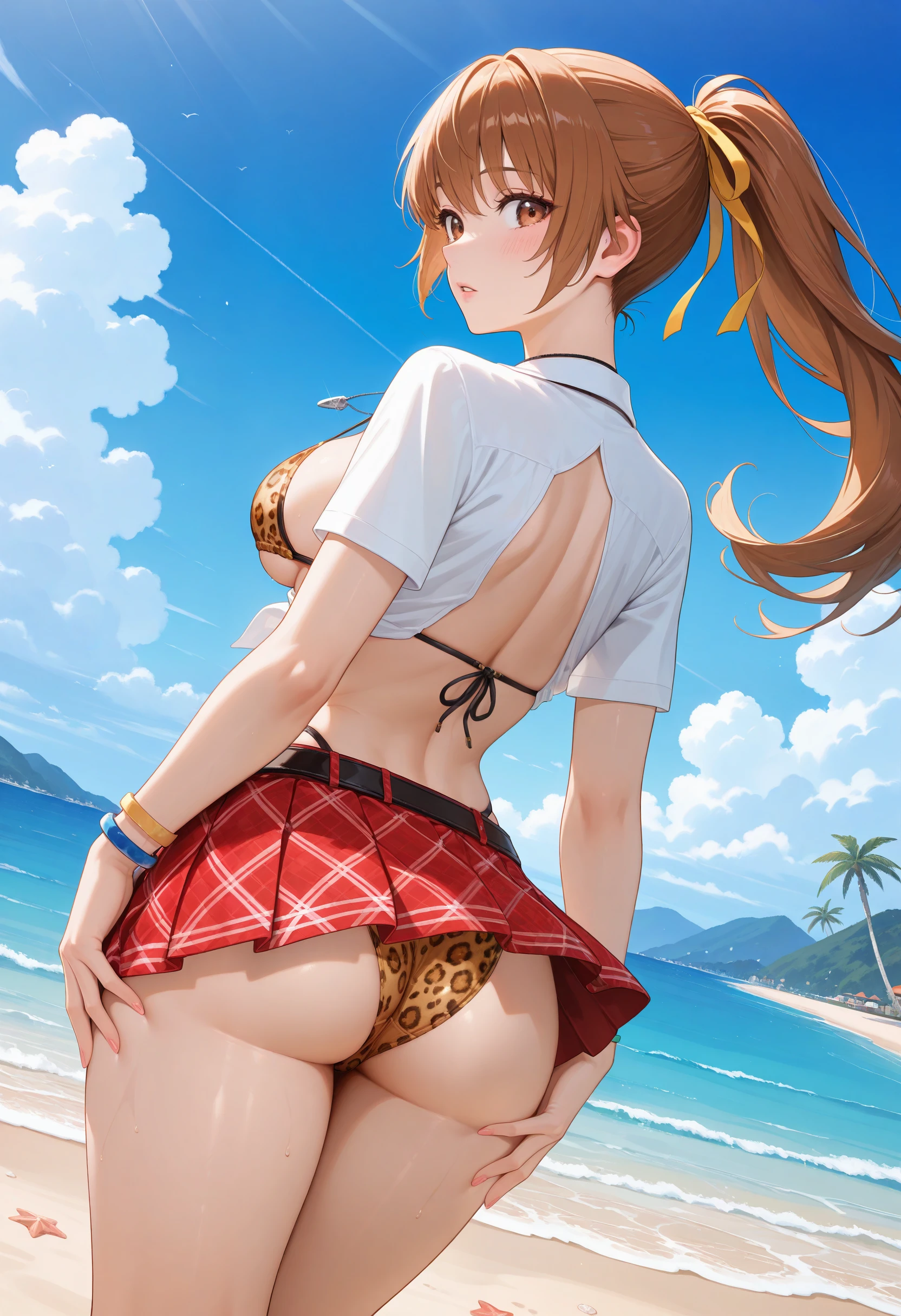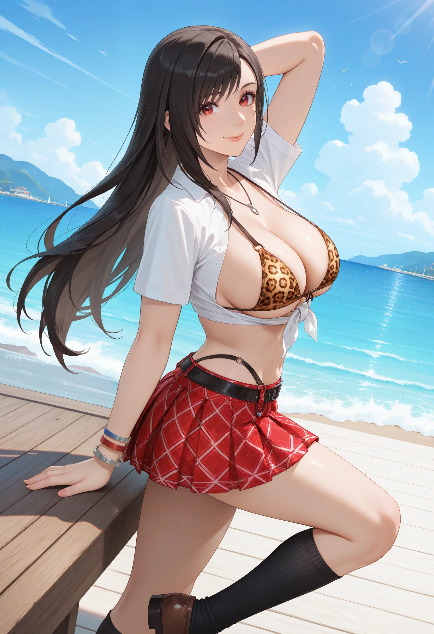基本プロンプト:"SchoolVibesDoaxvv,necklace,white shirt,front-tie top,leopard print bikini,bracelet,jewelry,plaid skirt,pleated skirt,red skirt,kneehighs,black socks,brown footwear,loafers".