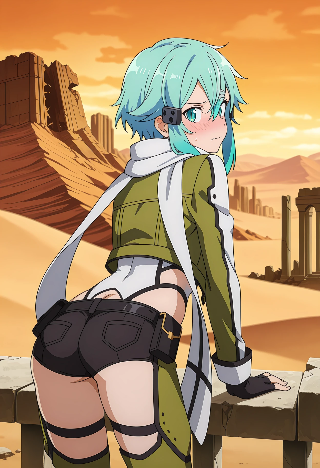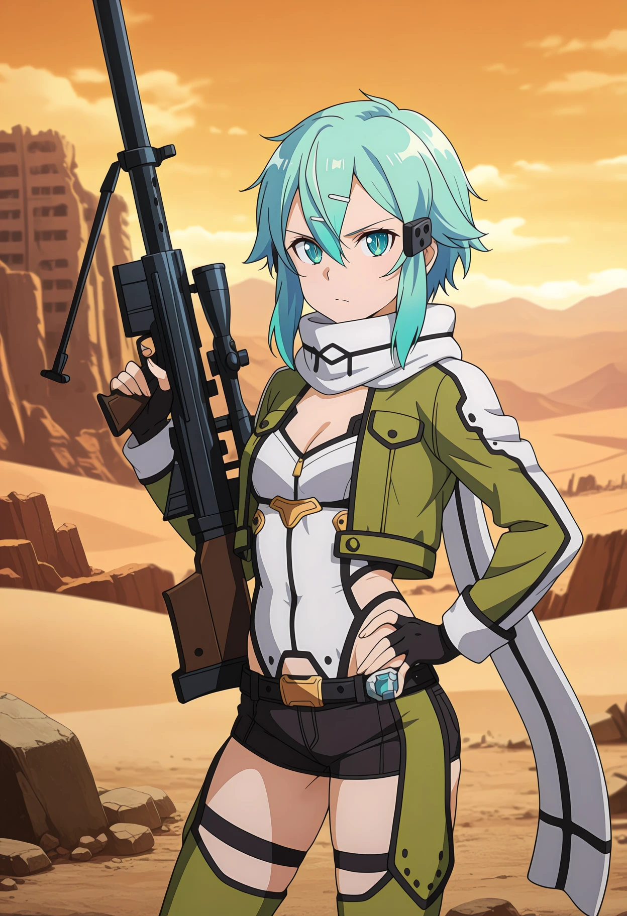 SinonGGOFight, hair between eyes, short hair with long locks, aqua hair, aqua eyes, slit pupils, hair ornament, hairclip, white scarf, open jacket, cropped jacket, green jacket, cleavage, small breasts, long sleeves, fingerless gloves, black gloves, highleg leotard, white leotard, side cutout, black belt, short shorts, black shorts, chaps, green pants, thigh strap