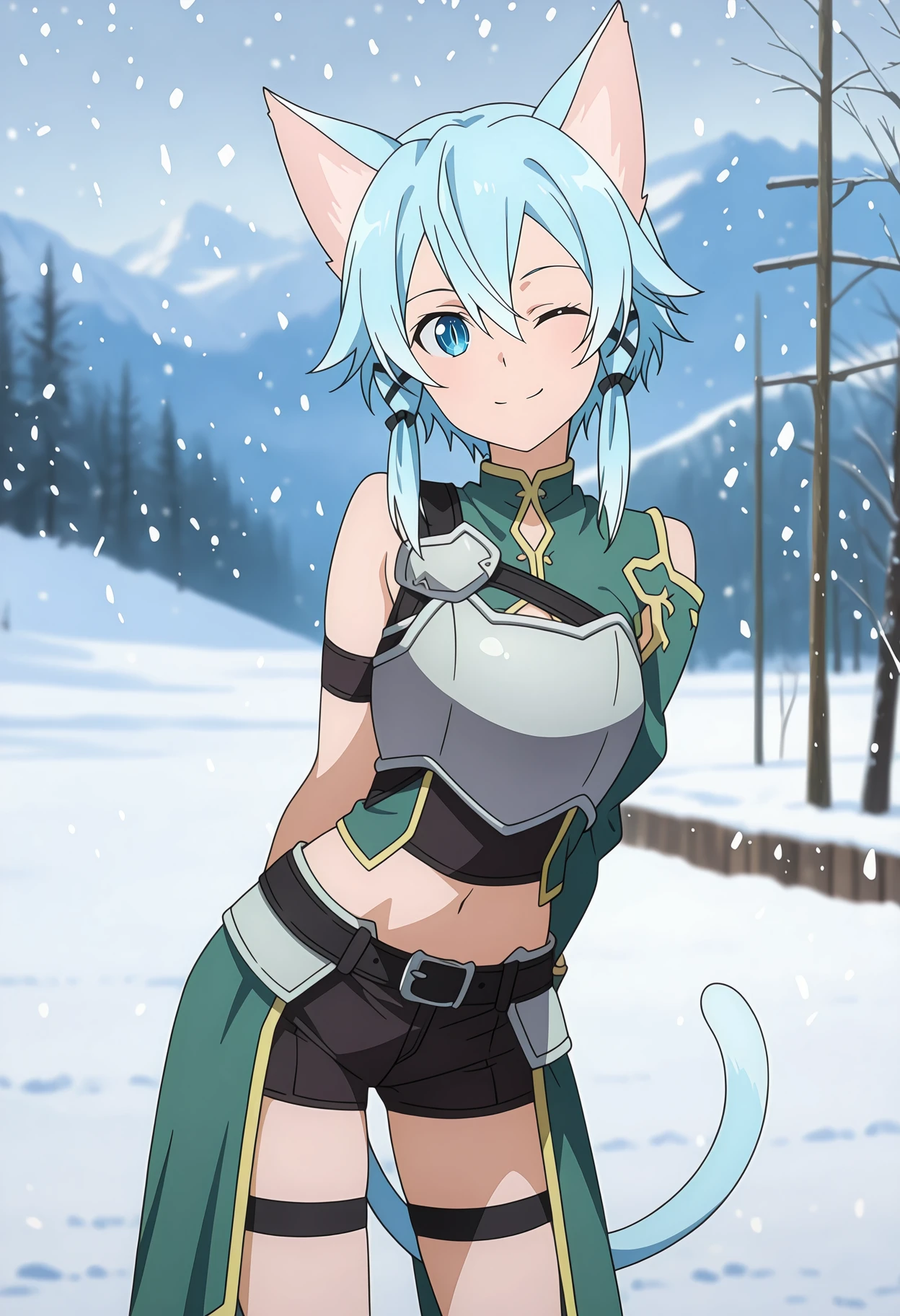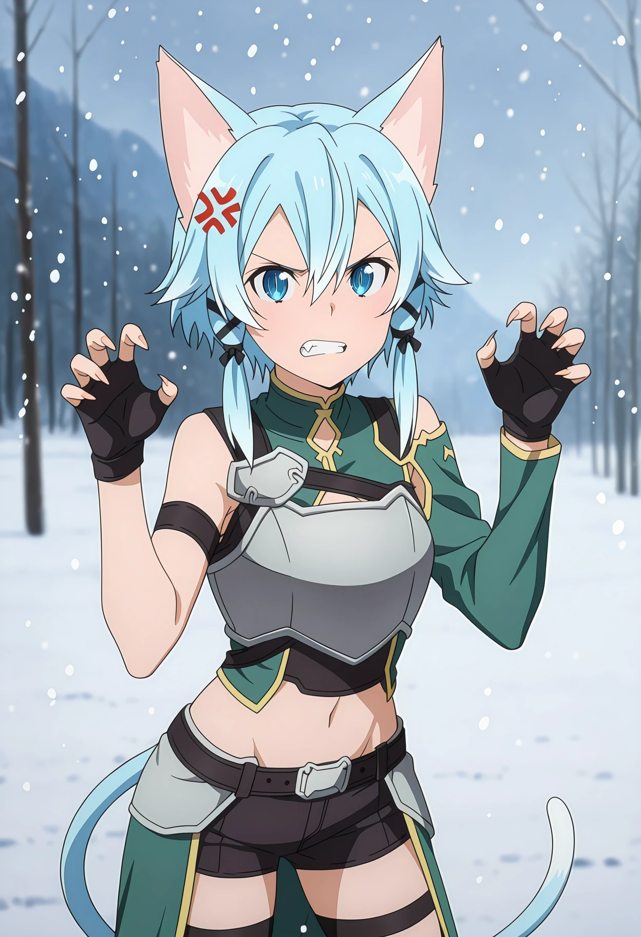 SinonALOFight, hair between eyes, short hair with long locks, light blue hair, blue eyes, slit pupils, tress ribbon, black ribbon, cat ears, cat tail, green shirt, breastplate, grey armor, single sleeve, arm strap, fingerless gloves, black gloves, midriff, black belt, waist cape, green cape, short shorts, black shorts, thigh strap