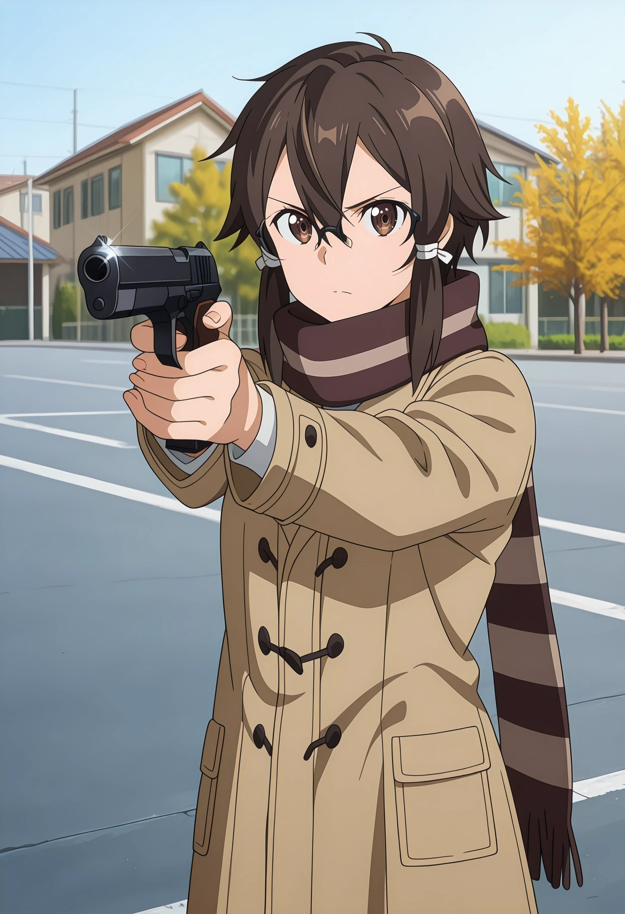 AsadaShino, hair between eyes, short hair with long locks, dark brown hair, brown eyes, hair tie, rimless eyewear, black-framed eyewear, light brown coat, striped scarf, brown scarf
