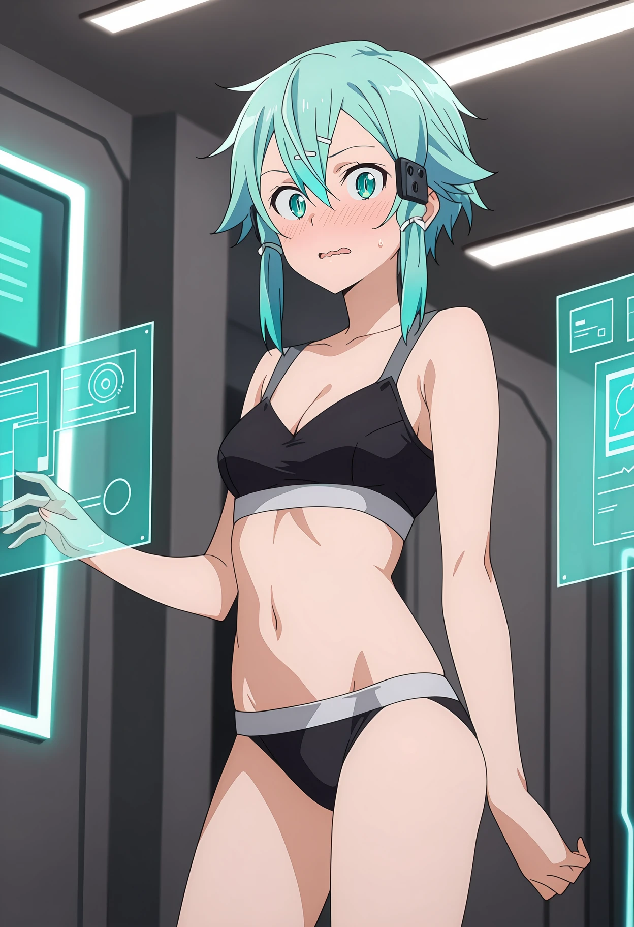 SinonBra, hair between eyes, short hair with long locks, aqua hair, aqua eyes, slit pupils, hair ornament, hairclip, black sports bra, cleavage, small breasts, black panties