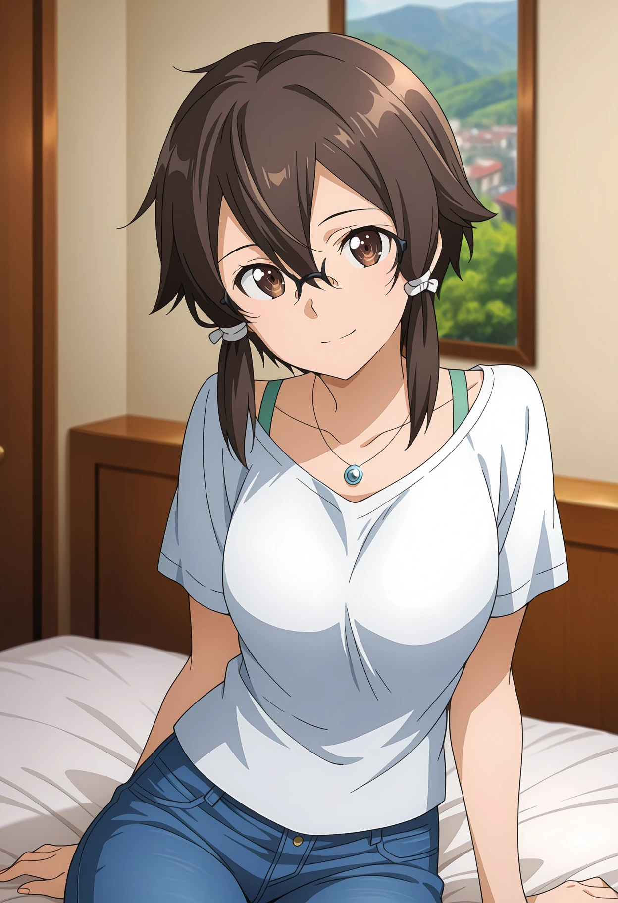 AsadaShino, hair between eyes, short hair with long locks, dark brown hair, brown eyes, hair tie, rimless eyewear, black-framed eyewear, collarbone, pendant, t-shirt, white shirt, bra strap, short sleeves, jeans