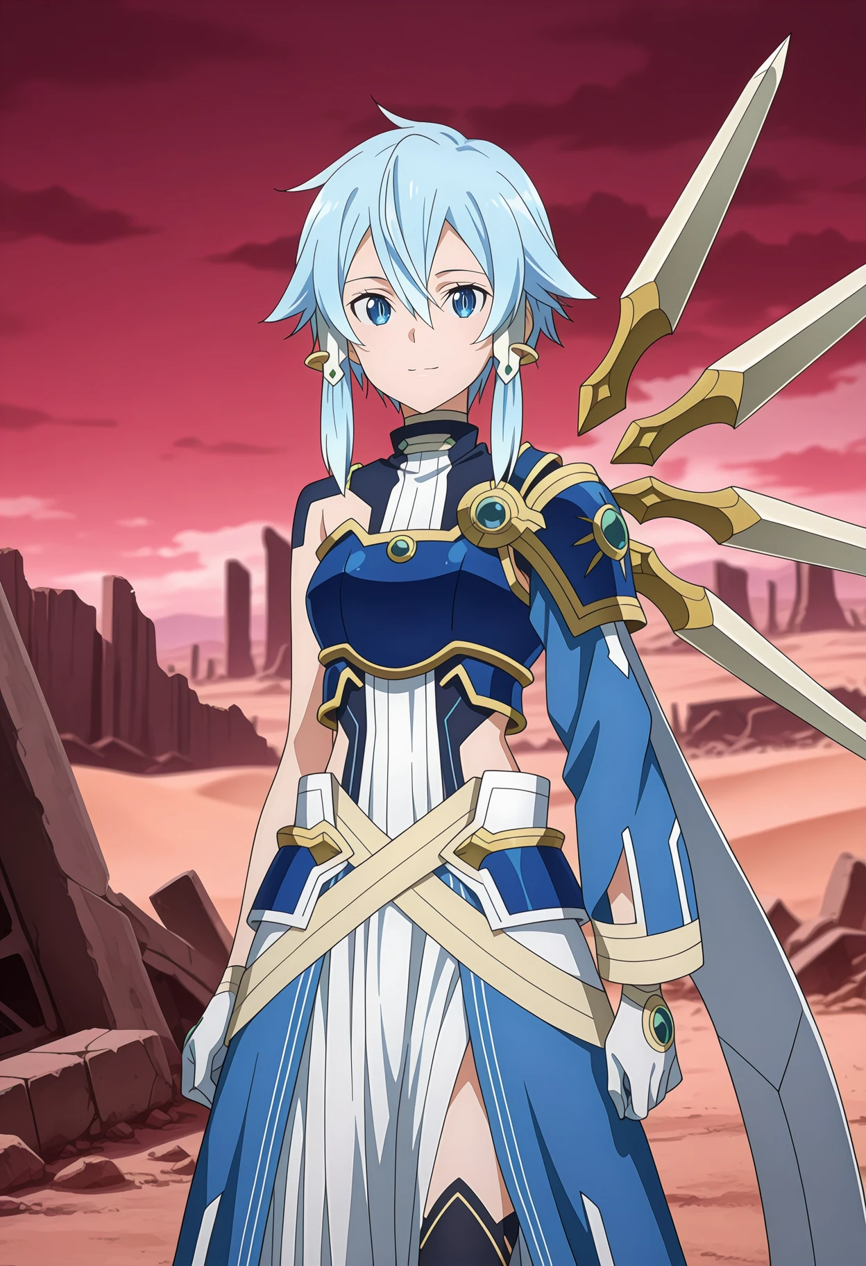 SinonSolus, hair between eyes, short hair with long locks, light blue hair, blue eyes, slit pupils, hair tubes, asymmetrical wings, mechanical wings, armored dress, blue dress, single pauldron, breastplate, asymmetrical sleeves, white gloves, long skirt, blue skirt, white skirt, black thighhighs