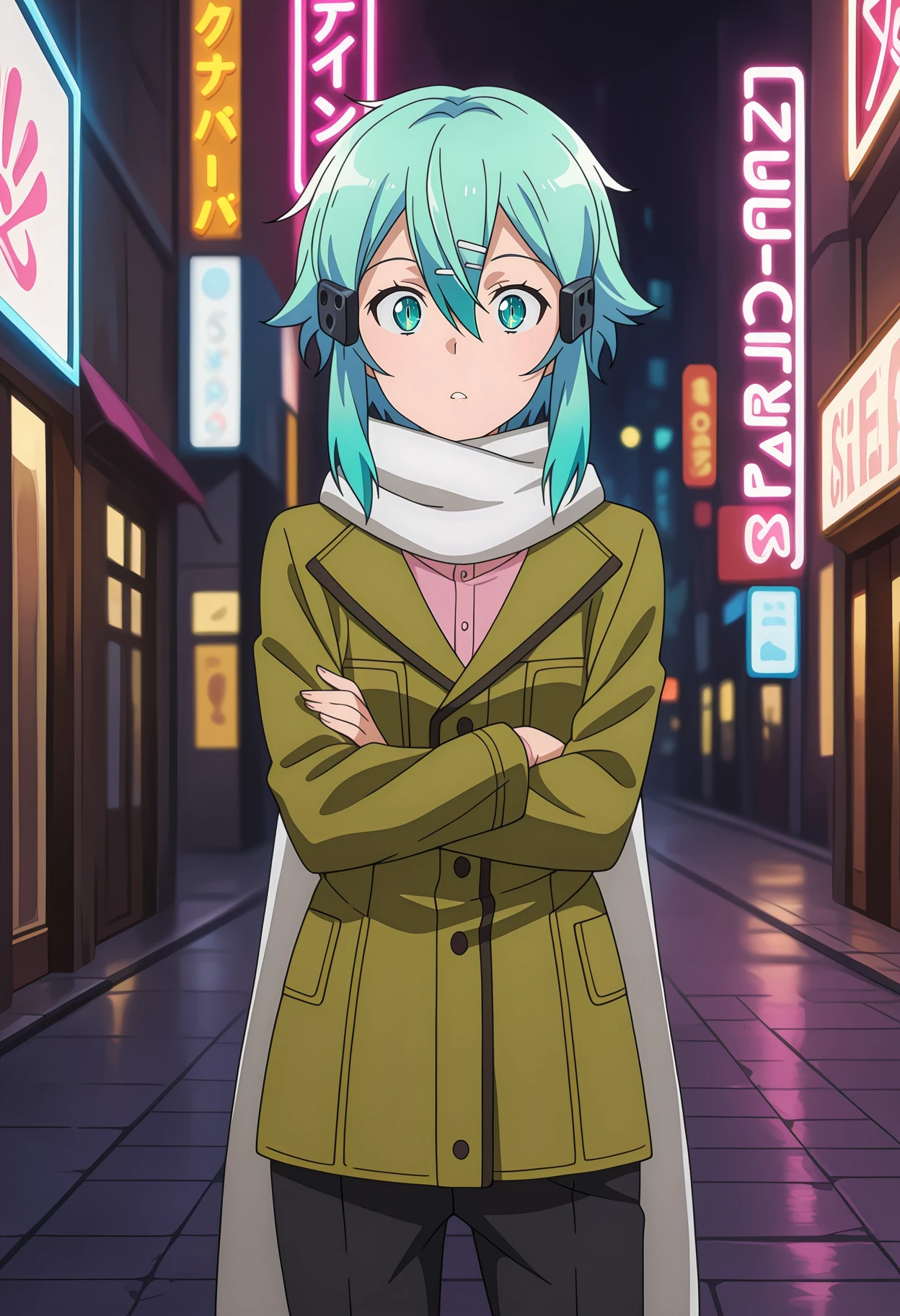 SinonGGOCasual, hair between eyes, short hair with long locks, aqua hair, aqua eyes, slit pupils, hair ornament, hairclip, white scarf, green coat, long sleeves, pink shirt, black pants