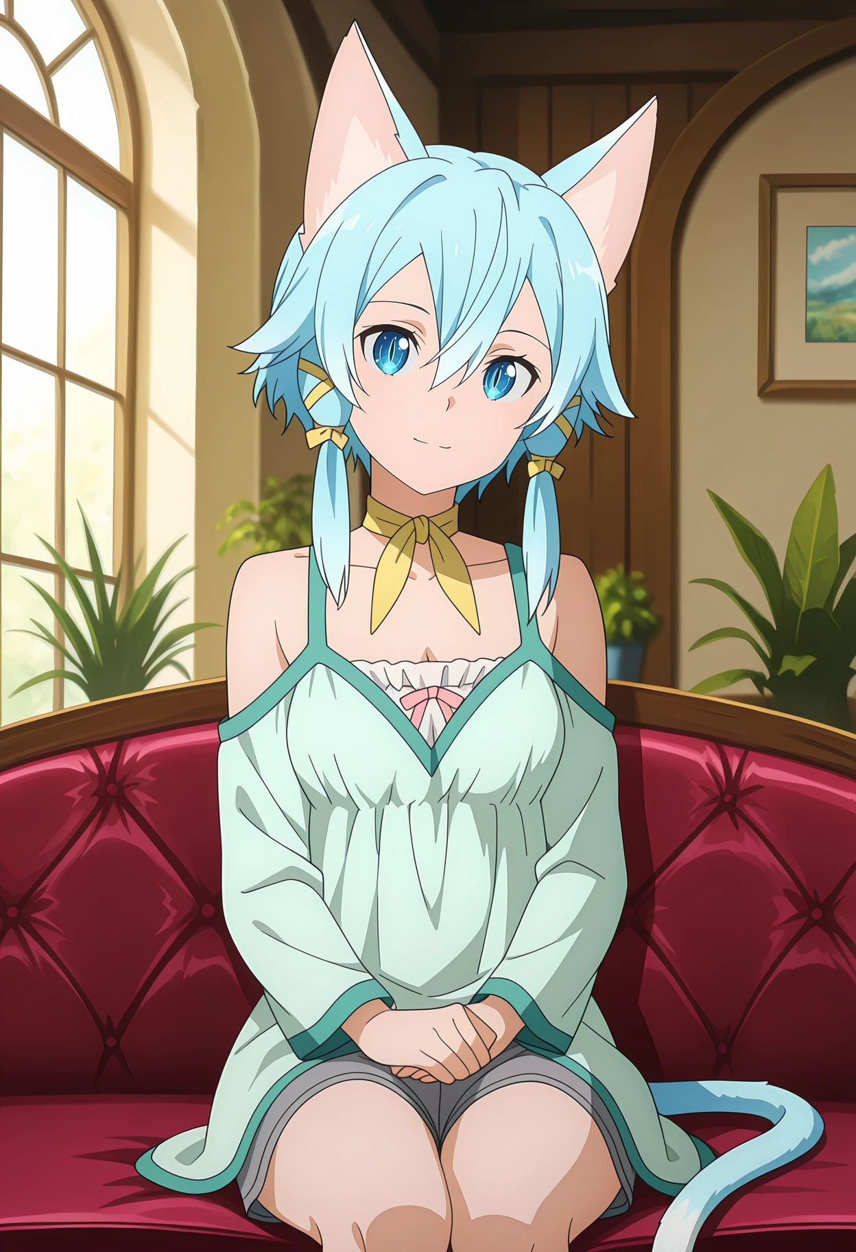 SinonALOCasual, hair between eyes, short hair with long locks, light blue hair, blue eyes, slit pupils, tress ribbon, yellow ribbon, cat ears, cat tail, ribbon choker, yellow choker, bare shoulders, collarbone, light green dress, pink ribbon, long sleeves, grey shorts