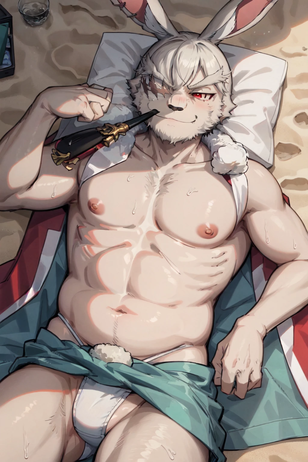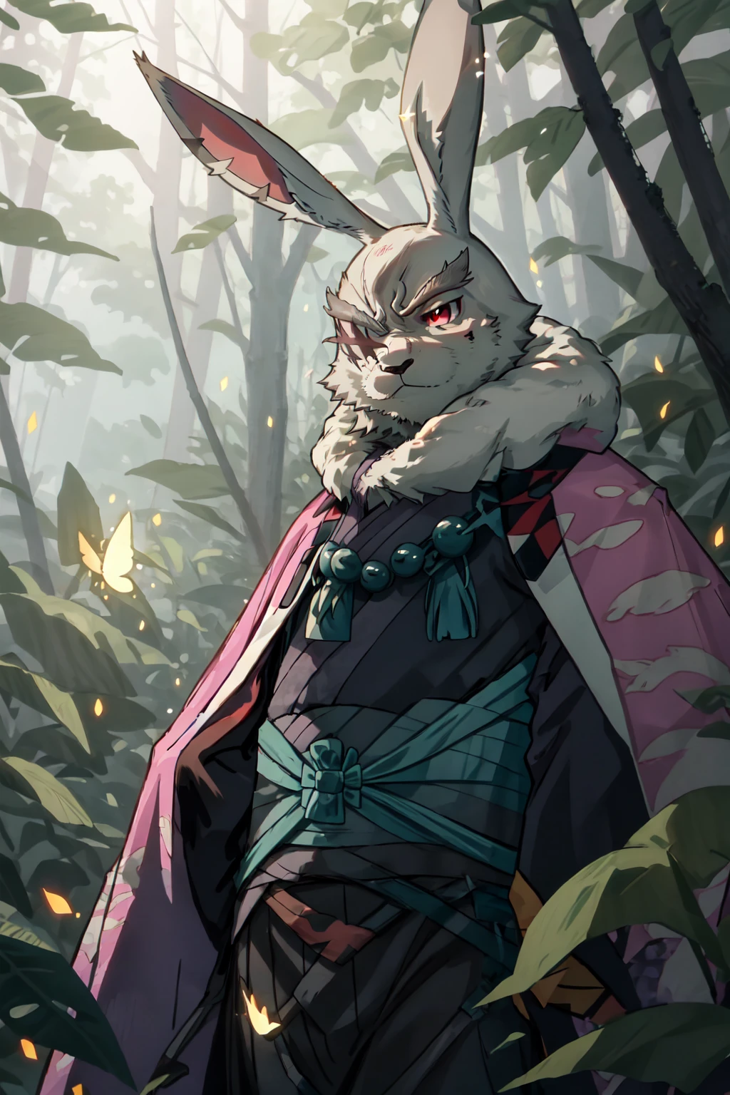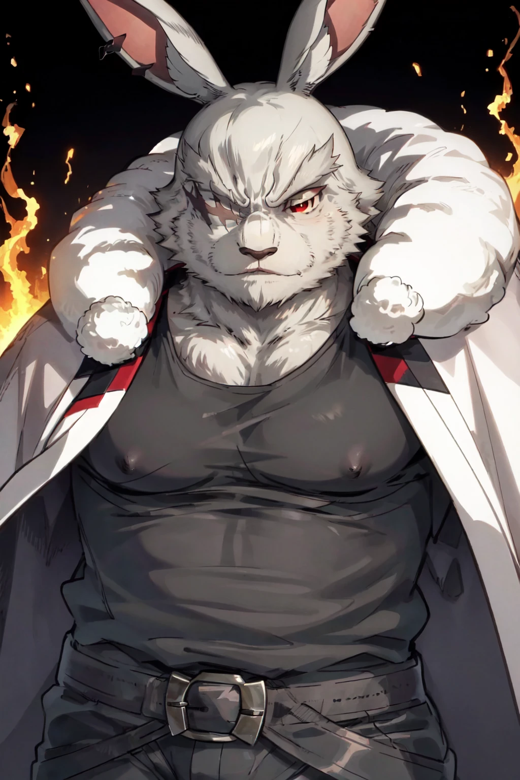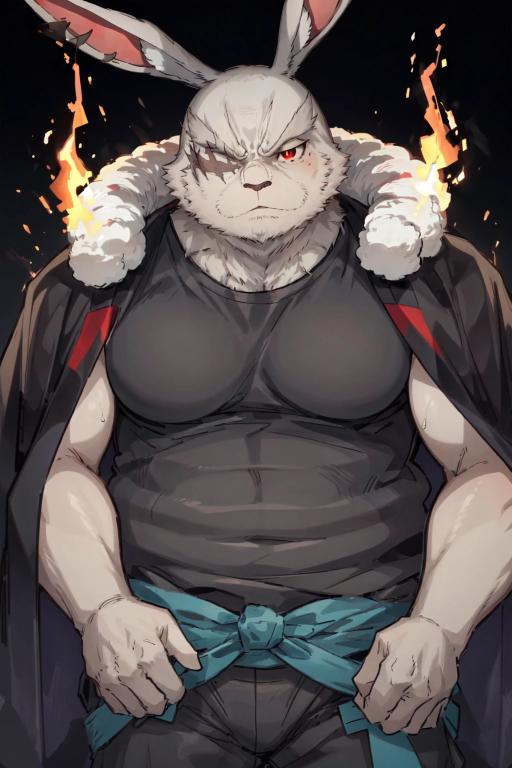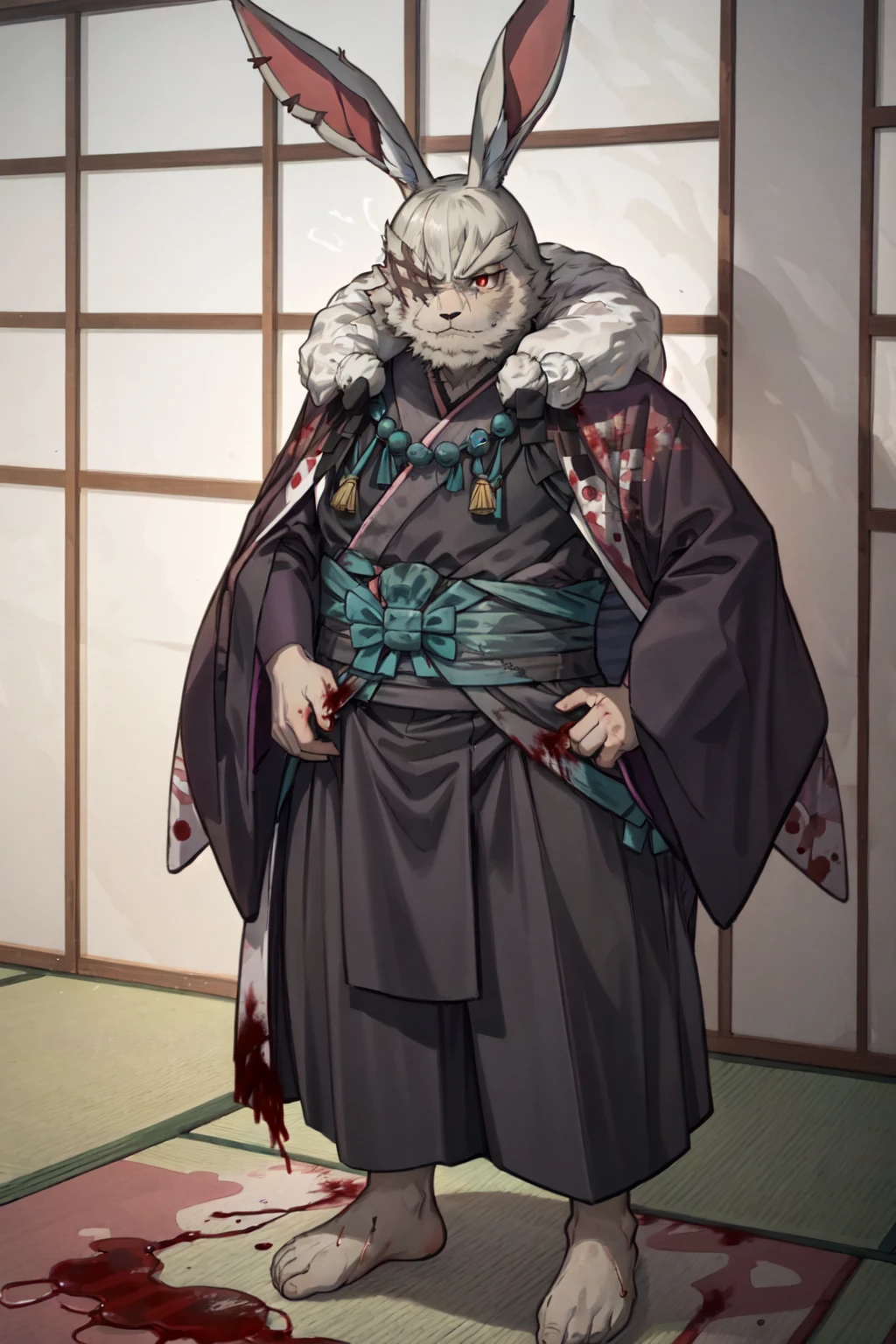 Prompts are : Vysache, furry, 1boy, rabbit boy, rabbit ears, animal nose, one-eyed, red eyes, white fur, fat, bald