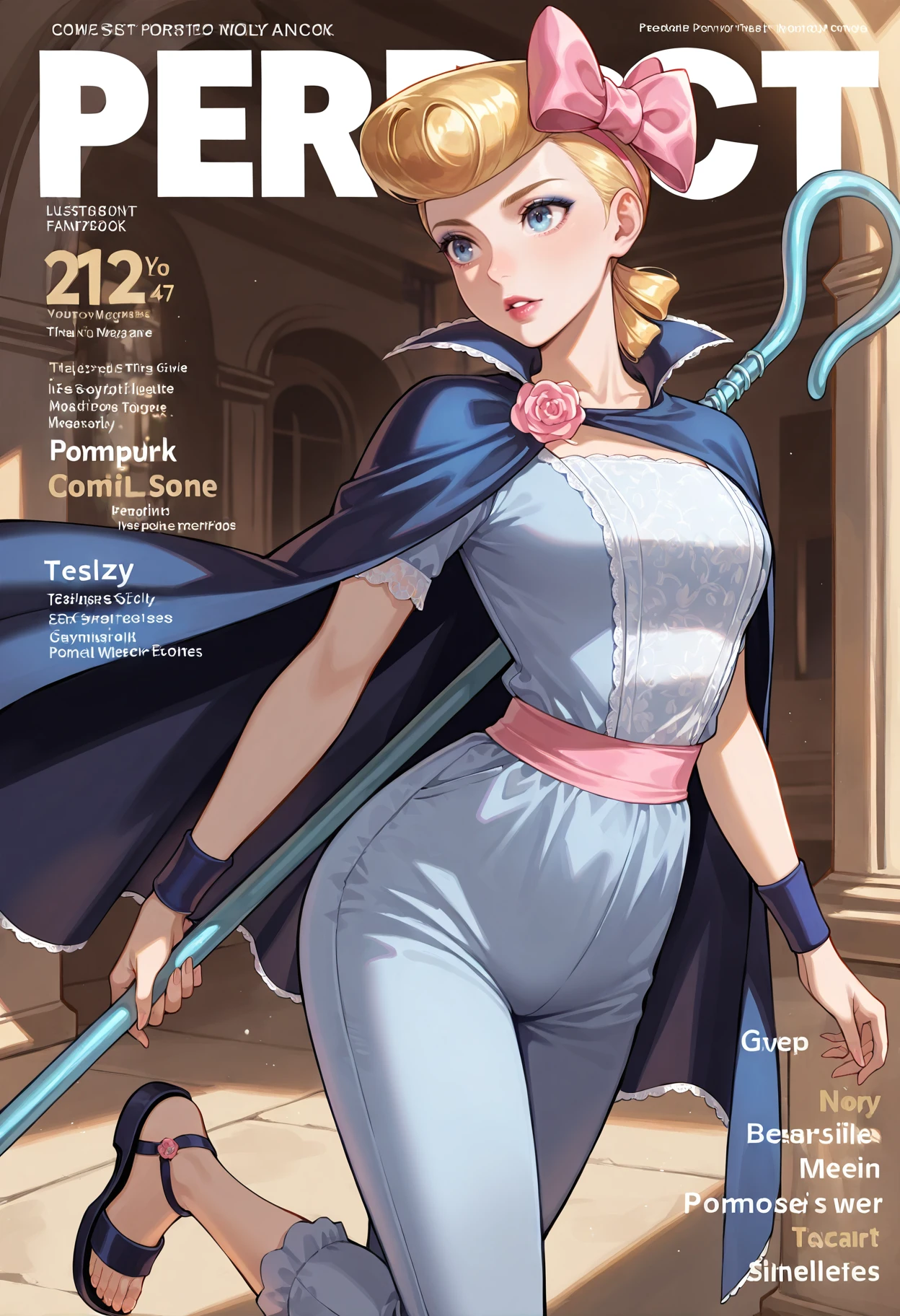 hair bow,ribbon,cape,bow,pink bow,pompadour,capri pants,pants,shoes,wristband,dress,blue cape,sandals,staff,holding staff