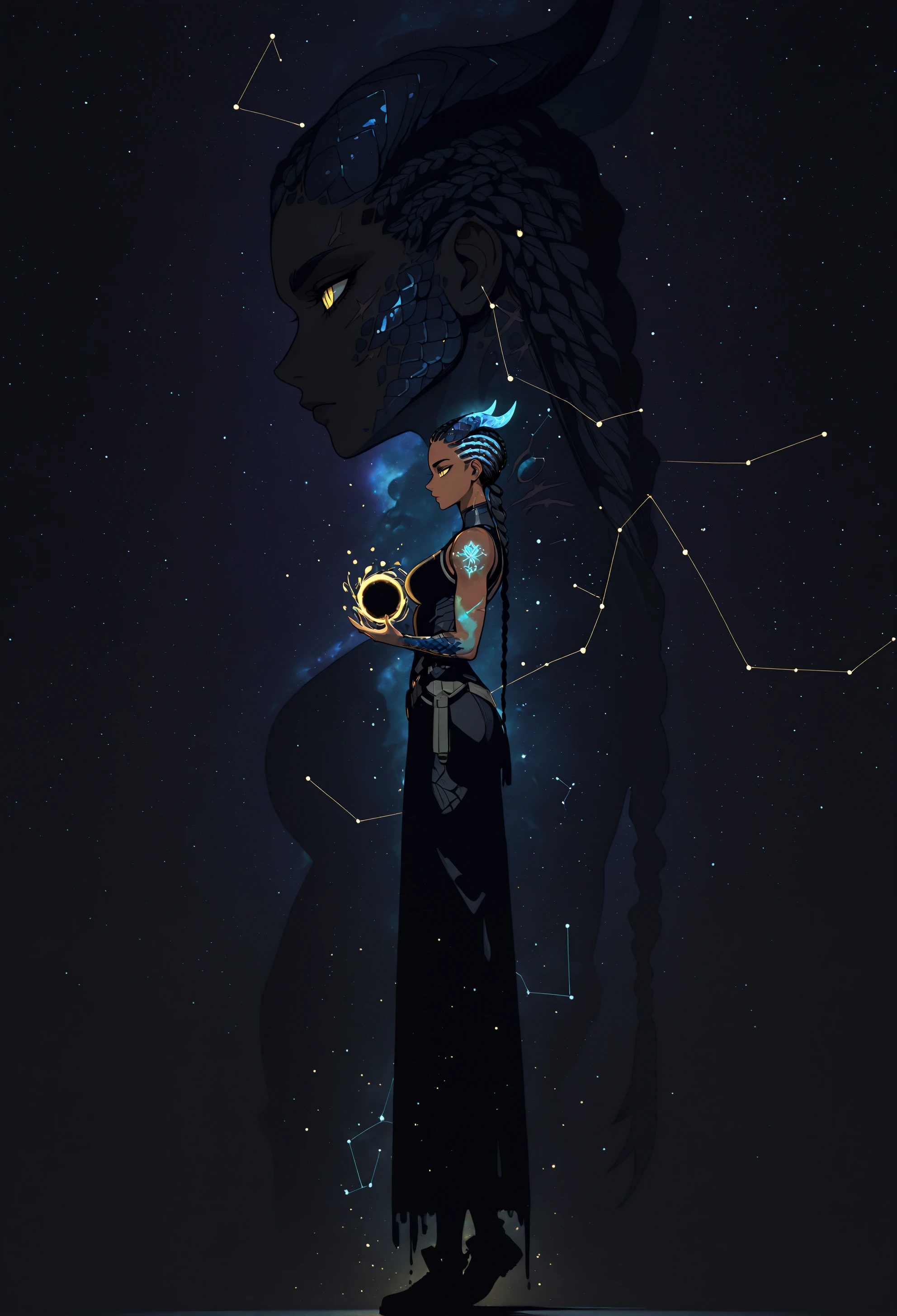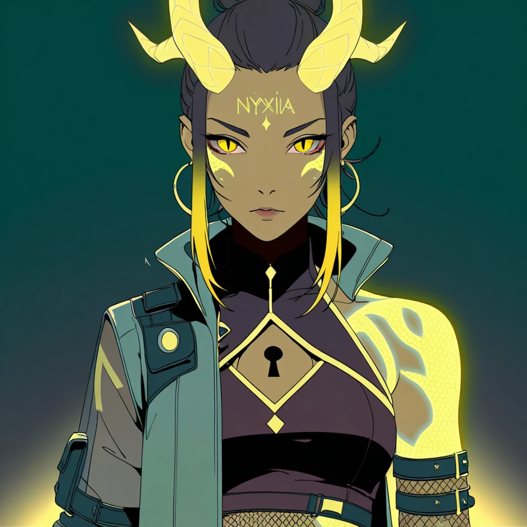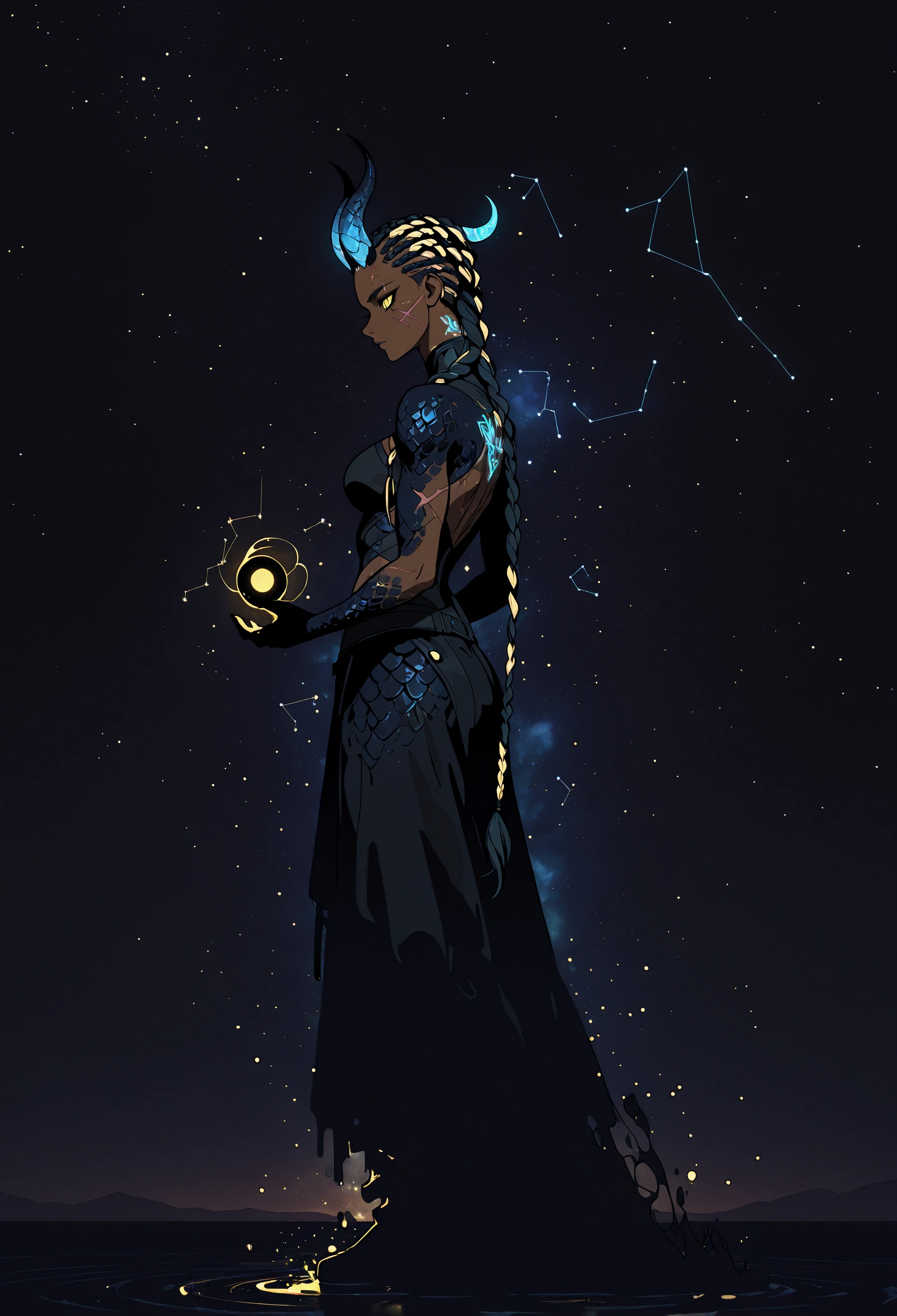 nyxia, dark skin, yellow eyes, slit pupils, braided hair, cornrows, single braid, two tone hair, blue horns, scar on cheek, glowing tattoo, cyan scales, scale skin