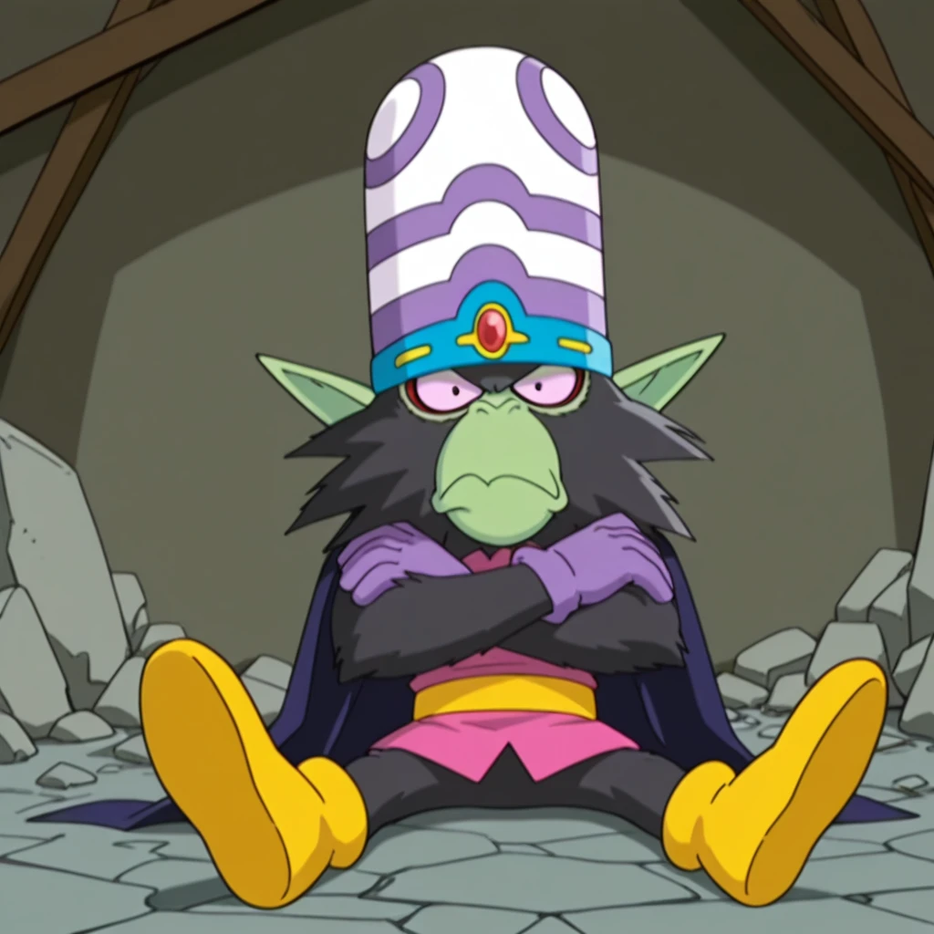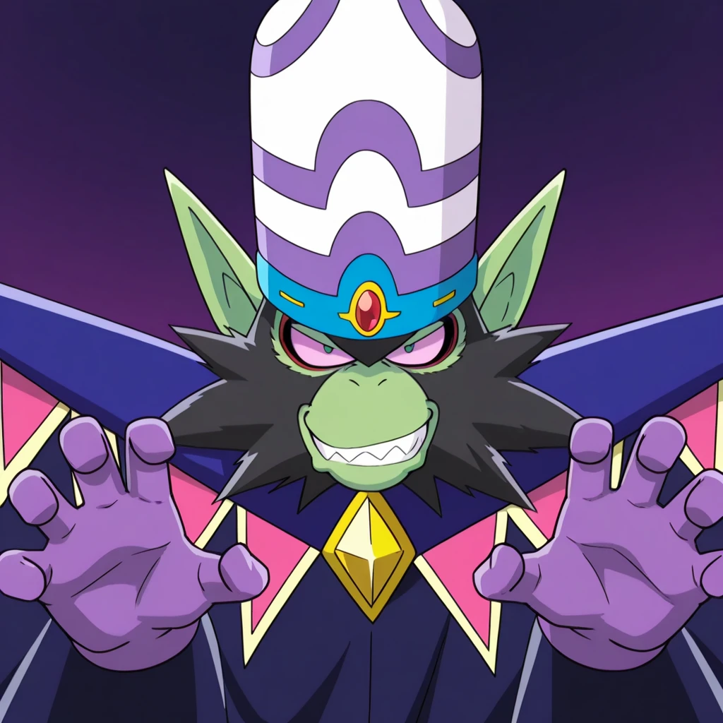 Tags (Short): ((Alt design)), 1boy, furry male, monkey, green skin, pointy ears, black fur, beard, facial hair, pink sclera, green eyes, cape, pink shirt, purple gloves, yellow belt, sleeveless, yellow shoes,