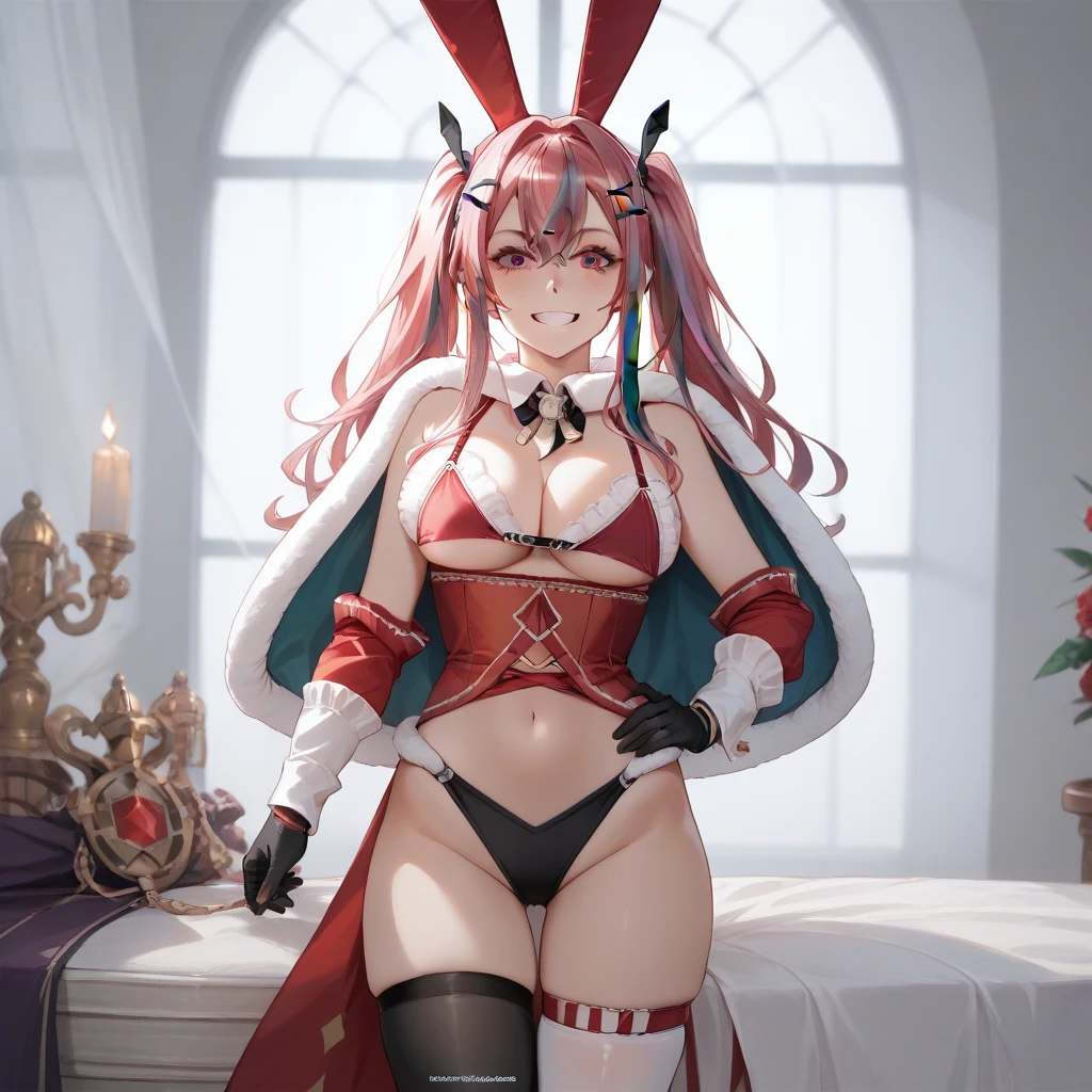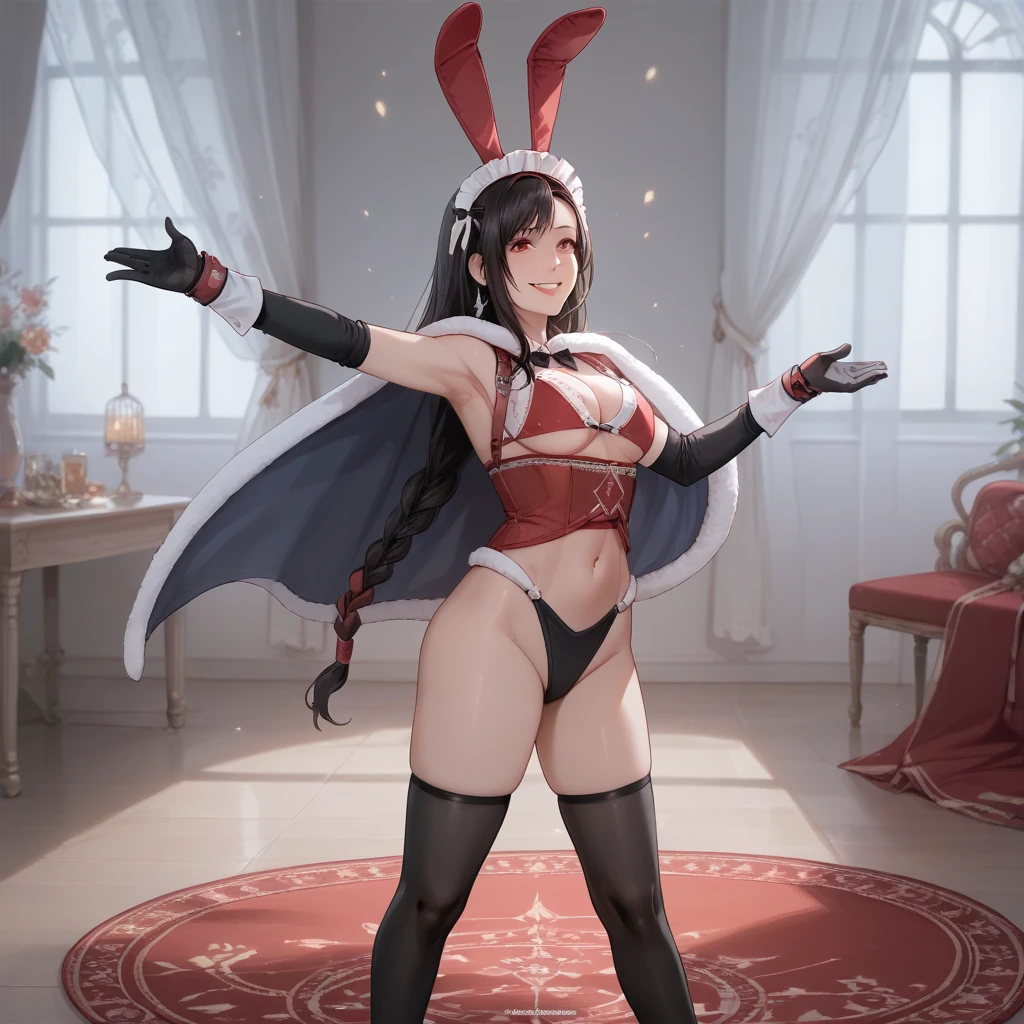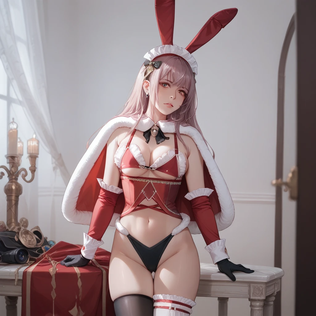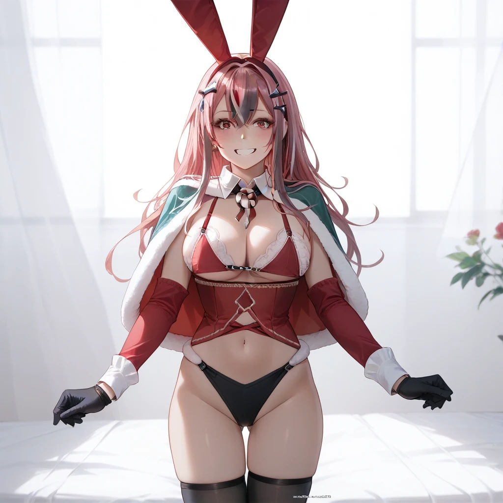 christbunny, cape, asymmetrical legwear, corset, red bra, black pantie, gloves