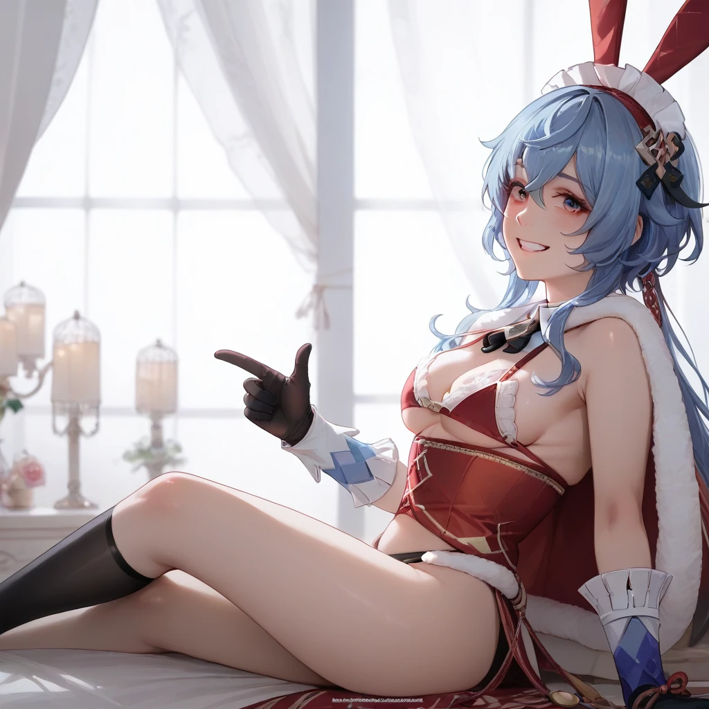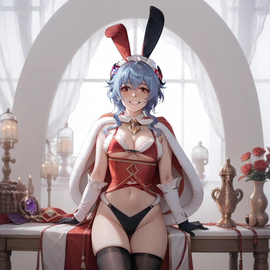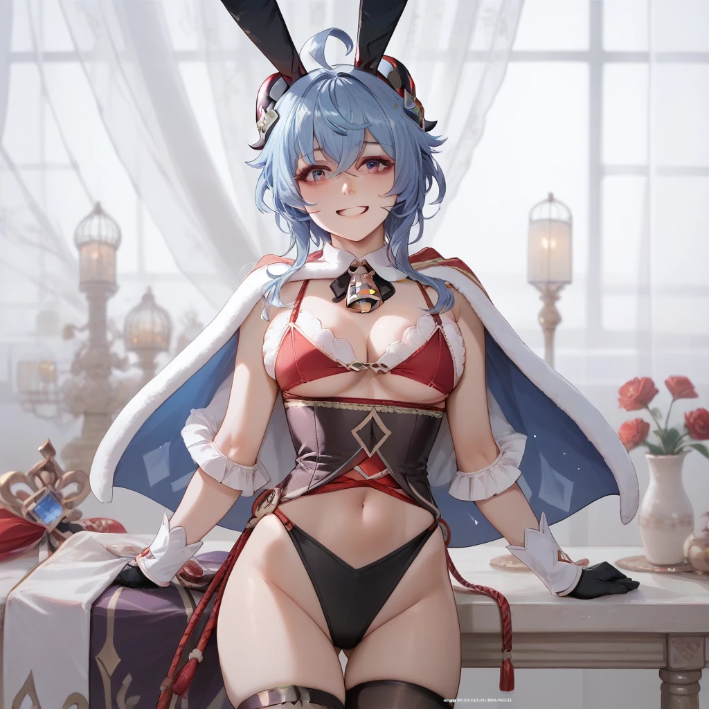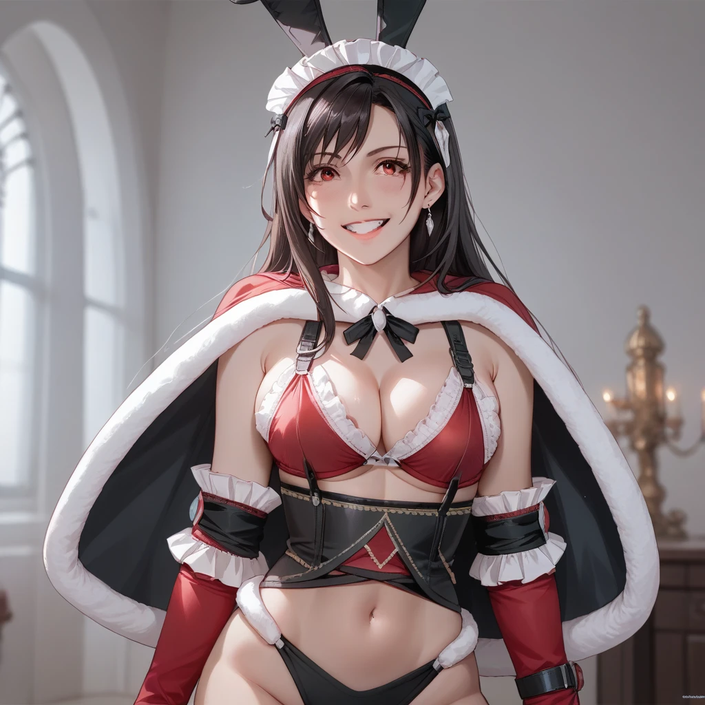 christbunny, cape, asymmetrical legwear, corset, red bra, black pantie, gloves