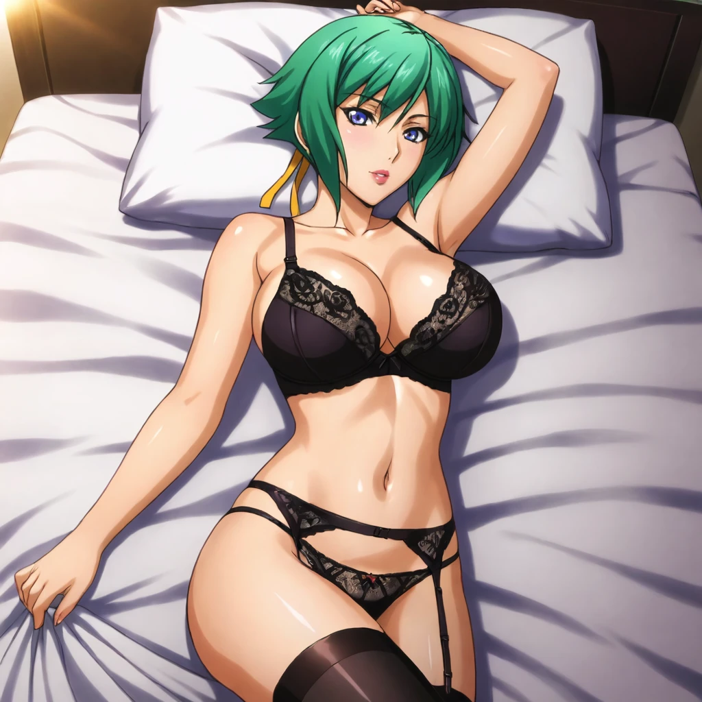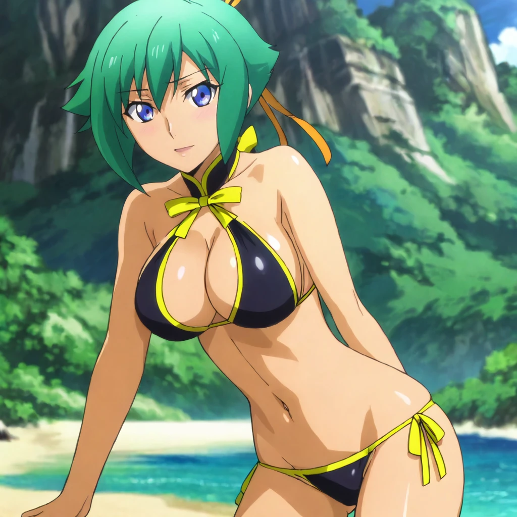 Trigger with bikini: ZessicaBikini, 1girl, swimsuit, side-tie bikini bottom, green hair, short hair, navel, large breasts, blue eyes, black bikini, hair ribbon, cowboy shot