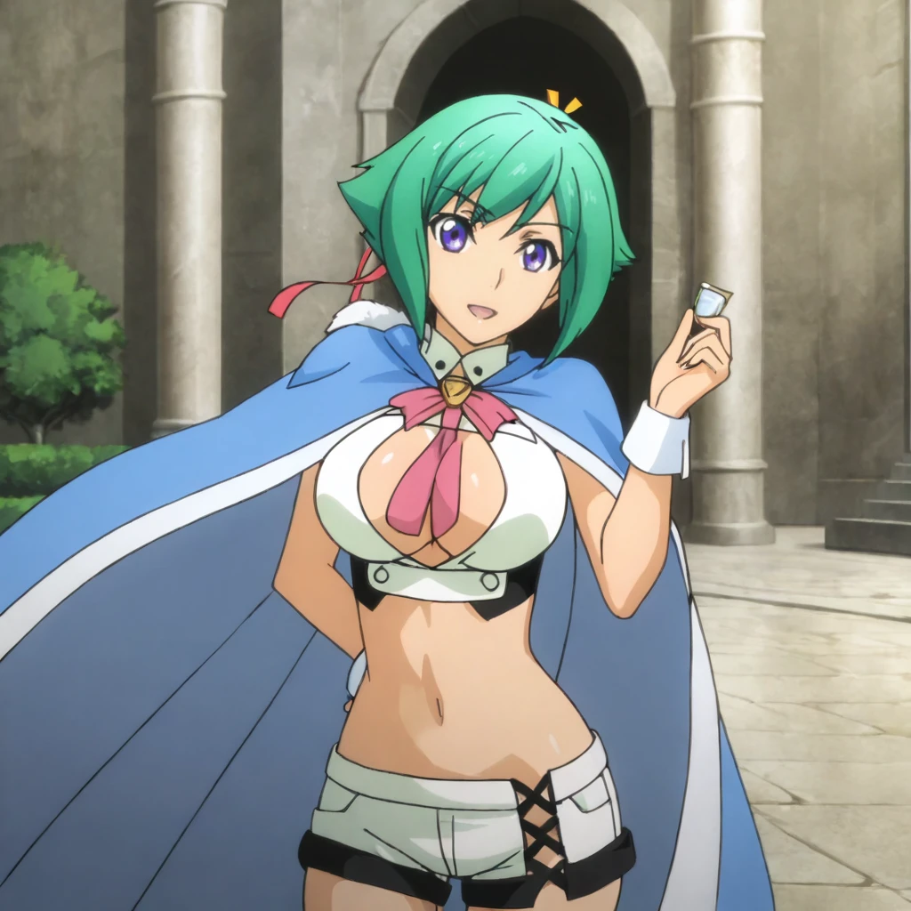 Trigger with robe and clothes: ZessicaRobeWithClothes, 1girl, short shorts, midriff, green hair, large breasts, purple eyes, cleavage cutout, clothing cutout, navel, short hair, white shorts, wrist cuffs, cape, ribbon, cowboy shot