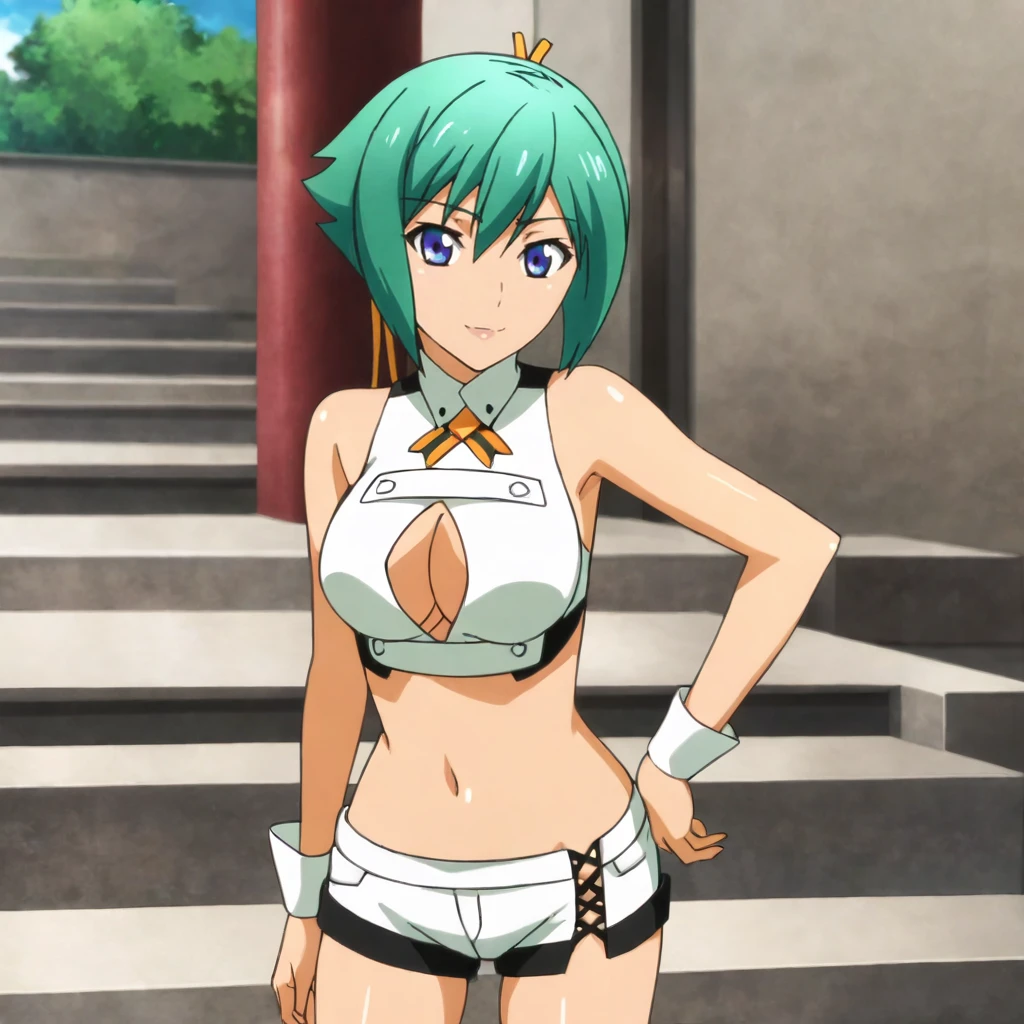 Trigger : Zessica, 1girl, cleavage cutout, clothing cutout, green hair, medium breasts, short shorts, short hair, navel, midriff, blue eyes, hair ribbon, wrist cuffs, bare shoulders, cowboy shot