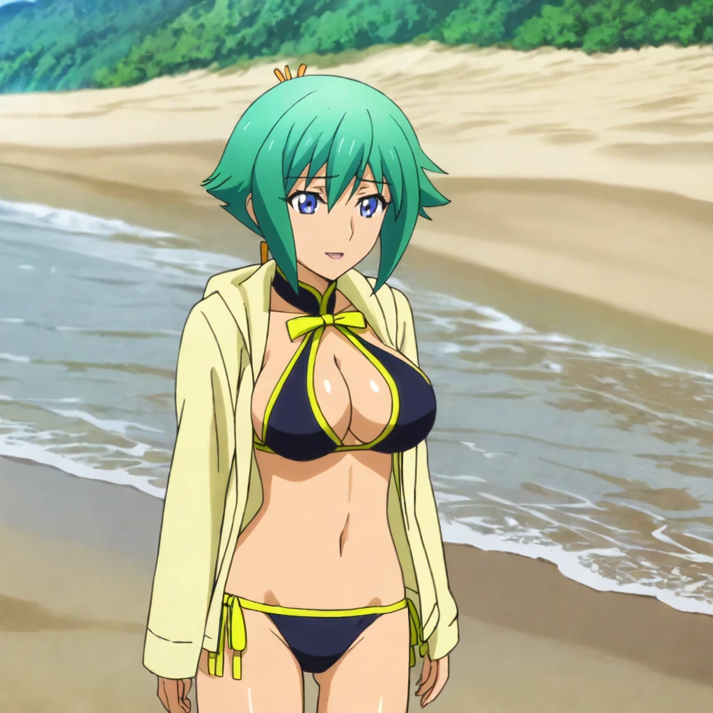 Trigger with bikini and coat: ZessicaBikini, 1girl, large breasts, green hair, short hair, cleavage cutout, swimsuit, bikini, clothing cutout, blue eyes, open clothes, cowboy shot